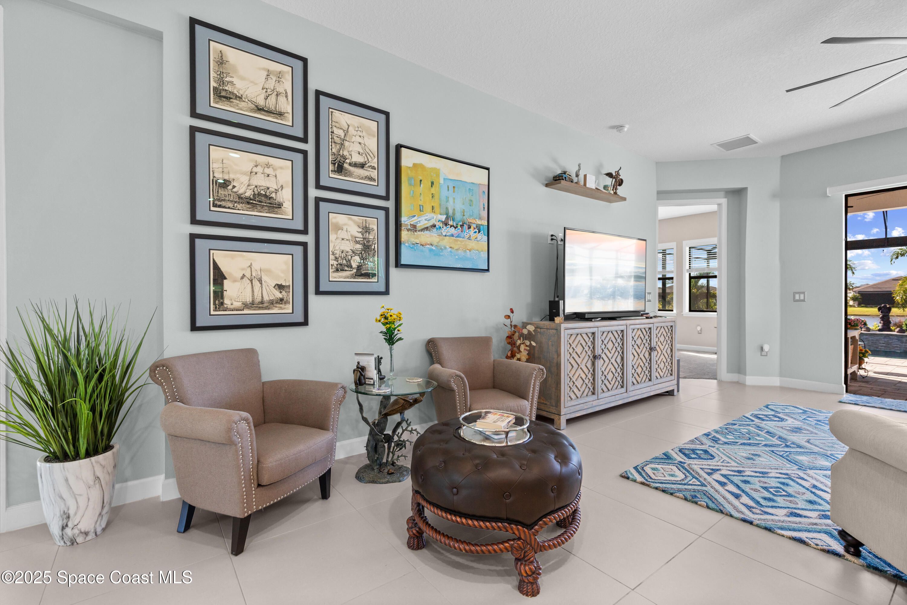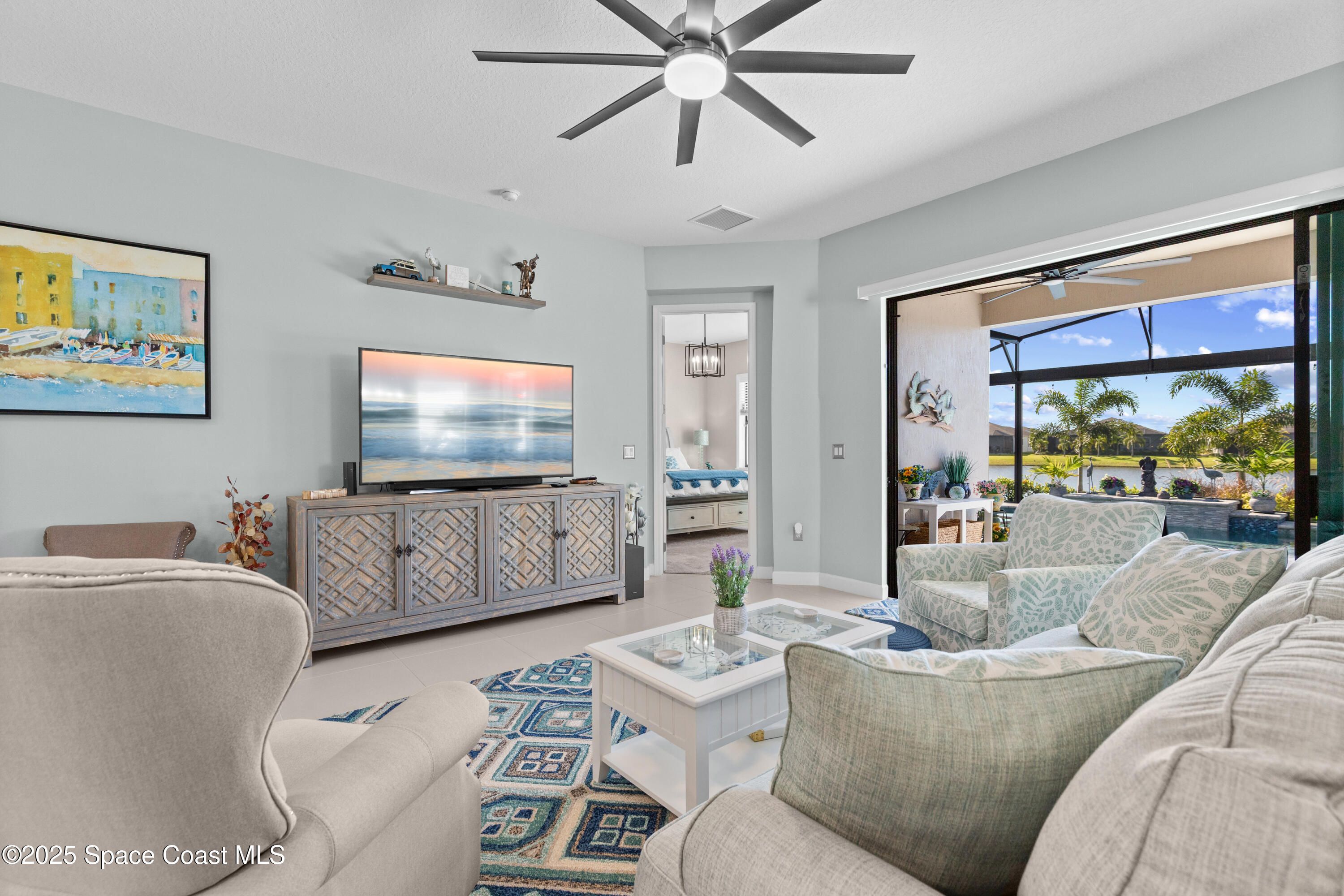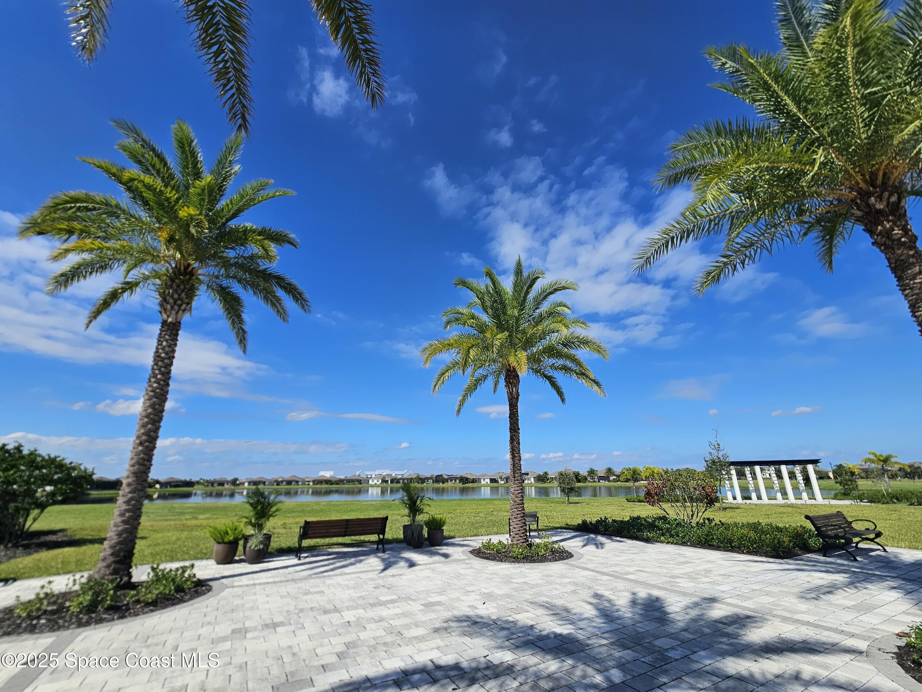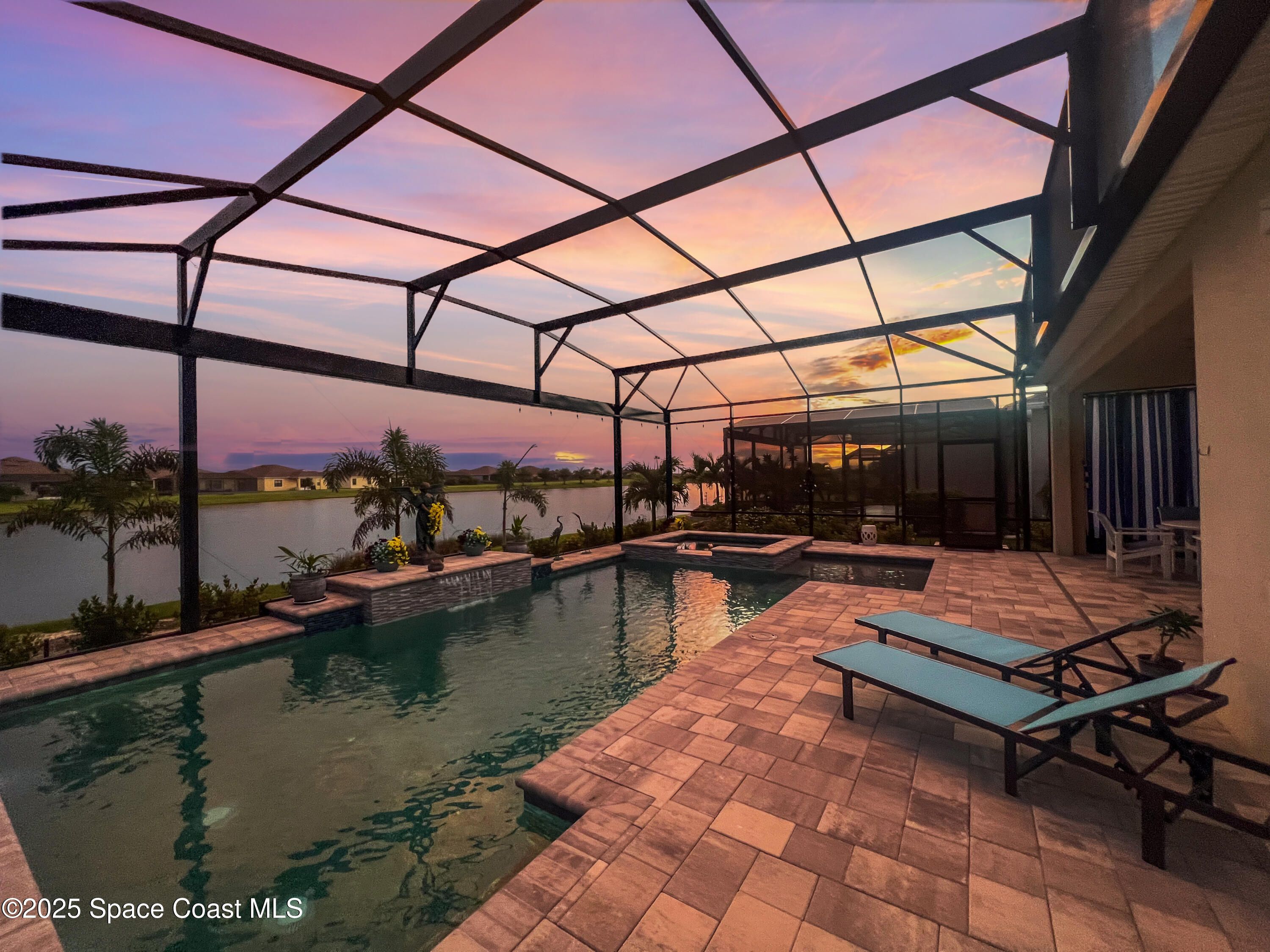 Discover luxury and tranquility at 2768 Millennium Circle, a stunning partially furnished lakefront retreat in Viera's premier 55+ Bridgewater community. This 2BR/2BA + bonus home (built 2020, upgraded 2024) showcases open-concept living, gorgeous sunset lake views, and a chef's kitchen with a brand-new refrigerator. 2024 enhancements include a screened saltwater pool with a paver deck, smart app controls, waterfall, jacuzzi, and heating system; all-new professional tropical landscaping; interior and exterior paint and lighting; irrigation system; and epoxy-coated garage floor. The designer primary suite features an upgraded fully tiled shower and custom walk-in closet. Stylish upgrades and partial furnishings make this home truly turnkey. Bridgewater residents enjoy resort-style living with pickleball, tennis, clubhouse, fitness center, theater, and a sparkling resort style community pool.