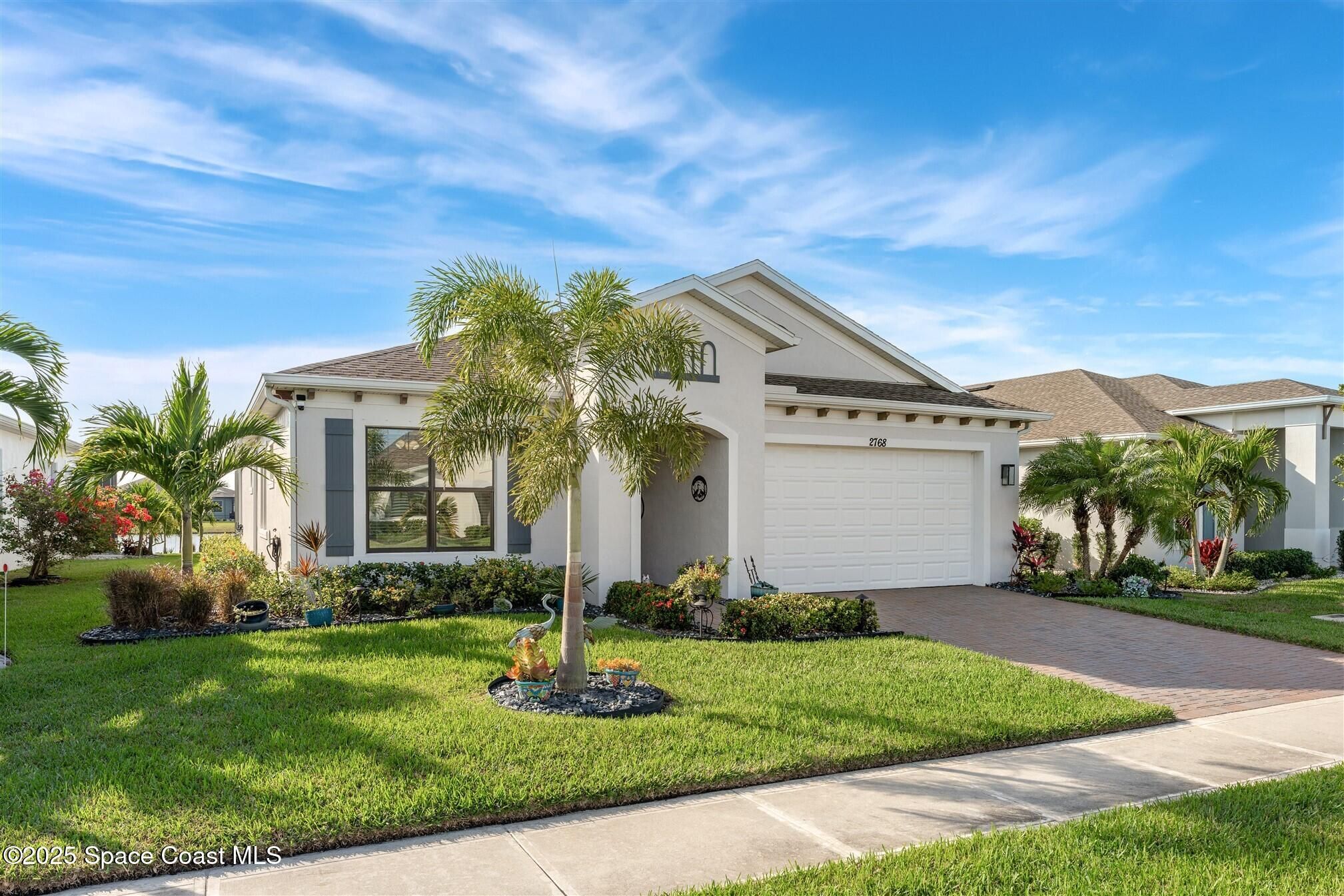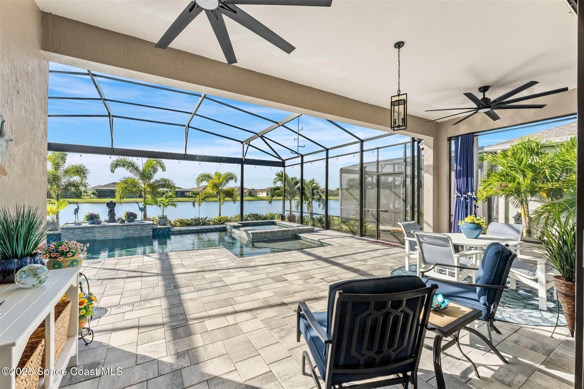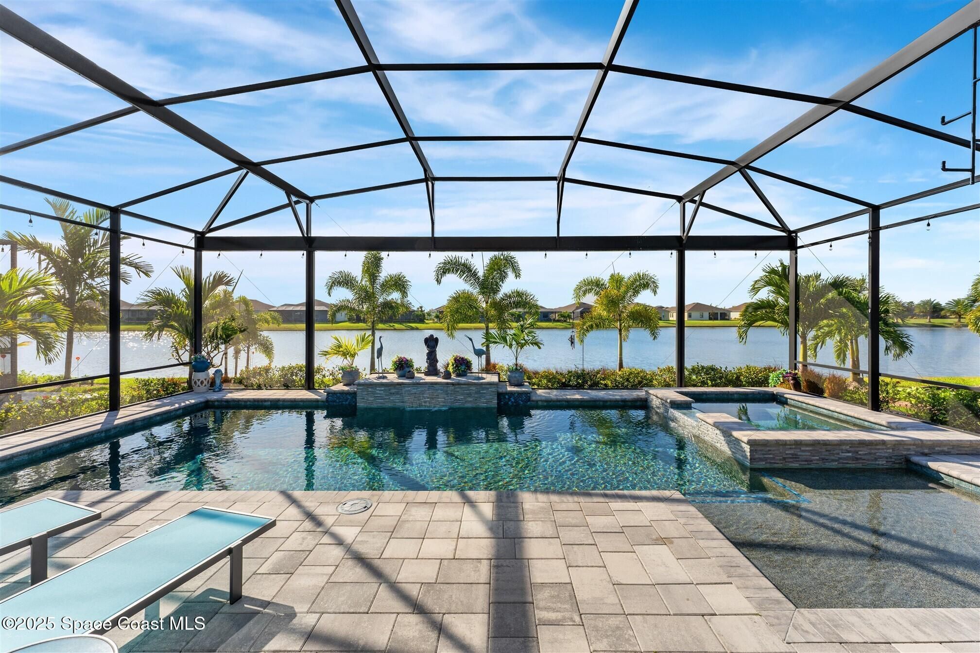 Out of the pages of a decorator magazine, this stunning pool home in Bridgewater, Viera's resort like 55+ community, has added features that will amaze you. Bask in the luxurious screened-in heated saltwater pool and spa (2024) overlooking the lake. Entertain in the elegant kitchen w/ upgraded cabinets w/soft close door/drawers, microwave/convection wall ovens and cooktop, designer backsplash and wine/coffee bar. Upgraded lighting featuring pendant lights, above and below cabinet lighting and custom light fixtures. Luxuriate in the stunning primary bath w/new barn door entry and remodeled tile shower! Primary walk-in complete w/built-ins and heated towel bar! Added professional landscaping and palm trees, lighting, stone beds, and exterior and interior were painted in 2024. Features include 8' doors, marble window-sills, LED lighting, garage with epoxy floor. Bridgewater's private clubhouse includes a heated pool, tennis & pickleball courts, a movie theater, fitness room, billiards!