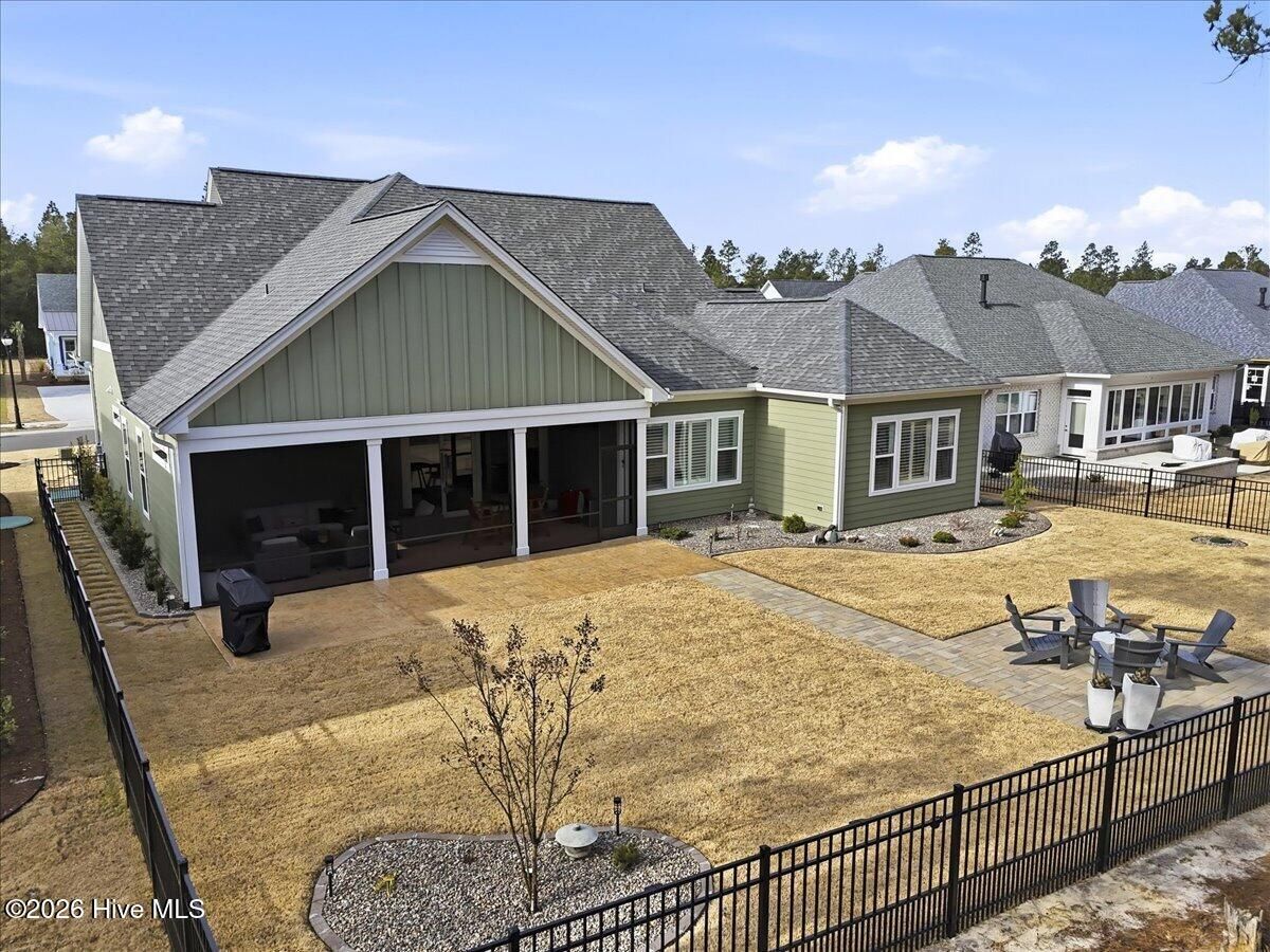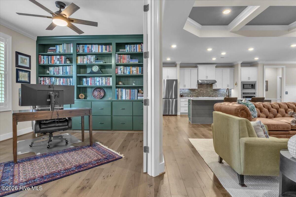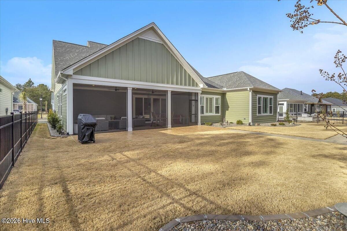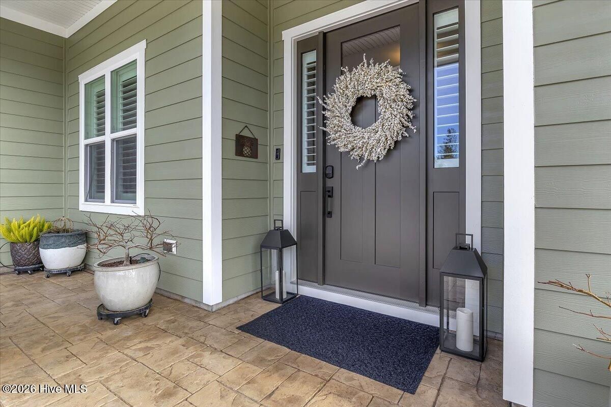 Located on a quiet nature preserve homesite in Compass Pointe, this beautifully crafted 2025 Kent Homes residence offers exceptional privacy, thoughtful design, and effortless one-level living. The appealing elevation features a covered front porch and a highly desirable 2.5-car front-inside entry garage, blending curb appeal with everyday functionality. Inside, the open-concept layout spans 2,266 square feet and is designed for comfort and flow. The welcoming foyer opens to a forward-facing private office with French doors, leading into the living room, expansive kitchen, and dining area—ideal for both entertaining and daily living. A split floor plan provides privacy for guests and owners alike. The spacious primary suite features a walk-in closet with custom built-ins and a spa-inspired bath with dual vanities, freestanding soaking tub, tiled walk-in shower, water closet, and custom slide-out storage. The laundry room is conveniently located just off the primary suite. Two additional bedrooms, a tiled walk-in guest shower, powder room, and abundant floored storage—including an unfinished bonus room—add to the home's exceptional livability. Interior highlights include LVP flooring throughout (no carpet), quartz countertops, an oversized island, custom soft-close cabinetry, stainless steel appliances, Zephyr hood, 5-burner range, coffered ceilings, crown molding, pocket doors, and plantation blinds. Outdoor living shines with an oversized screened porch and stamped concrete patio overlooking the preserve, offering a peaceful backdrop for entertaining or quiet evenings. A black aluminum fenced yard with dog-friendly screening and a paver walkway leading to a private firepit patio complete the setting. Compass Pointe residents enjoy resort-style amenities including the Grand Lanai Amenity Center, pools, lazy river, fitness center, tennis and pickleball courts, on-site dining, scenic trails, and access to the Rick Robbins Championship 18-hole golf course (memberships available). Gated and conveniently located near shopping, medical facilities, golf, historic downtown Wilmington (15 minutes), and Wrightsville Beach (30 minutes), this home captures the essence of luxury coastal livingwhere every day feels like a getaway.