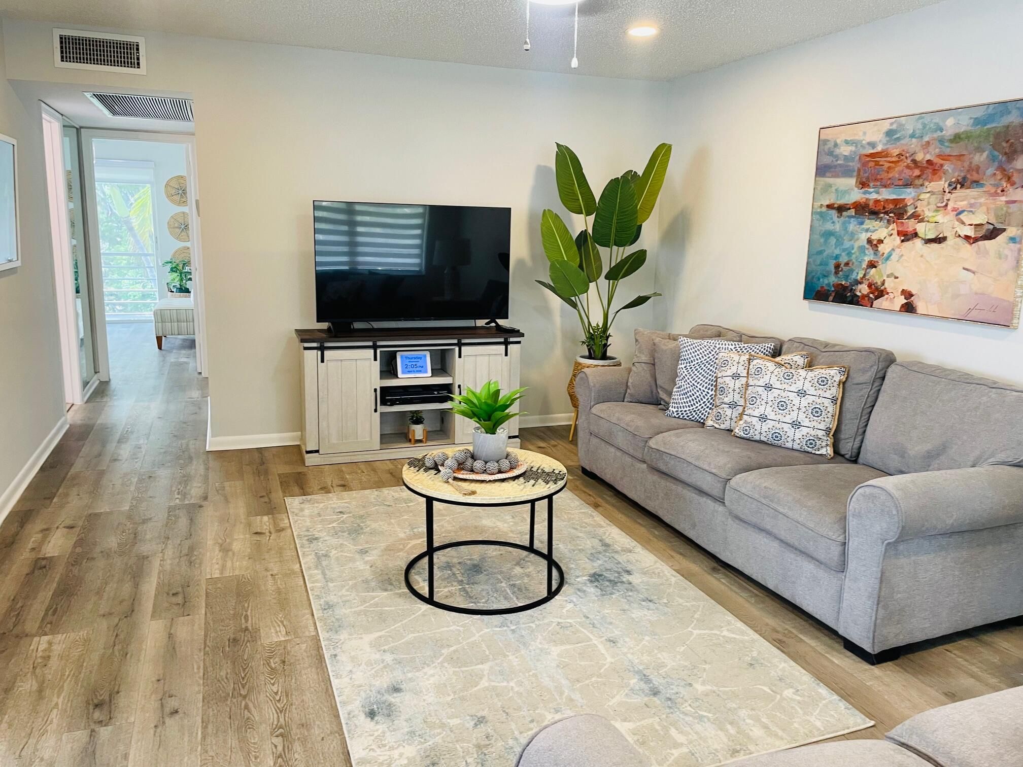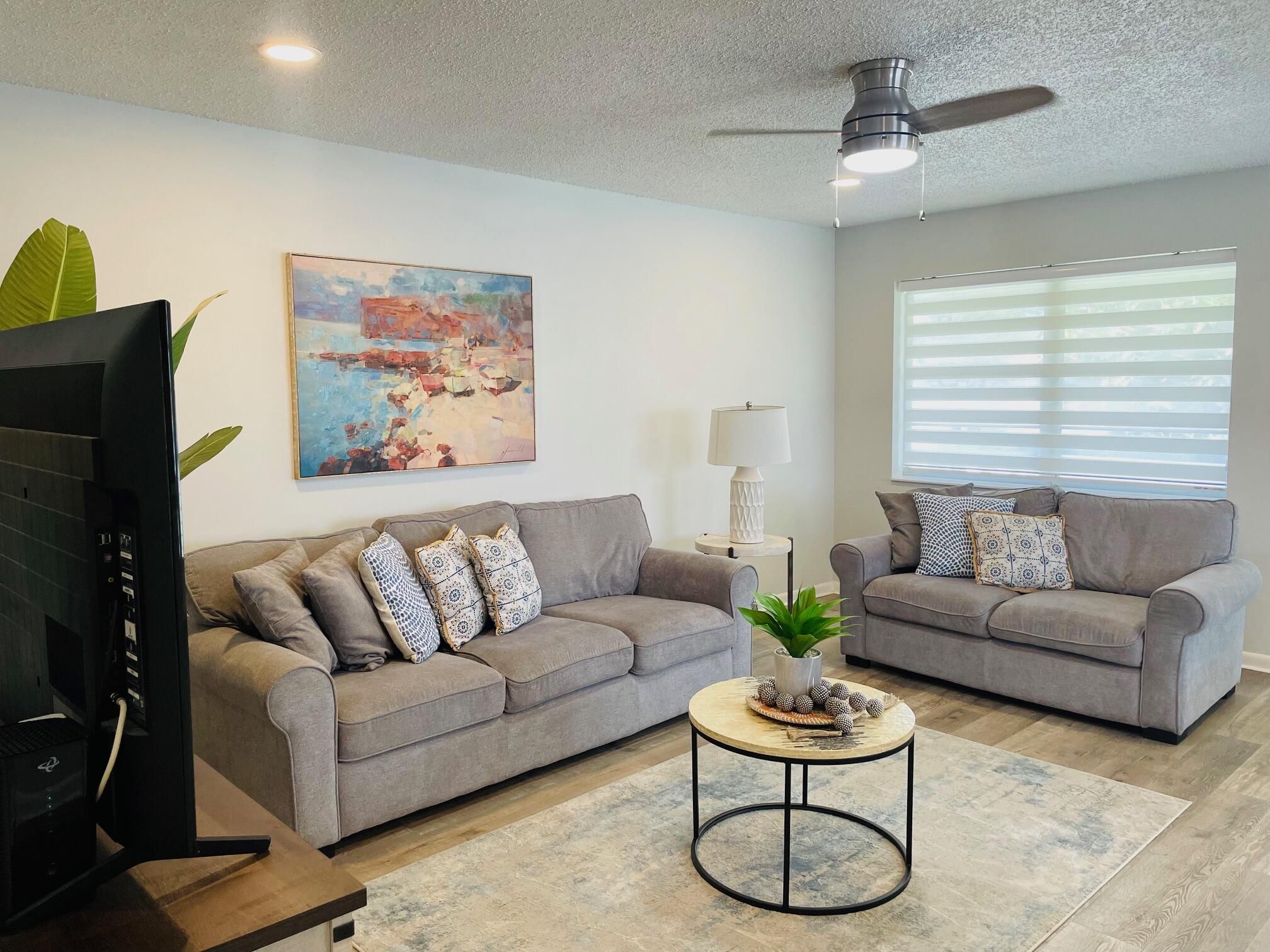 Recently upgraded 2nd floor corner property in the desirable Century Village 55+ community. Partially furnished. Quartz countertops in the kitchen , stainless appliances, walk-in master closet. This 2BR/1.5 BA is 798 sqft plus the balcony. HOA covers cable, insurance, pools, fitness, clubhouse, courtesy bus, and manned security. 55+ HOPA verified. Century Village West Palm Beach. The property is being sold partially furnished: 1)The set of 2 sofas in the living room. 2) The dining room set. 3) TV with the stand.