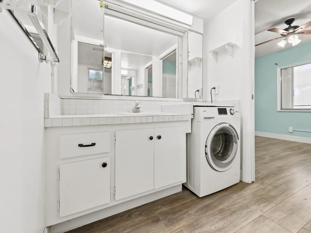 This charming 1st floor corner unit offers water views, complete privacy, & updated features. It boasts new laminate flooring, a redone kitchen with a tiled backsplash & deep double sink, plus a renovated bathroom with tiled walls. The front bedroom includes a walk-in closet, & the back bedroom has a large closet. The spacious living & dining areas are separate, & there's a large tiled patio with total privacy & access to the backyard. The unit also includes a washer/dryer combo & storage closet with a new water heater. The HOA covers lawn, water, cable, internet, trash, & shuttle service to local shops, the casino, & the beach. The community offers a gym, two pools, & many activities for residents. Seller to help with closing costs. Unit is available for rent if needed $1600/month.