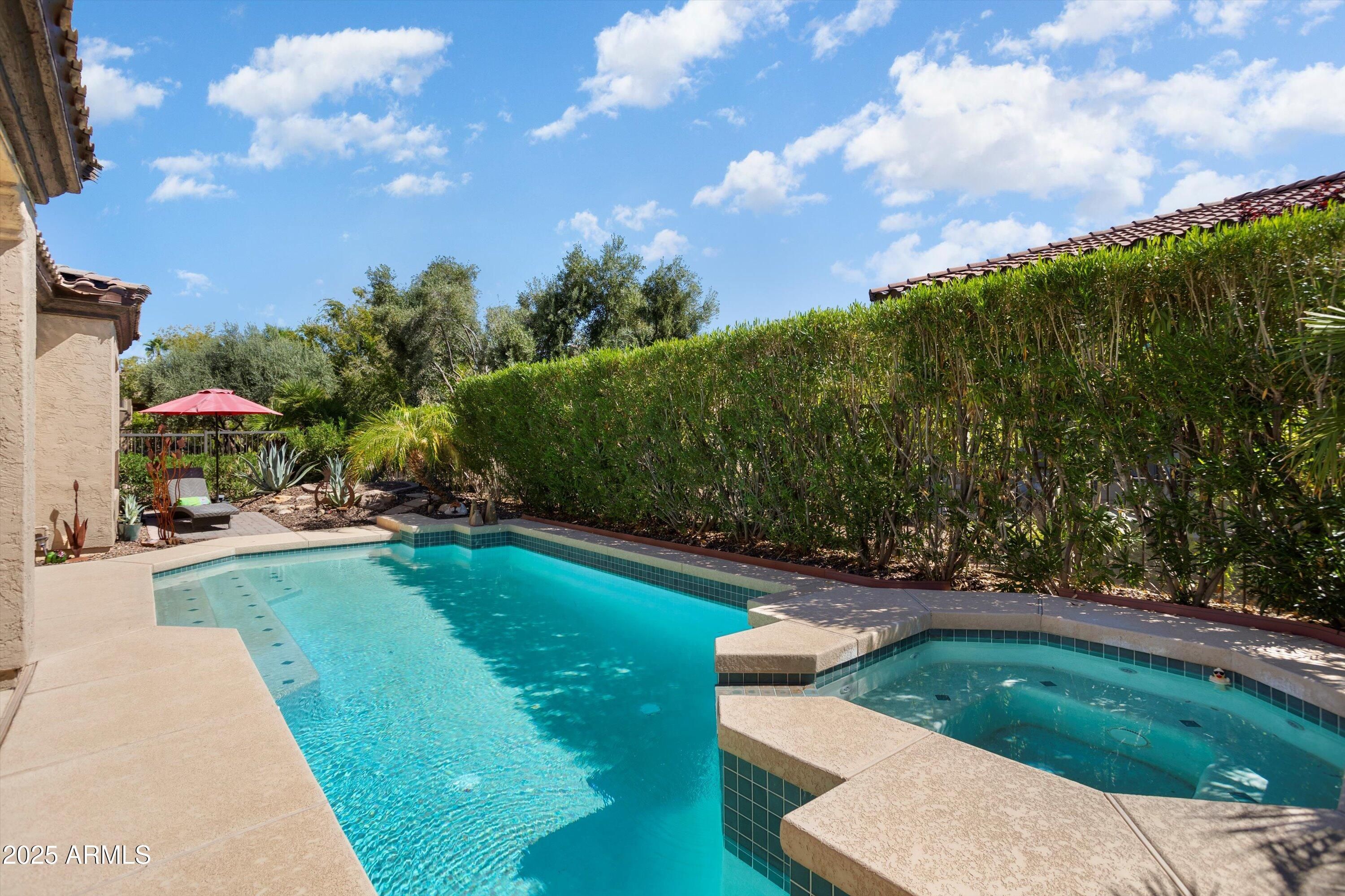 VERY UPDATED 'Libertas' with HEATED POOL AND SPILLOVER SPA, large patio, remodeled built-in BBQ--all surrounded by huge trees for privacy. Lovingly updated and maintained. In 2021 ROOF underlayment replaced and 11.84 kW OWNED SOLAR added, HVAC (a/c & heating)-NEW 2023, mini-split a/c added to garage-2024, interior painted-2023, Bosch refrigerator & LG dishwasher-2024, critter fencing added 2024. Beautiful curb appeal, paver driveway, lush mature landscape & front courtyard with pavers. Open floor plan with large slate tile flooring throughout. NO CARPETING. Beautiful GRANITE SLAB on kitchen counters & large island, primary suite with large walk-in closet and bath with tiled shower and counters. Enclosed den w/waterfall glass doors. Guest bedroom w/Murphy bed & updated bath, split from primary suite. So much value -- an unbelievable buy! Located in award-winning gated, 55+ Trilogy at Vistancia with 5-star-resort style amenities at the 35,000 SF Kiva Club with indoor & outdoor pools, fitness center, day spa, cafe, billiards, meeting rooms, library, tennis courts, pickle ball, bocce ball, events & a plethora of activities to choose from. Outstanding Gary Panks-designed golf course is woven throughout the neighborhood. The Mita Club has additional community amenities. Easy access from Trilogy to the 303, shopping, restaurants, entertainment, Lake Pleasant & Paloma Park.