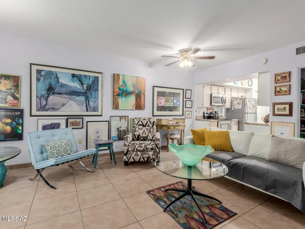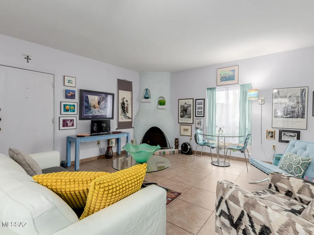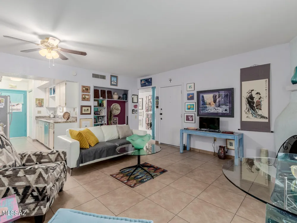 2BR/2BA townhome in a 55+ community with Santa Rita Mountain views. All-tile flooring throughout; living room with classic Kiva fireplace; efficient galley kitchen with stainless appliances, ample counter space, and built-in storage. Private main suite includes an en-suite bath, good closet space, and direct access to the covered patio. Outdoor living features a screened Arizona room plus an east-facing paver patio to enjoy the views. Recent improvements include Renewal by Andersen windows (2023), newer HVAC, and fresh exterior paint. Practical perks: carport and convenient guest parking across the street.