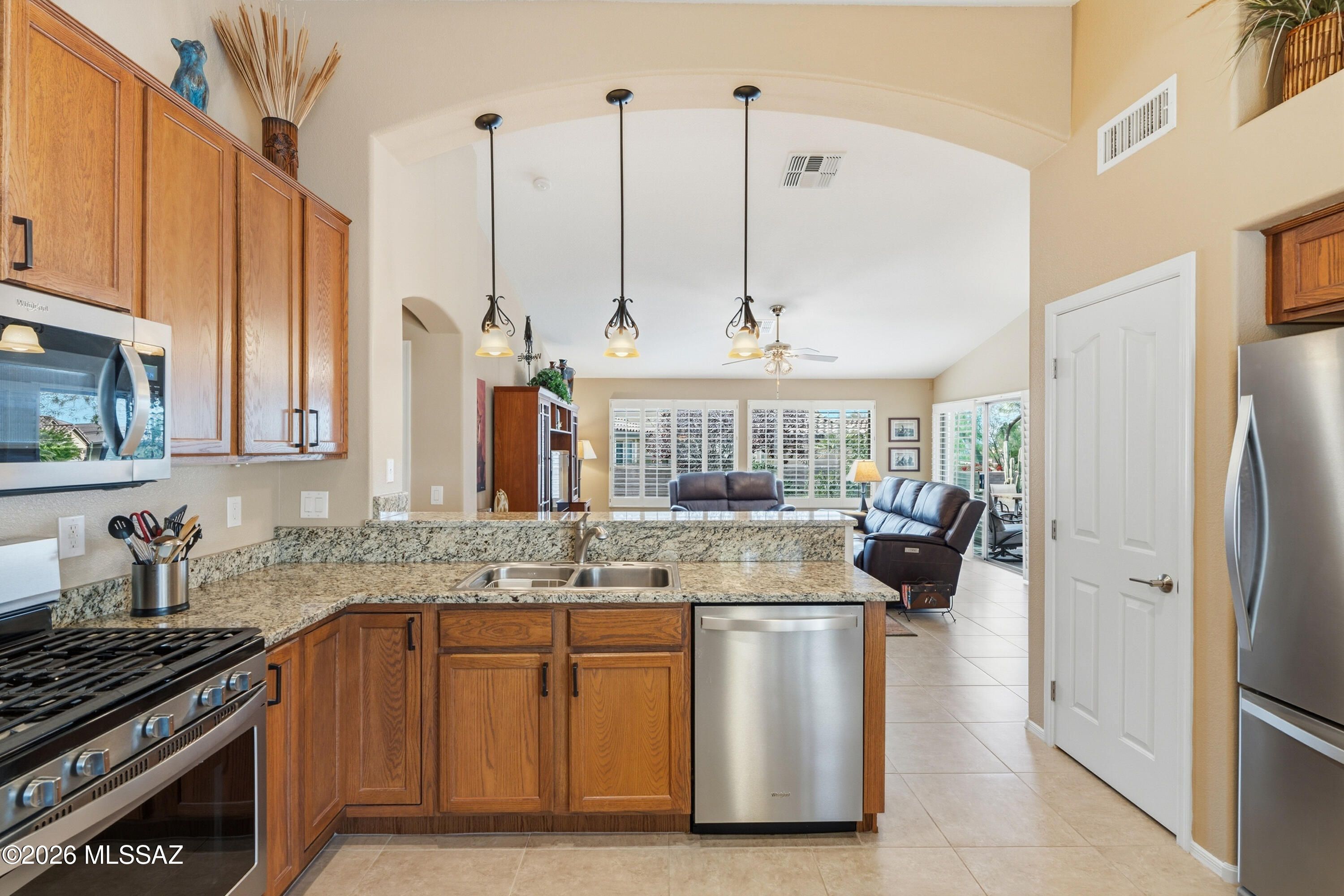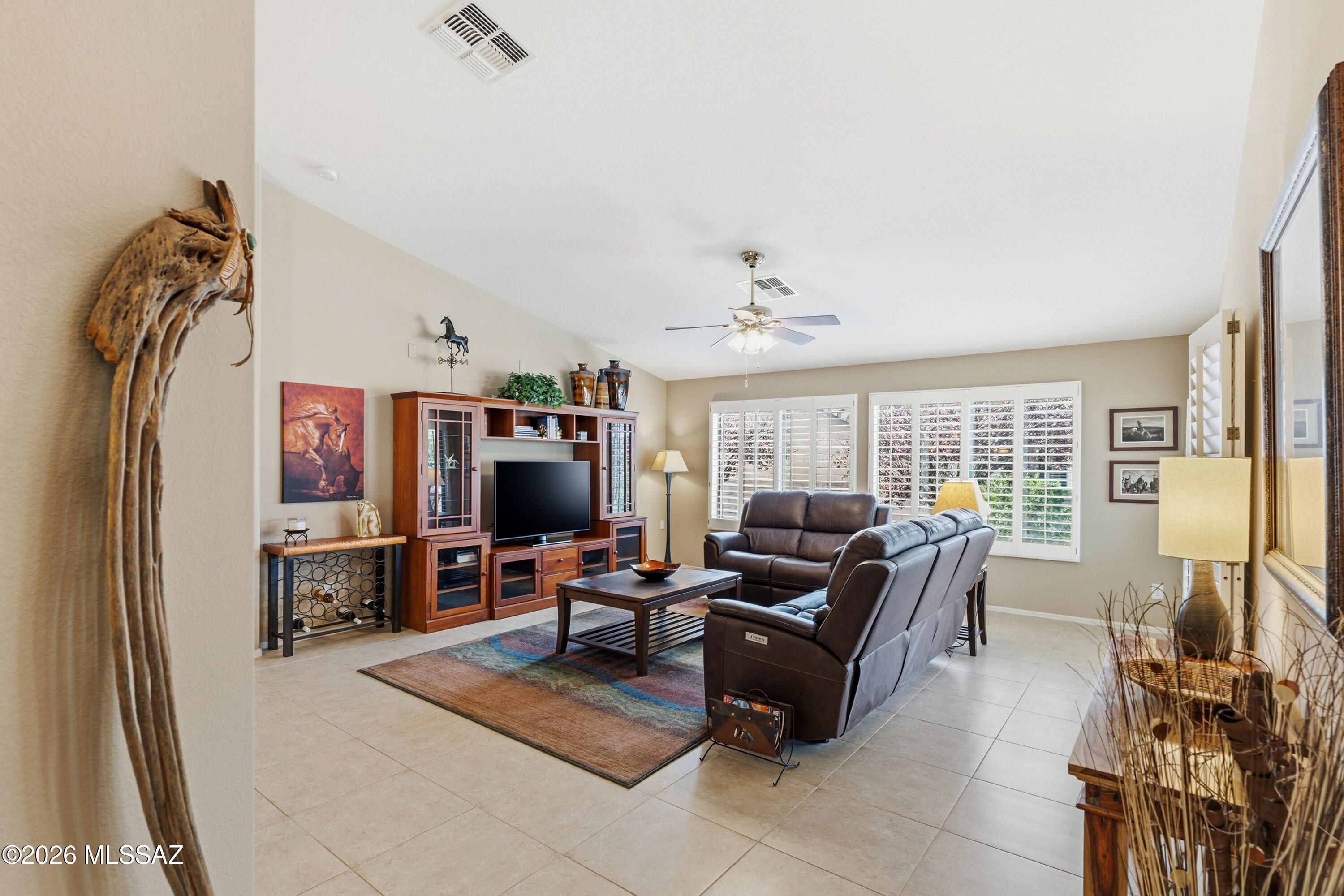 This impeccably maintained Oakmont model in Quail Creek offers 1,569 sq. ft. of well-designed living space, featuring 2 BR, 2 BA, and a Den. Ideally positioned on a quiet corner lot near the end of Glen Canyon, this home features mature landscaping and provides a peaceful setting perfect for relaxed retirement living. Interior features include 20'' ceramic tile throughout all main living areas, plantation shutters, and upgraded ceiling fans, lighting, and door hardware. The kitchen is well appointed with granite countertops, newer stainless steel appliances, a gas range, pantry closet, and a casual dining area. The owner's suite boasts a dual-vanity bath with a pocket door for added privacy, a fully tiled walk-in shower, separate linen closet and a spacious walk-in closet.