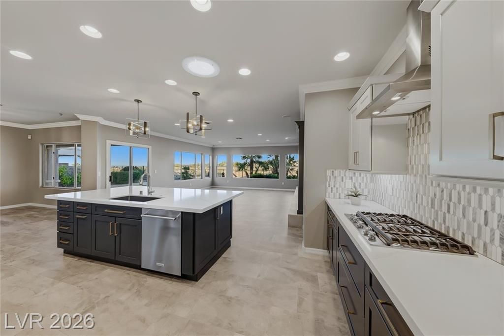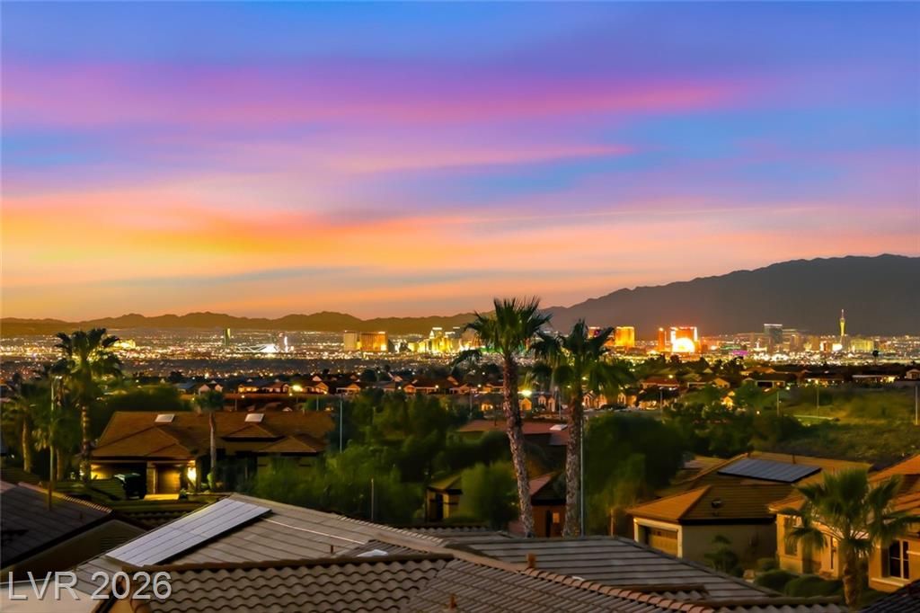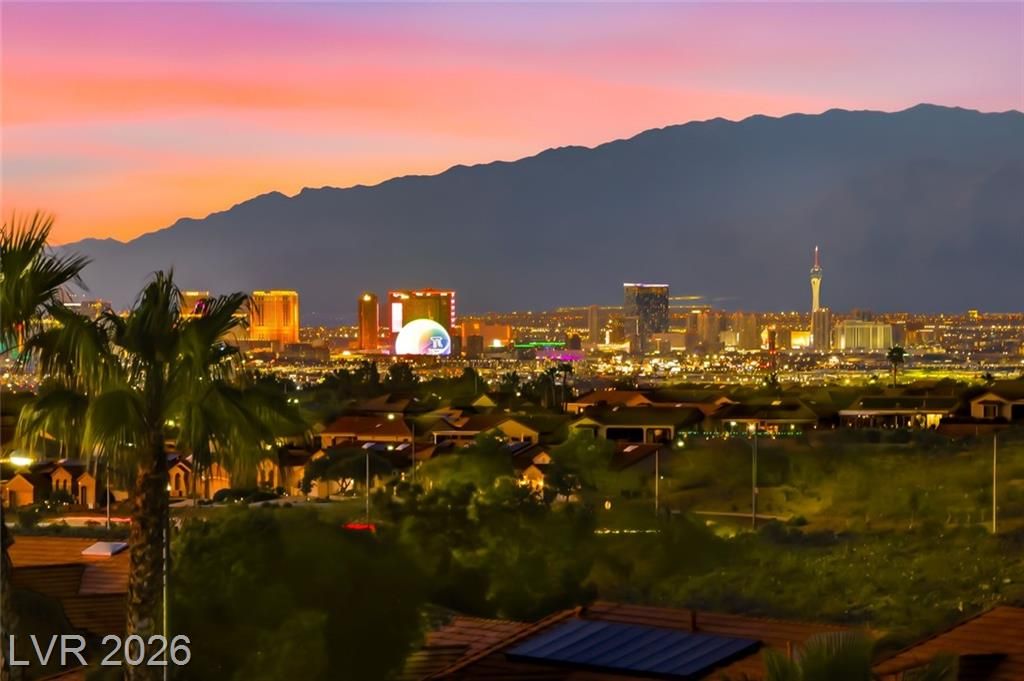 Experience elevated living in this custom Arlington model set on a premium lot with stunning Strip & mountain views. Owned solar & rare oversized attached casita w/private gated courtyard create a unique and highly functional layout. This turnkey home features a bright open floorplan with contemporary tile flooring, crown molding, upgraded lighting, surround sound & solar tubes for added natural light. The kitchen offers stainless appliances, custom backsplash, two-tone cabinetry & oversized island w/breakfast bar, opening to spacious living area with panoramic views fully visible from inside the home. The primary suite includes backyard access & spa-like bath with oversized walk-in shower. Additional highlights include central vacuum & oversized garage w/epoxy floors, added cabinetry, work bench, swamp cooler & golf cart storage. Backyard features a private setting w/pool, covered patio & built-in BBQ. Located in a premier 55+ community with resort-style amenities & active lifestyle.