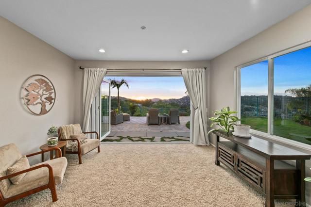 Revel in sweeping views of panoramic mountains from this peaceful and private residence tucked away at the end of a tranquil cul-de-sac. Mature, manicured landscaping welcomes you inside where rich wood flooring and soaring ceilings with clerestory windows fill the living and dining areas with natural light. Enjoy refreshing cross-breezes that flow effortlessly from the front entry through to the backyard, creating a light, airy ambiance throughout the home. At the heart of the home, a generous family-style kitchen showcases abundant designer cabinetry, gas cooking, an oversized island with breakfast bar seating, and a charming breakfast nook for casual dining. The kitchen flows seamlessly into the inviting family room, highlighted by built-in cabinetry and a warm stone fireplace. Expansive new bifold doors open to a stunning backyard retreat where thoughtful hardscape and lush landscaping create an ideal setting for entertaining—complete with a tranquil waterfall, spacious lawn for games, and a wood pergola perfectly positioned to capture spectacular sunset views. The main level also offers a cozy reading nook with custom built-in shelving, along with a bedroom and full bath ideal for guests or a private home office. Upstairs, four well-appointed bedrooms include a serene and spacious primary retreat featuring its own stone fireplace, breathtaking views, dual walk-in closets, and a luxurious ensuite bath with soaking tub, walk-in shower, and dual vanities. Additional highlights include 15 OWNED solar panels, upstairs laundry room, a whole-house fan, recessed and upgraded LED lighting, new interior and exterior paint, Nest thermostat, B-Hyve Wi-Fi smart sprinkler system, and a spacious three-car garage. Residents of Hidden Meadows enjoy resort-style amenities including a pool, tennis courts, and pickleball, all just moments from local favorites such as Side Yard Public House and The Market at Hidden Meadows.