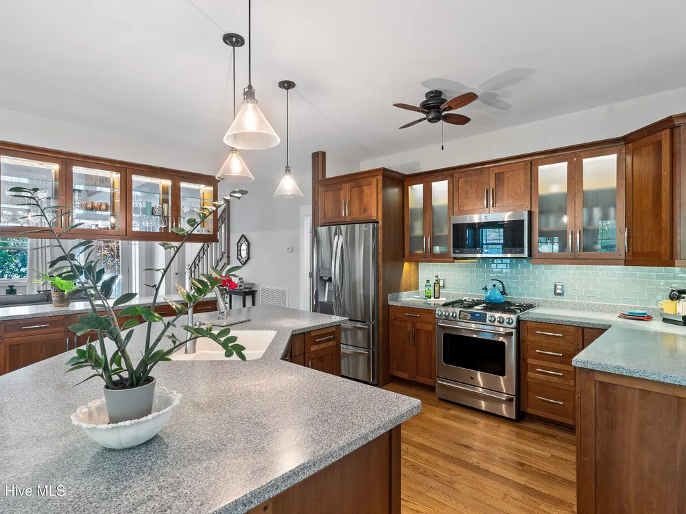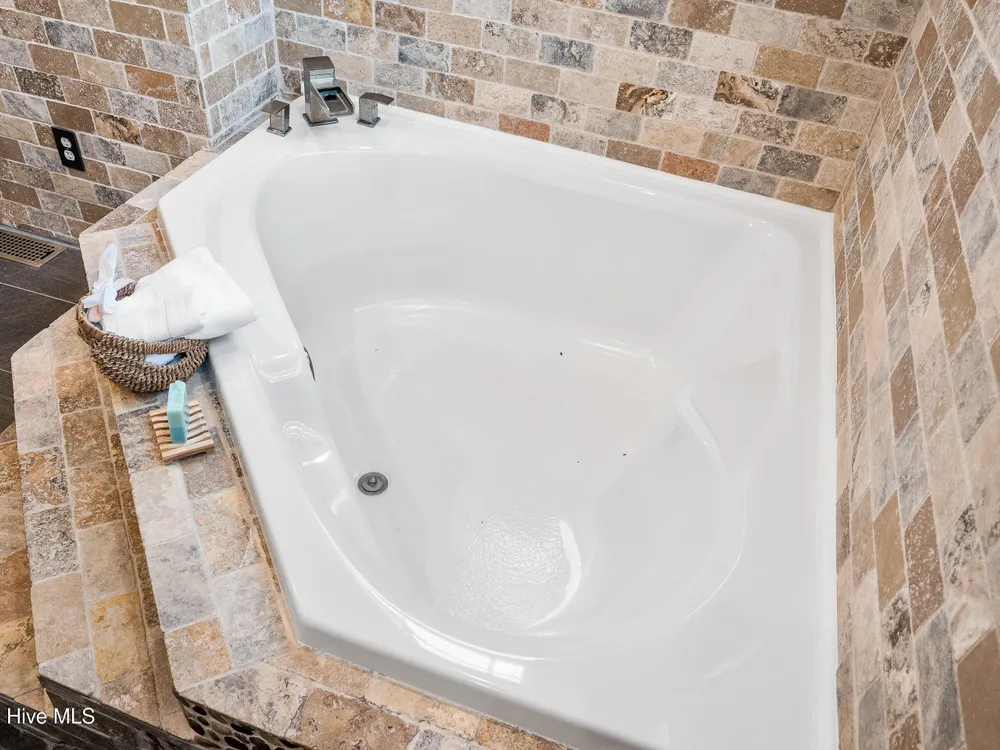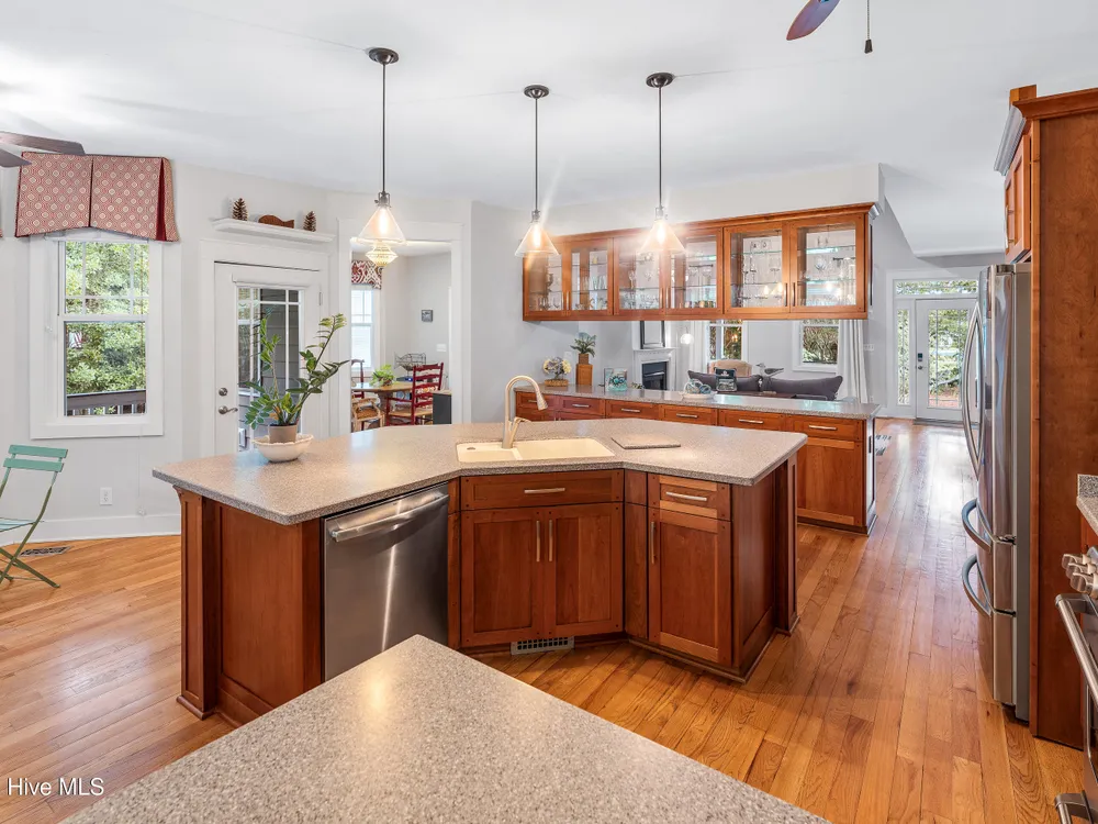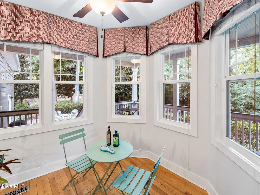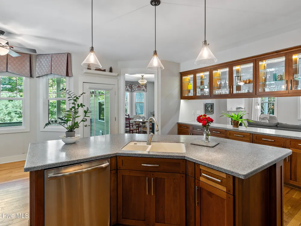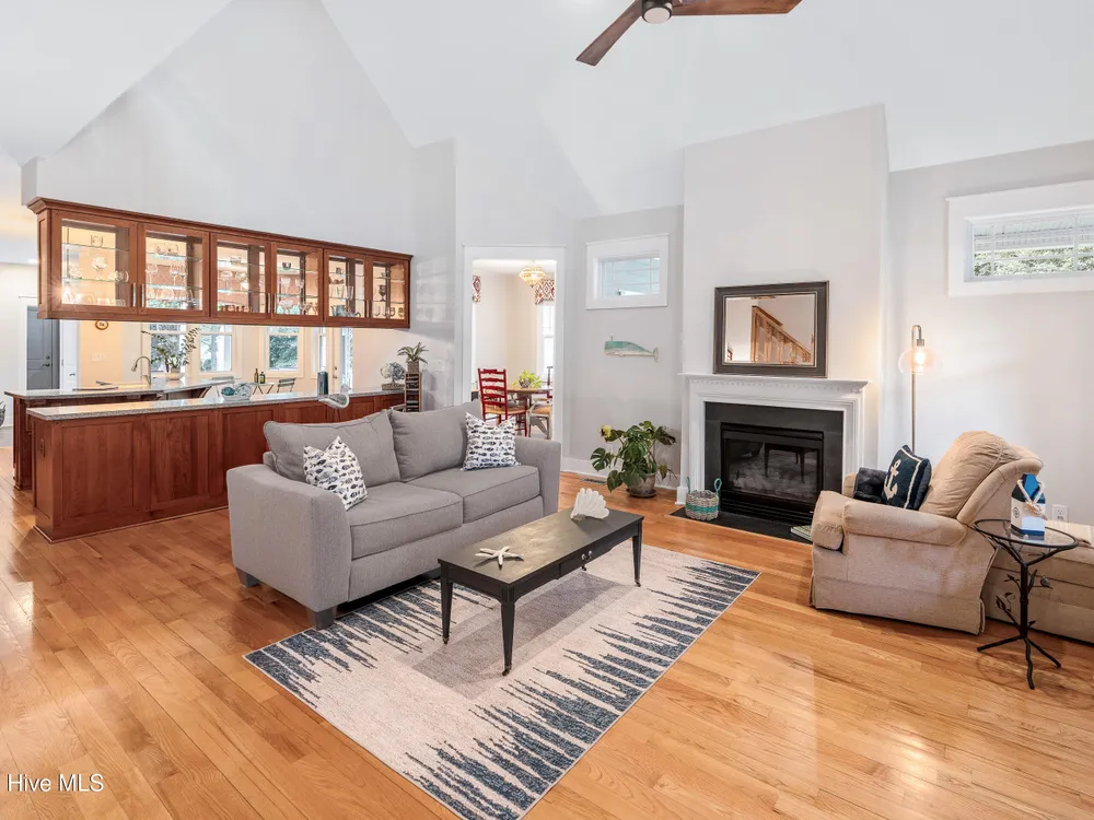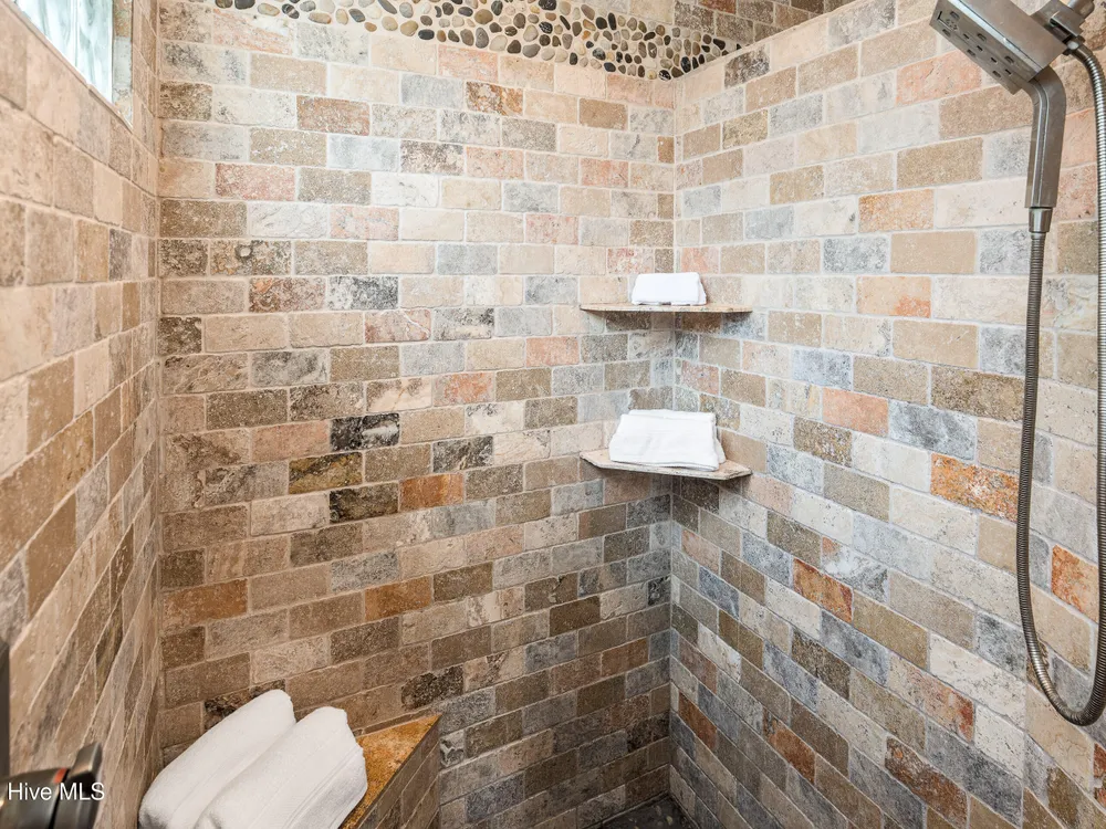 - Blinds/Shades, Solid Surface, Walk-In Closet(s), Walk-in Shower, Vaulted Ceiling(s), Gas Log, Master Downstairs, Kitchen Island, High Ceilings, Ceiling Fan(s)
