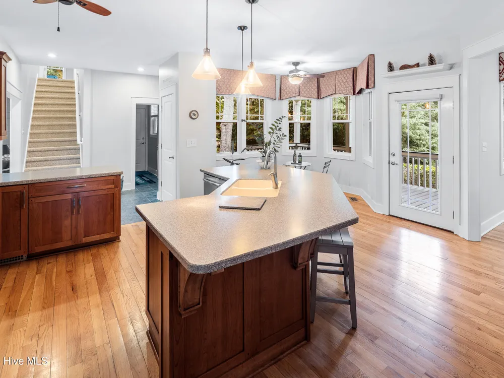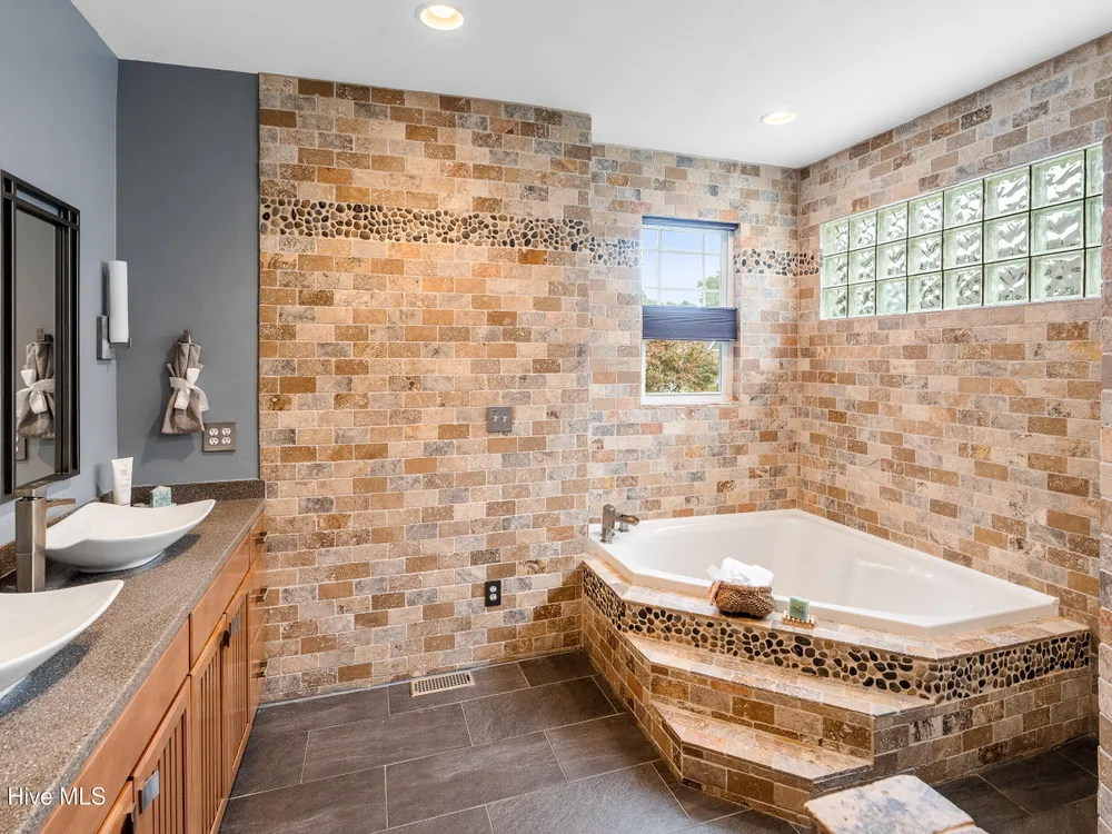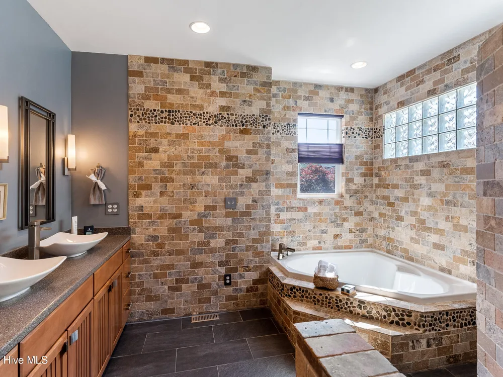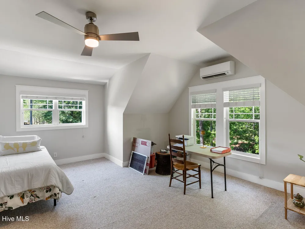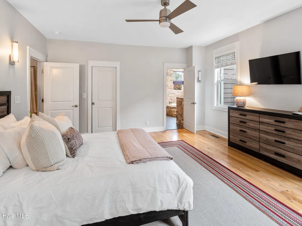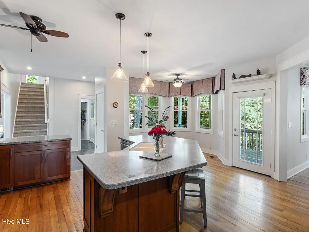 - Blinds/Shades, Solid Surface, Walk-In Closet(s), Walk-in Shower, Vaulted Ceiling(s), Gas Log, Master Downstairs, Kitchen Island, High Ceilings, Ceiling Fan(s)