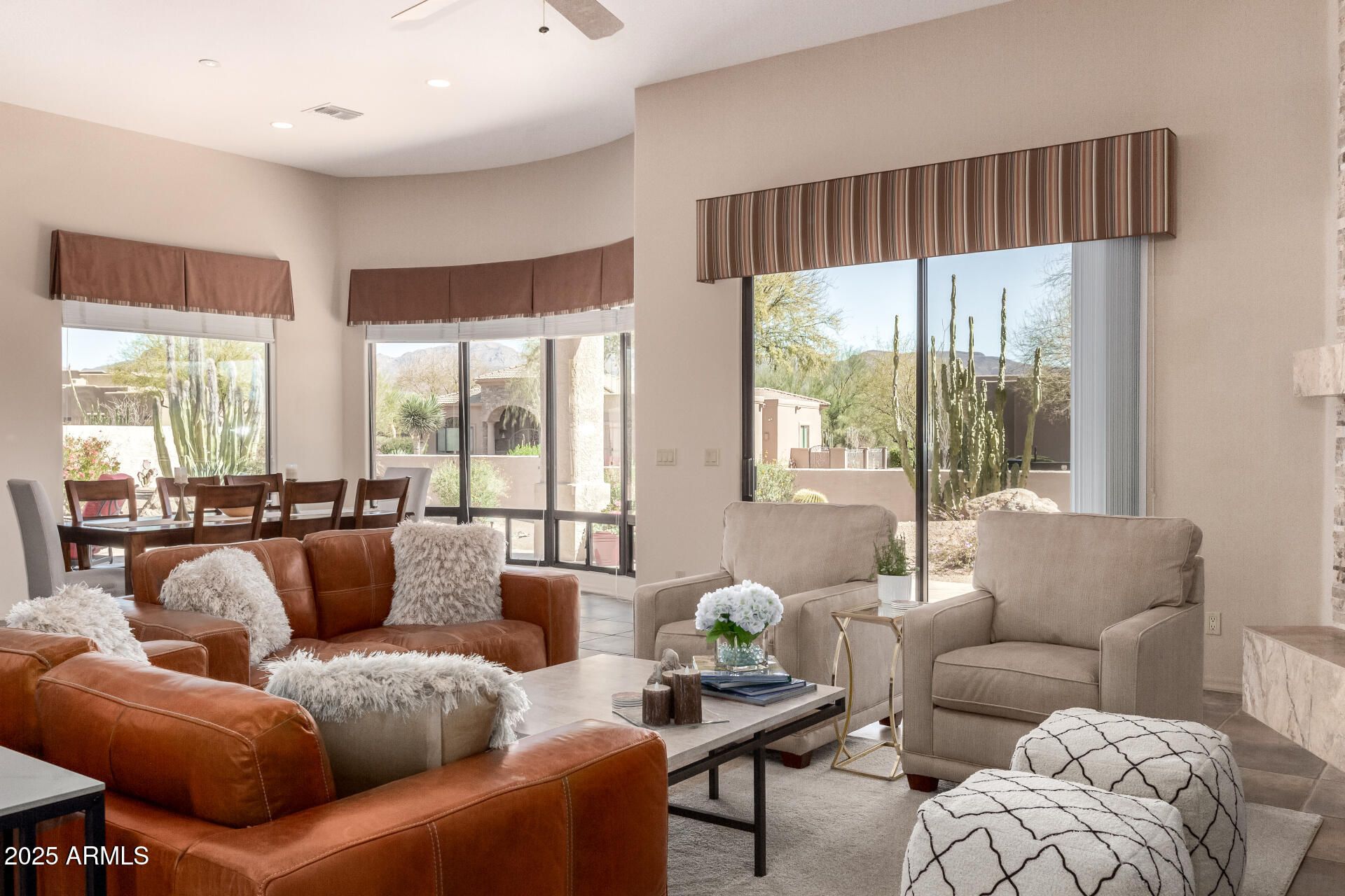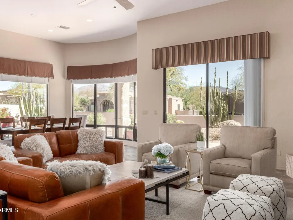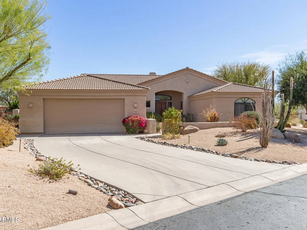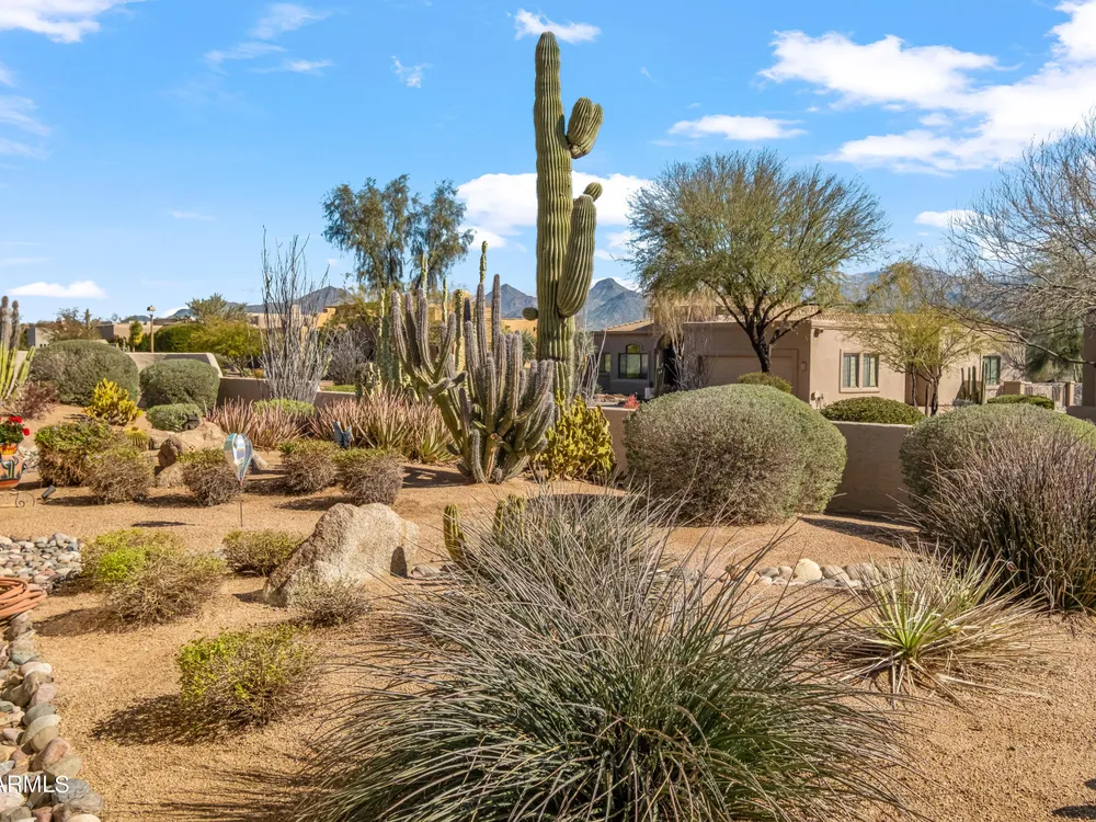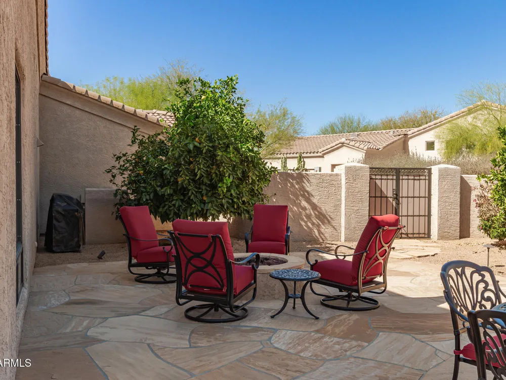 The perfect size house with a large private yard in the wonderful community of Tonto Verde. This home feels larger than the square footage. From the moment you step in the spacious entry, you will noticel how the greatroom, dining room,and open kitchen with 42'' cabinets are enhanced with abundant windows to include the beauty of the backyard and the mountains to the east. This is a very private yard with enclosed wall with room to add a pool, spa or casita. It also has a new firepit that is a perfect conversation area. The owner's suite has a huge bathroom and closet. The guest suite is an ensuite and the 3rd bedroom is presently used as a den. It also has a powder room so the guest suite doesn't have to share with other guests.The garage has storage and room for 2 cars and a golf cart.