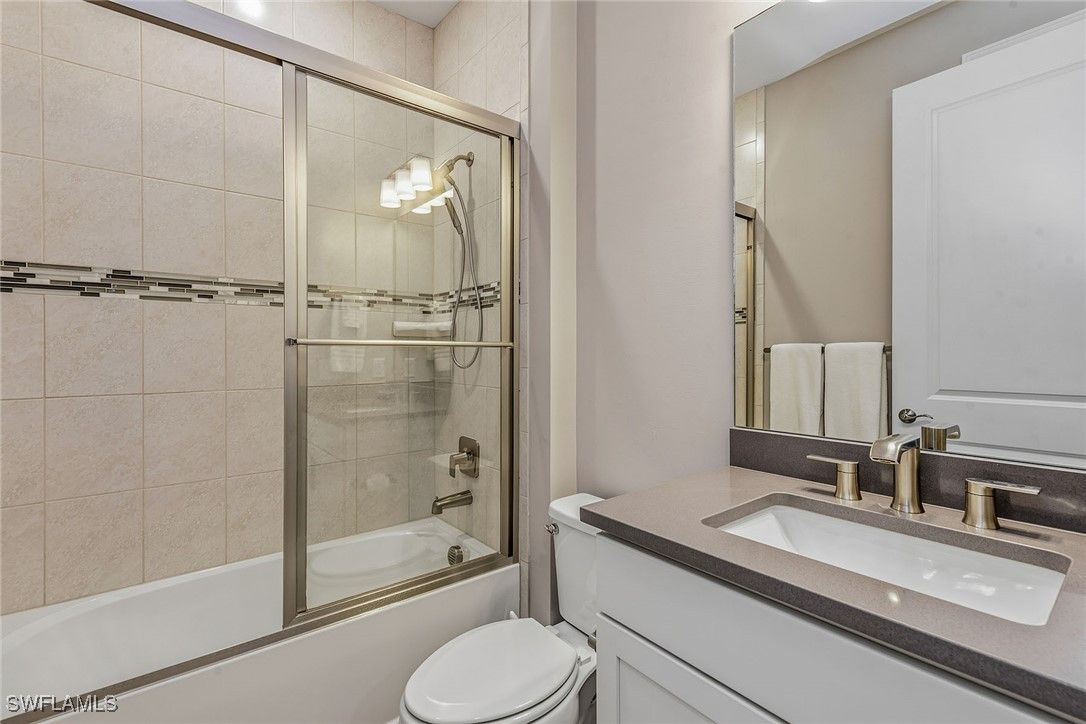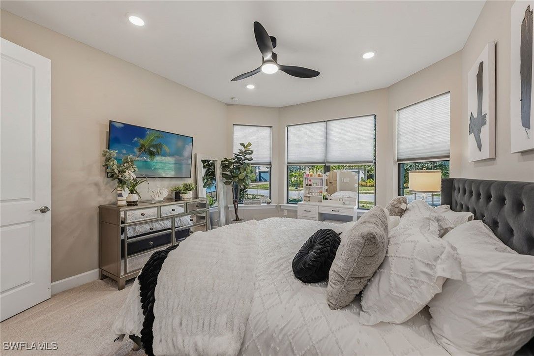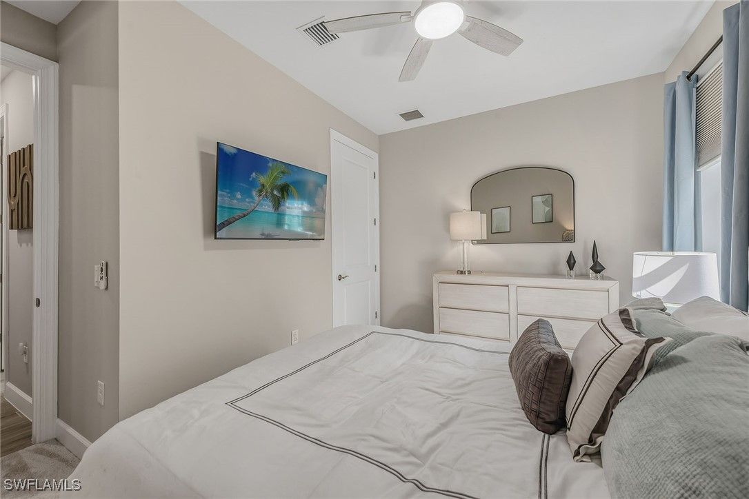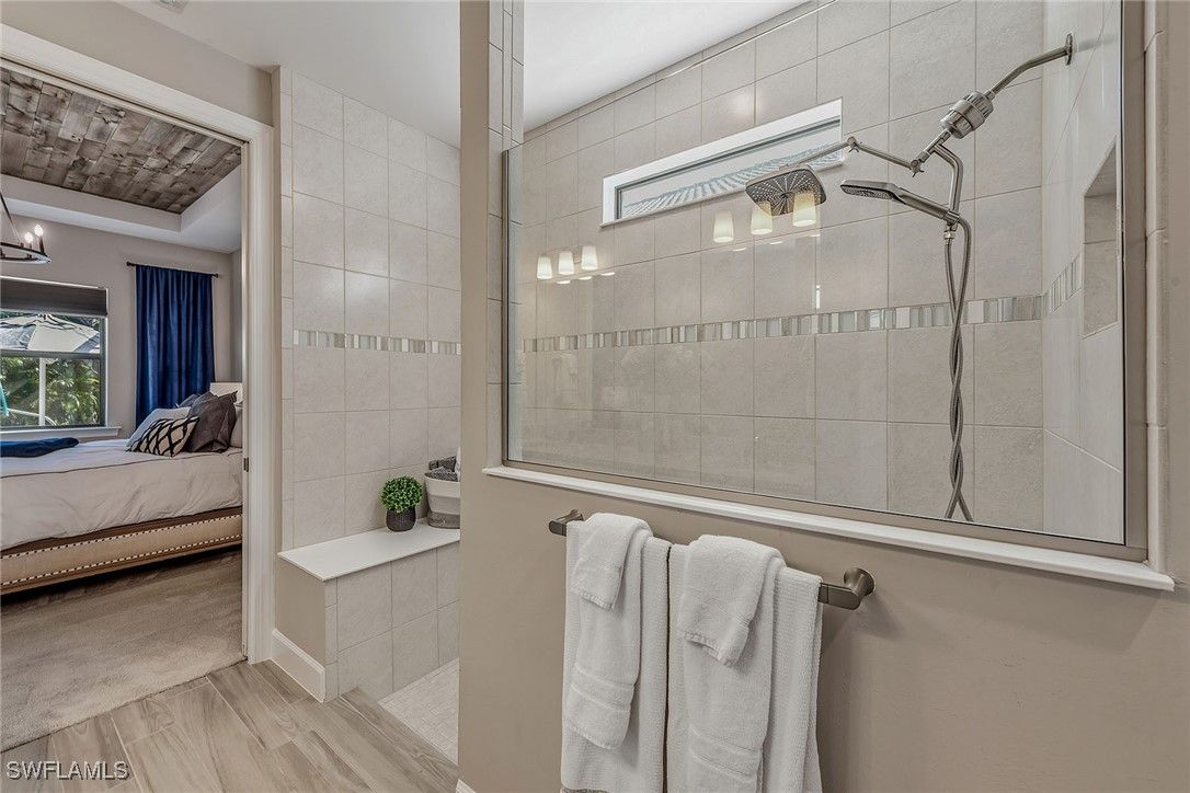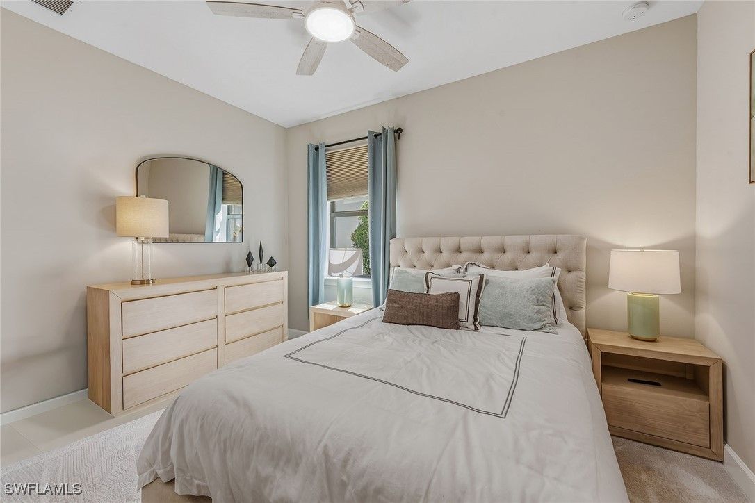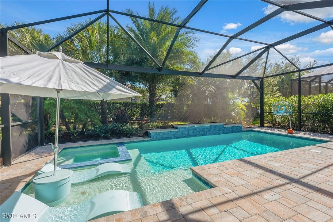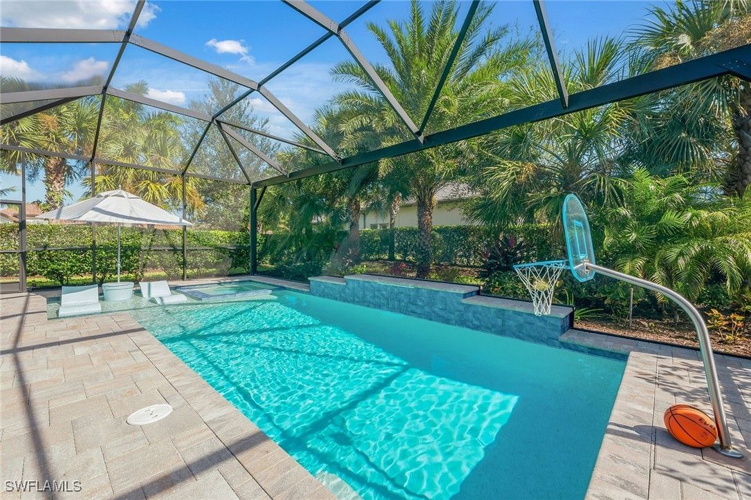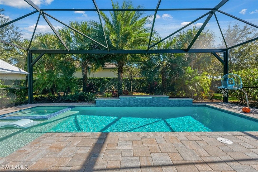 Experience luxury living in this beautifully furnished 2022 residence in Amaranda at Fiddler’s Creek, set on a desirable corner lot framed by private, lush tropical garden views. Designed to look and feel like a model home, this pristine three-bedroom plus den, three-bath retreat showcases an open floor plan, custom upgrades, and an effortless indoor-outdoor lifestyle. New interior paint, all-new ceiling fans, and elegant tile flooring enhance the light-filled interior, while impact-resistant windows and sliders provide year-round peace of mind. A newer HVAC system and serviced hot water tank ventilation add comfort and efficiency. Outdoors, the home is surrounded by mature palms, updated landscaping with fresh sod, and added pavers and stone detailing along sides of the home. The wide brick paver driveway leads to an exceptional garage featuring new epoxy flooring, extensive cabinetry and a generous counter workspace with tile backsplash. The expansive screened lanai offers picture-window screening, electric Wi-Fi-enabled hurricane shutters, and a covered living area highlighted by ceiling fans and a striking tongue-and-groove wood ceiling. A fully equipped summer kitchen includes a gas grill with hood, ceiling-height backsplash, sink and mini refrigerator, complemented by a built-in entertainment wall with floor-to-ceiling tile and fireplace. The heated pool and spa feature a waterfall, sun shelf, new pool lights, and a smart Wi-Fi pool system, creating a private, resort-inspired sanctuary. Inside, recessed lighting, custom ceilings, designer window treatments and professionally cleaned tile grout elevate every space. The chef’s kitchen impresses with white cabinetry, quartz countertops, a mosaic tile backsplash, a pendant-lit island with bar seating and a spacious walk-in pantry with custom shelving. Premium KitchenAid stainless steel appliances include a five-burner gas range with hood, wall oven, built-in microwave, dishwasher and French-door refrigerator. The kitchen flows into the formal dining area with serene garden views, while the great room showcases a dramatic stacked-stone feature wall, coffered ceilings and zero-corner sliders that fully open to the lanai. The owner’s suite is a luxurious retreat with tray ceilings, custom lighting, and pocket doors leading to a spa-inspired bath featuring a quartz dual-sink vanity with full-width mirror, an expansive walk-in shower with bench, niche, floor-to-ceiling tile and multiple showerheads, and a custom-designed walk-in closet. Two spacious guest suites each offer en-suite baths with tub-shower combinations and glass enclosures, while a private den with French doors and a modern fan provides an ideal home office or study. A well-appointed laundry room with built-in cabinetry and Whirlpool washer/dryer completes the interior. Residents enjoy an award-winning community with enhanced amenities, including a refreshed resort-style pool, updated Gator Grille and 10 new pickleball courts.