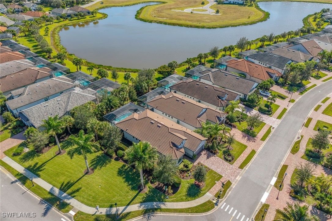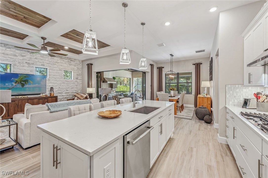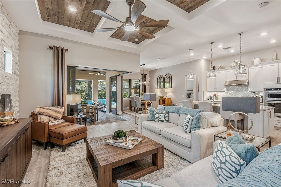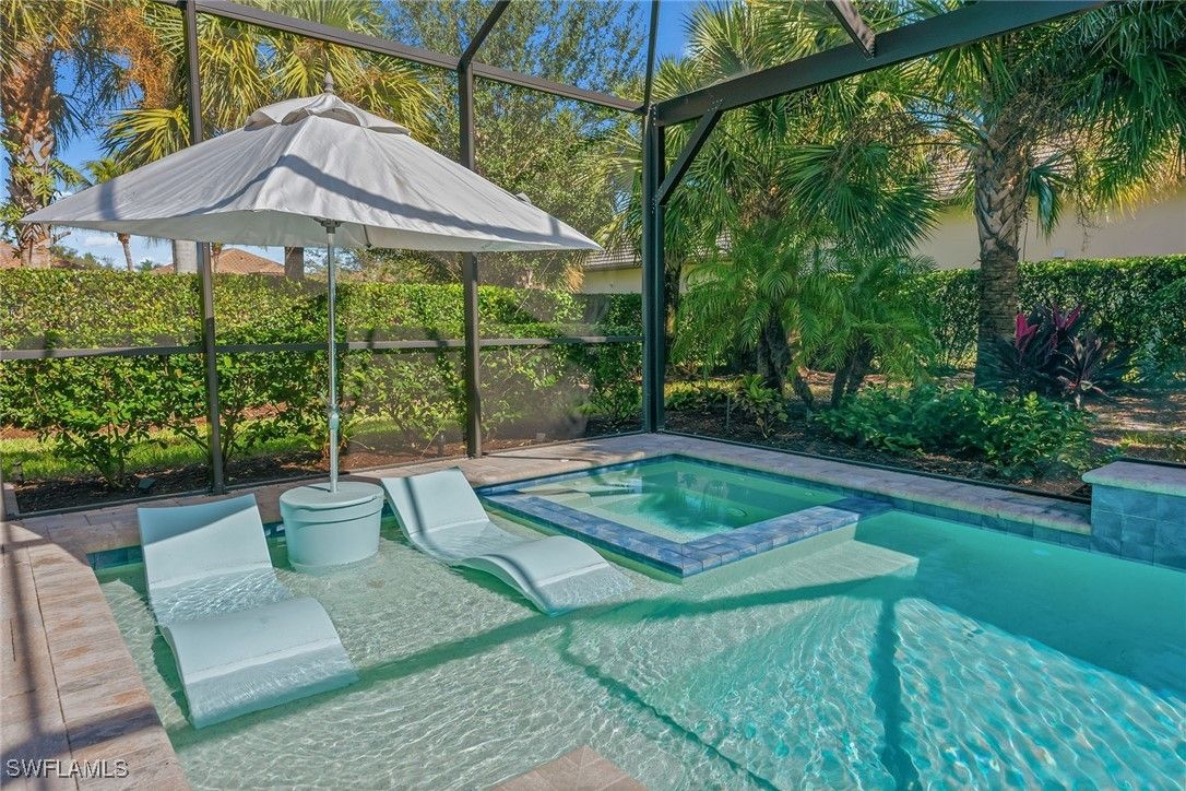 Experience luxury living in this beautifully furnished 2022 residence in Amaranda at Fiddler’s Creek, featuring an open floor plan and set on a desirable corner lot framed by private, lush tropical garden views. Designed to look and feel like a model home, this pristine three-bedroom plus den, three-bath retreat showcases an array of custom upgrades, modern finishes, and an effortless indoor-outdoor lifestyle. The exterior is surrounded by mature tropical palms and features a wide brick paver driveway, while full impact-resistant windows and sliders offer peace of mind year-round. A newer HVAC system adds comfort and efficiency. The expansive screened lanai with picture-window screening creates a seamless connection to the outdoors, complemented by a covered living area with ceiling fans and a stunning tongue-and-groove wood ceiling. A fully equipped summer kitchen with gas grill, hood, ceiling-height backsplash, sink, and mini refrigerator enhances outdoor entertaining, along with a built-in entertainment center featuring floor-to-ceiling tile and a fireplace. The heated pool and spa with waterfall feature and sun shelf are enveloped by lush landscaping, creating a private resort-inspired sanctuary. Inside, elegant tile flooring, recessed lighting, custom ceilings and designer window treatments elevate every space. The chef’s kitchen impresses with white cabinetry, quartz countertops, a mosaic tile backsplash, a pendant-lit island with bar seating, and a spacious walk-in pantry with custom shelving. Newer premium KitchenAid stainless steel appliances include a five-burner gas range with hood, built-in microwave, wall oven, dishwasher and French-door refrigerator. The kitchen flows into the formal dining area, framed by windows that highlight serene garden views, while the great room showcases a dramatic stacked-stone feature wall, coffered ceilings and zero-corner sliding doors that fully open to the lanai. The owner’s suite is a luxurious haven with tray ceilings, custom lighting and pocket doors leading to a spa-inspired bath featuring a quartz dual-sink vanity with full-width mirror, an expansive walk-in shower with bench, niche, floor-to-ceiling tile and multiple showerheads, along with a walk-in closet outfitted with custom built-ins. Two generous guest suites offer comfort and privacy, each with its en-suite bath featuring a tub-shower combo with glass enclosure. A private den with French doors and a modern fan serves as an office or study. Additional highlights include a well-designed laundry room with built-in cabinetry and Whirlpool washer and dryer, plus an exceptional garage with epoxy flooring, extensive cabinetry, a large counter workspace and a tile backsplash. Residents enjoy a renovated 54,000-square-foot Club & Spa, resort pools, dining, fitness and racquet sports, with optional golf, beach and boating. Minutes from Marco Island and downtown Naples, the location offers resort-style living.