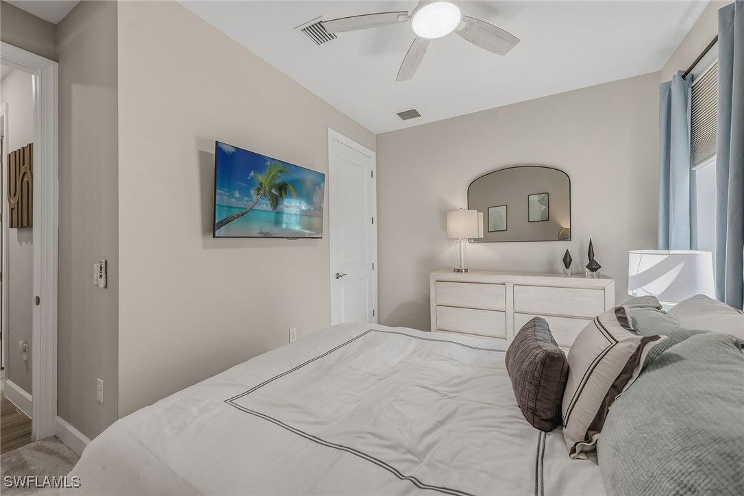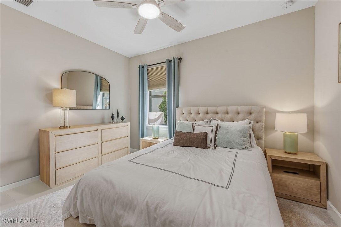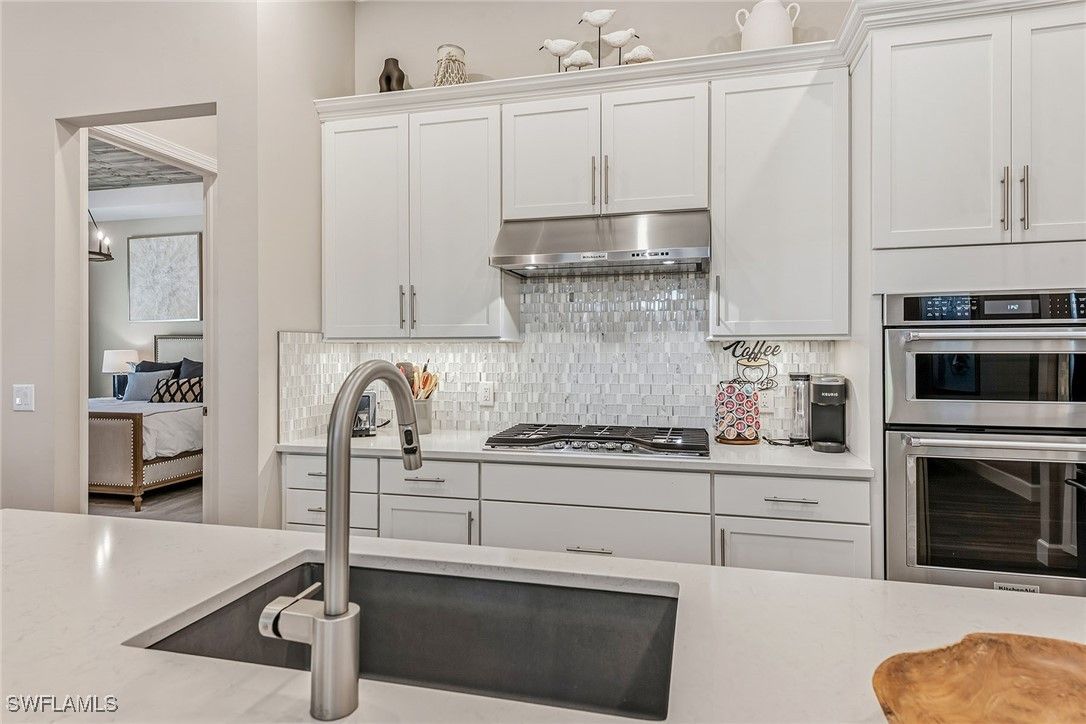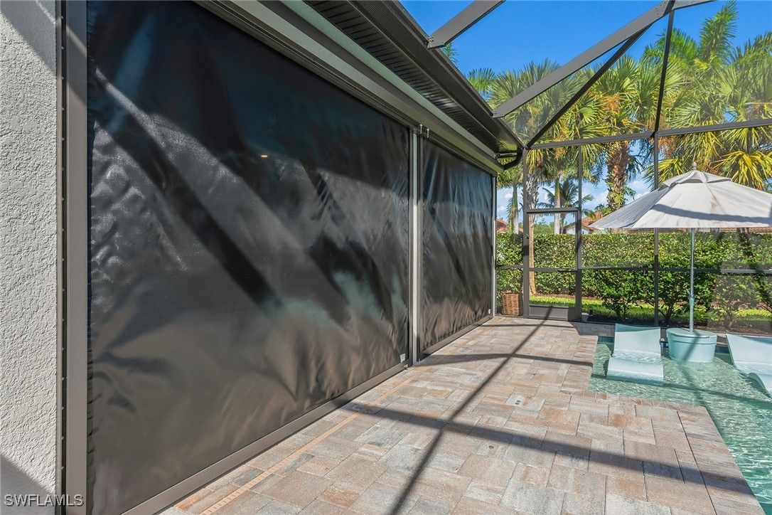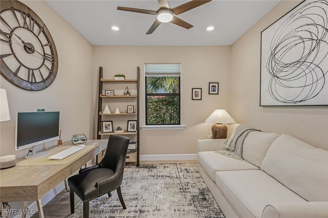 Experience luxury living in this beautifully furnished 2022 residence in Amaranda at Fiddler’s Creek, featuring an open floor plan and set on a desirable corner lot framed by private, lush tropical garden views. Designed to look and feel like a model home, this pristine three-bedroom plus den, three-bath retreat showcases an array of custom upgrades, modern finishes, and an effortless indoor-outdoor lifestyle. The exterior is surrounded by mature tropical palms and features a wide brick paver driveway, while full impact-resistant windows and sliders offer peace of mind year-round. A newer HVAC system adds comfort and efficiency. The expansive screened lanai with picture-window screening creates a seamless connection to the outdoors, complemented by a covered living area with ceiling fans and a stunning tongue-and-groove wood ceiling. A fully equipped summer kitchen with gas grill, hood, ceiling-height backsplash, sink, and mini refrigerator enhances outdoor entertaining, along with a built-in entertainment center featuring floor-to-ceiling tile and a fireplace. The heated pool and spa with waterfall feature and sun shelf are enveloped by lush landscaping, creating a private resort-inspired sanctuary. Inside, elegant tile flooring, recessed lighting, custom ceilings and designer window treatments elevate every space. The chef’s kitchen impresses with white cabinetry, quartz countertops, a mosaic tile backsplash, a pendant-lit island with bar seating, and a spacious walk-in pantry with custom shelving. Newer premium KitchenAid stainless steel appliances include a five-burner gas range with hood, built-in microwave, wall oven, dishwasher and French-door refrigerator. The kitchen flows into the formal dining area, framed by windows that highlight serene garden views, while the great room showcases a dramatic stacked-stone feature wall, coffered ceilings and zero-corner sliding doors that fully open to the lanai. The owner’s suite is a luxurious haven with tray ceilings, custom lighting and pocket doors leading to a spa-inspired bath featuring a quartz dual-sink vanity with full-width mirror, an expansive walk-in shower with bench, niche, floor-to-ceiling tile and multiple showerheads, along with a walk-in closet outfitted with custom built-ins. Two generous guest suites offer comfort and privacy, each with its en-suite bath featuring a tub-shower combo with glass enclosure. A private den with French doors and a modern fan serves as an office or study. Additional highlights include a well-designed laundry room with built-in cabinetry and Whirlpool washer and dryer, plus an exceptional garage with epoxy flooring, extensive cabinetry, a large counter workspace and a tile backsplash. Residents enjoy a renovated 54,000-square-foot Club & Spa, resort pools, dining, fitness and racquet sports, with optional golf, beach and boating. Minutes from Marco Island and downtown Naples, the location offers resort-style living.