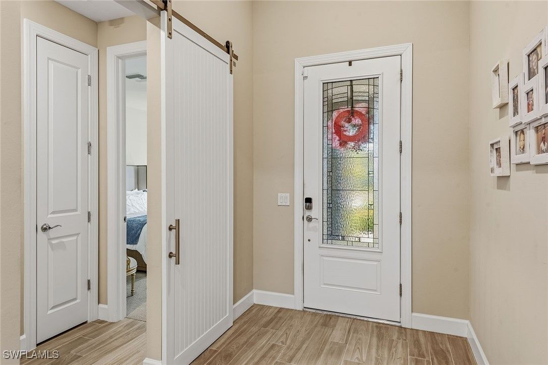 Enjoy southern exposure, tranquil lake views, and exceptional upgrades throughout this beautifully appointed 2020-built 3 BDR, 2.5 bath corner lot residence in Amaranda at Fiddler’s Creek. This home offers a heated pool/ spa with an upgraded no-see-um screen enclosure, electric shades, outdoor kitchen, a 22KW Generac whole-house generator, and storm protection, including Typhoon electric armor shutters and impact windows. Inside, the light-filled foyer features a glass-insert entry door, crown molding, and a sliding barn door that provides stylish access to a guest suite. The open-concept main living area showcases porcelain wood-look tile flooring, a coffered ceiling, recessed lighting, crown molding, and serene lake views. The gourmet kitchen is beautifully equipped with quartz counters, a large island with Moen faucet, white cabinetry with glass-front uppers, under-cabinet and in-cabinet lighting, a pantry, and premium stainless appliances, including a 36" five-burner natural gas cooktop, wall oven and microwave, French-door refrigerator, dishwasher, and stainless vent hood. Plantation shutters and elegant lighting elevate the dining area, creating a seamless flow for everyday living and entertaining. The spacious primary suite offers wood-look porcelain flooring, plantation shutters, recessed LED lighting, and a tray ceiling with crown molding. Its luxurious bath includes a frameless walk-in shower with dual showerheads and floor-to-ceiling tile, a separate soaking tub, quartz dual vanities, and a custom-organized walk-in closet. Two additional guest bedrooms feature plantation shutters and easy access to well-appointed baths, one with a quartz-topped vanity and tub/shower combo, the other with a pedestal sink, wainscoting, and framed mirror. The extended lanai is a private retreat showcasing a pavered pool deck, gas-heated pool/spa that overlook the shimmering lake, creating a serene backdrop for both relaxation and entertaining. An impressive outdoor kitchen features granite counters and backsplash, a vintage four-burner gas grill, a U-Line 24" stainless under-counter refrigerator, a vent hood, and an undermount sink—perfect for alfresco dining. Additional features include a security system, a well-appointed laundry room with Whirlpool front-load washer and gas dryer, cabinetry, and a laundry sink, as well as an epoxy-coated 4ft. extended garage with a tank gas water heater. Residents enjoy an award-winning, gated community with newly enhanced amenities, including a refreshed resort-style pool, updated Gator Grille, and 10 new pickleball courts. The Clubhouse offers fitness and spa facilities, tennis, pickleball, dining, and an extensive activity and event calendar. Optional memberships with no golf waitlist provide access to the championship course, new clubhouse, marina, and beach club. With an accepted price of $1.2M, the sellers will include their 2/2 condo with golf membership at Babcock Ranch, offering an exceptional added value.