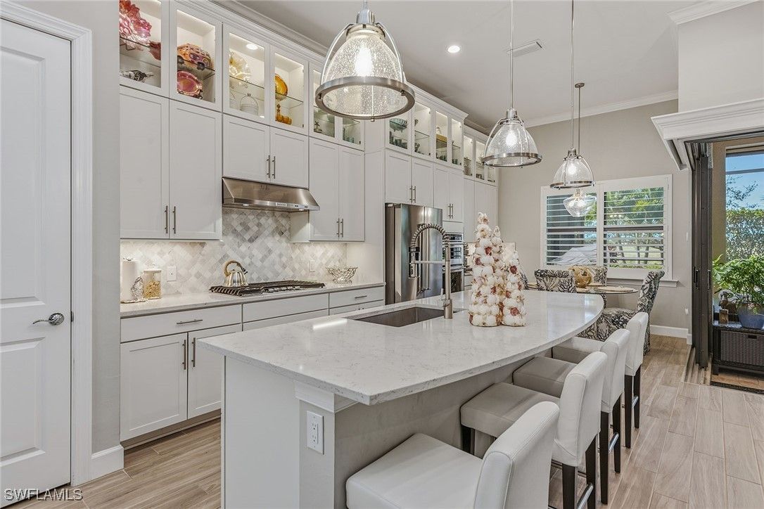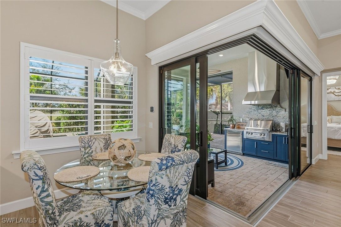 Enjoy southern exposure, tranquil lake views, and exceptional upgrades throughout this beautifully appointed 2020-built three-bedroom, 2.5-bath corner lot residence in Amaranda at Fiddler’s Creek. This home offers a heated pool/spa with an upgraded no-see-um screen enclosure, electric shades, outdoor kitchen, a 22-kilowatt Generac whole-house generator and storm protection, including Typhoon electric armor shutters and impact windows. Inside, the light-filled foyer features a glass-insert entry door, crown molding, and a sliding barn door that provides stylish access to a guest suite. The open-concept main living area showcases porcelain wood-look tile flooring, a coffered ceiling, recessed lighting, crown molding and serene lake views. The gourmet kitchen is beautifully equipped with quartz counters, a large island with Moen faucet, white cabinetry with glass-front uppers, under-cabinet and in-cabinet lighting, a pantry and premium stainless appliances, including a 36-inch five-burner natural gas cooktop, wall oven and microwave, French-door refrigerator, dishwasher and stainless vent hood. Plantation shutters and elegant lighting elevate the dining area, creating a seamless flow for everyday living and entertaining. The spacious primary suite offers wood-look porcelain flooring, plantation shutters, recessed LED lighting and a tray ceiling with crown molding. Its luxurious bath includes a frameless walk-in shower with dual showerheads and floor-to-ceiling tile, a separate soaking tub, quartz dual vanities and a custom-organized walk-in closet. Two additional guest bedrooms feature plantation shutters and easy access to well-appointed baths, one with a quartz-topped vanity and tub/shower combo, the other with a pedestal sink, wainscoting and framed mirror. The extended lanai is a private retreat showcasing a paver pool deck, gas-heated pool/spa that overlooks the shimmering lake, creating a serene backdrop for both relaxation and entertaining. An impressive outdoor kitchen features granite counters and backsplash, a vintage four-burner gas grill, a U-Line 24-inch stainless under-counter refrigerator, a vent hood and an undermount sink, ideal for alfresco dining. Other features include a security system, a well-appointed laundry room with Whirlpool front-load washer and gas dryer, cabinetry and a laundry sink, as well as an epoxy-coated 4-foot extended garage with a tank gas water heater. Residents enjoy an award-winning, gated community with newly enhanced amenities, including a refreshed resort-style pool, updated Gator Grille and 10 new pickleball courts. The clubhouse offers fitness and spa facilities, tennis, pickleball, dining, activities and event calendar. Optional memberships with no golf waitlist provide access to the championship course, new clubhouse, marina and beach club. With an accepted price of $1.2 million, sellers will include their two-bedroom, two-bath condominium with golf membership at Babcock Ranch, offering added value.
