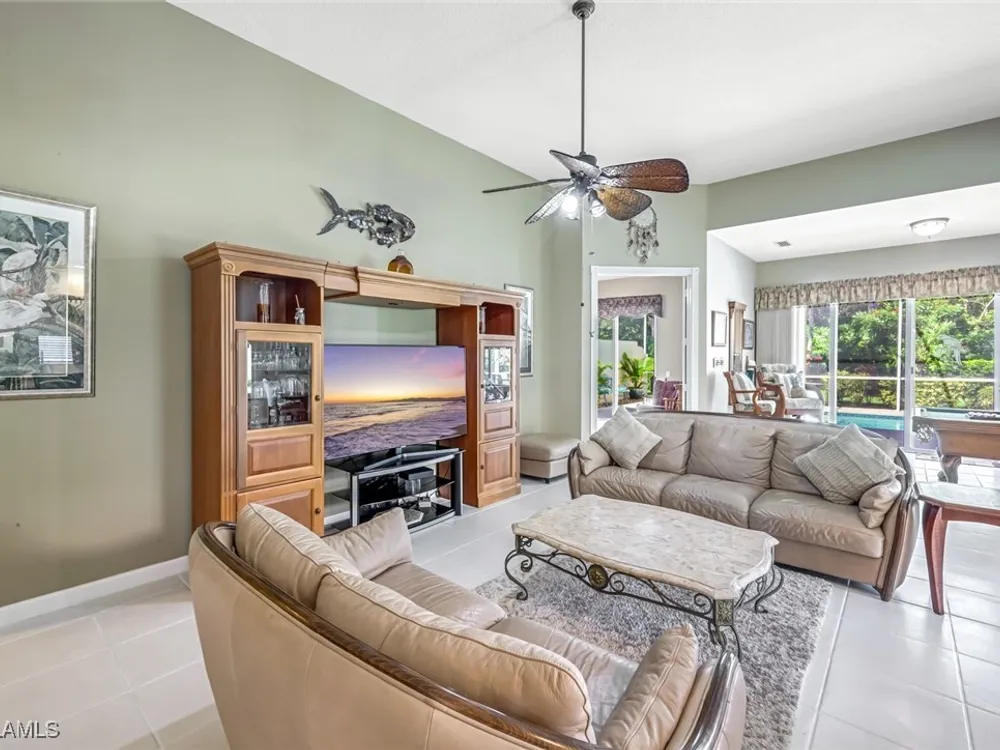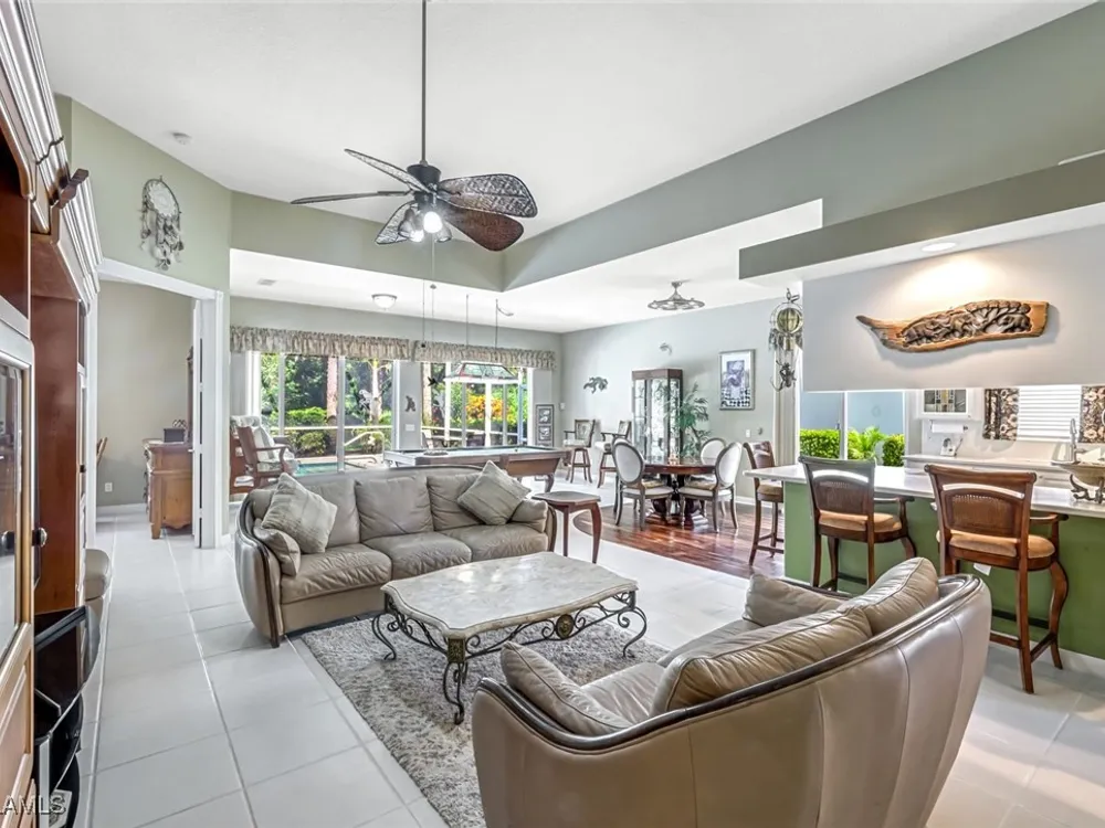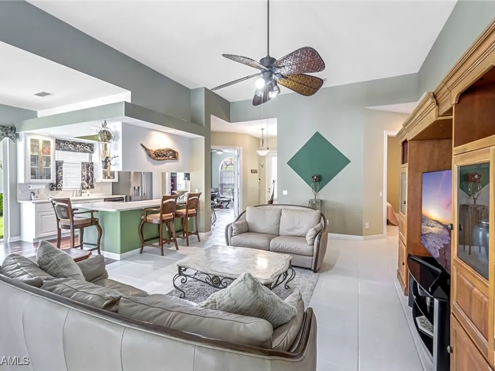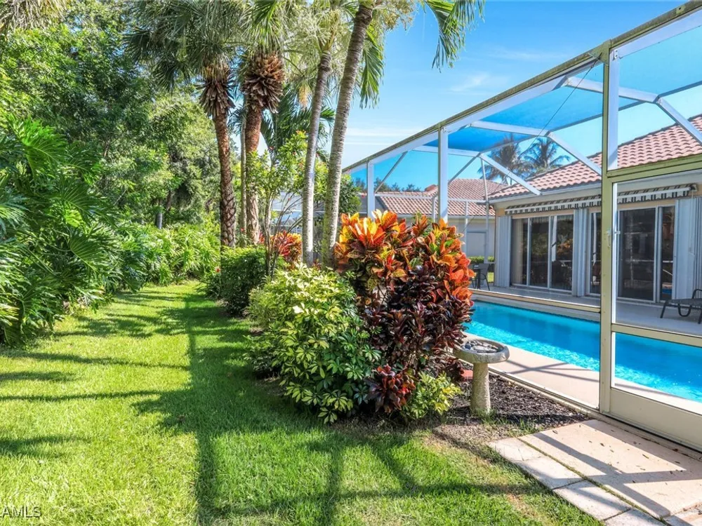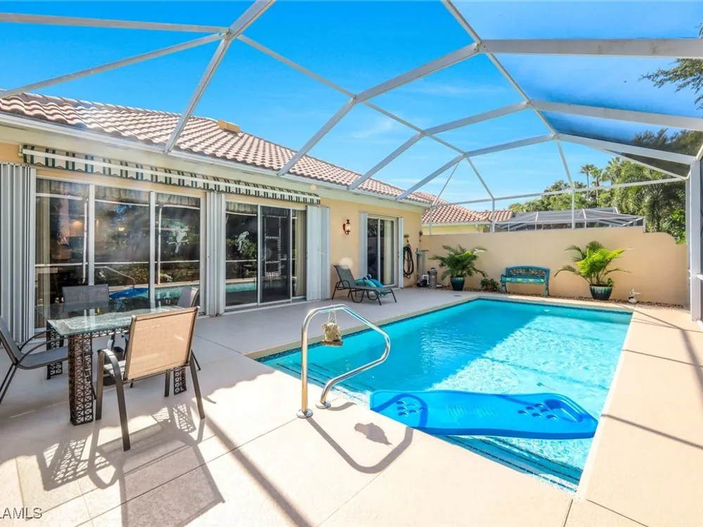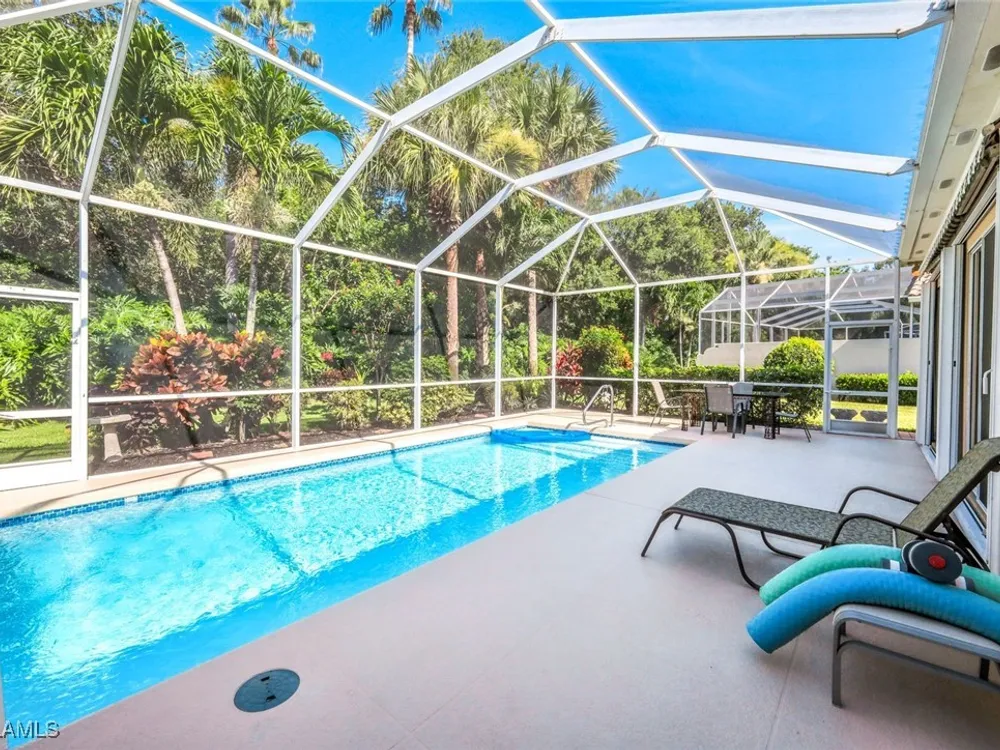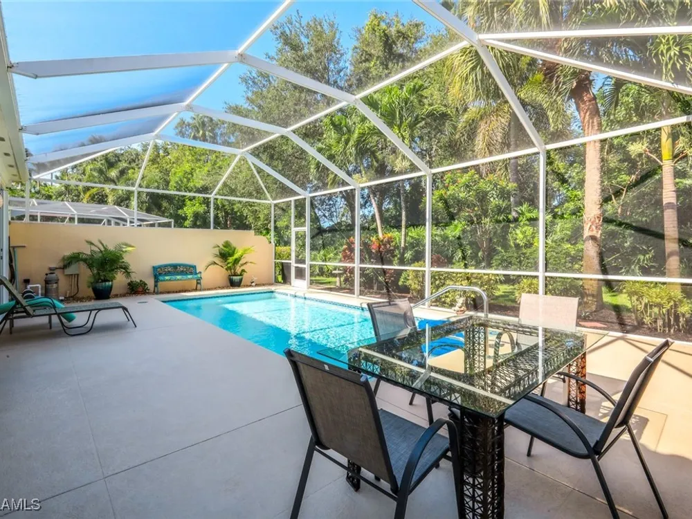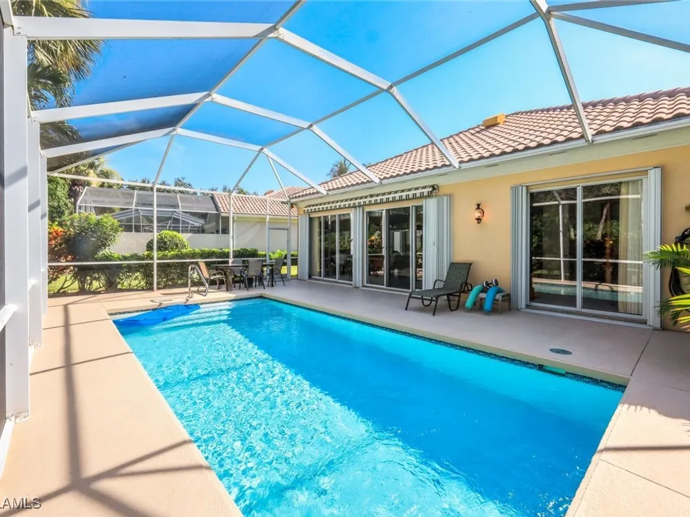 Feast your eyes on this Gorgeous Oakmont model 3 Bedroom and a Den home with the rarely available Extended Living area, which is conveniently located near the Front Entry Gate and only a short stroll to the Town Center. This home features tile throughout the living areas and a high-quality wood floor in the chef’s kitchen complete with stainless appliances and Corian countertops. Enjoy entertaining your family and friends by your own private heated pool adorned by lush tropical landscaping. There are upgraded accordion shutters for your peace of mind. The Washer and Dryer and Refrigerator were purchased in 2025. Located in one of Naples' most sought-after neighborhoods, residents enjoy access to exclusive amenities including Resort style pool, lap pool, Towncenter, Tennis, pickleball, bocce, fitness center, Restaurant, Beauty and Nail Salons, Car Wash, Gas Station and Post Office. Close to Naples’ sandy beaches, wonderful shopping, and dining, every convenience is within reach. LOW FEES include Amenities Galore, Landscape Care and HDTV and High-Speed Internet. Relax and enjoy the Naples lifestyle, come and see for yourself what Resort Living is like.