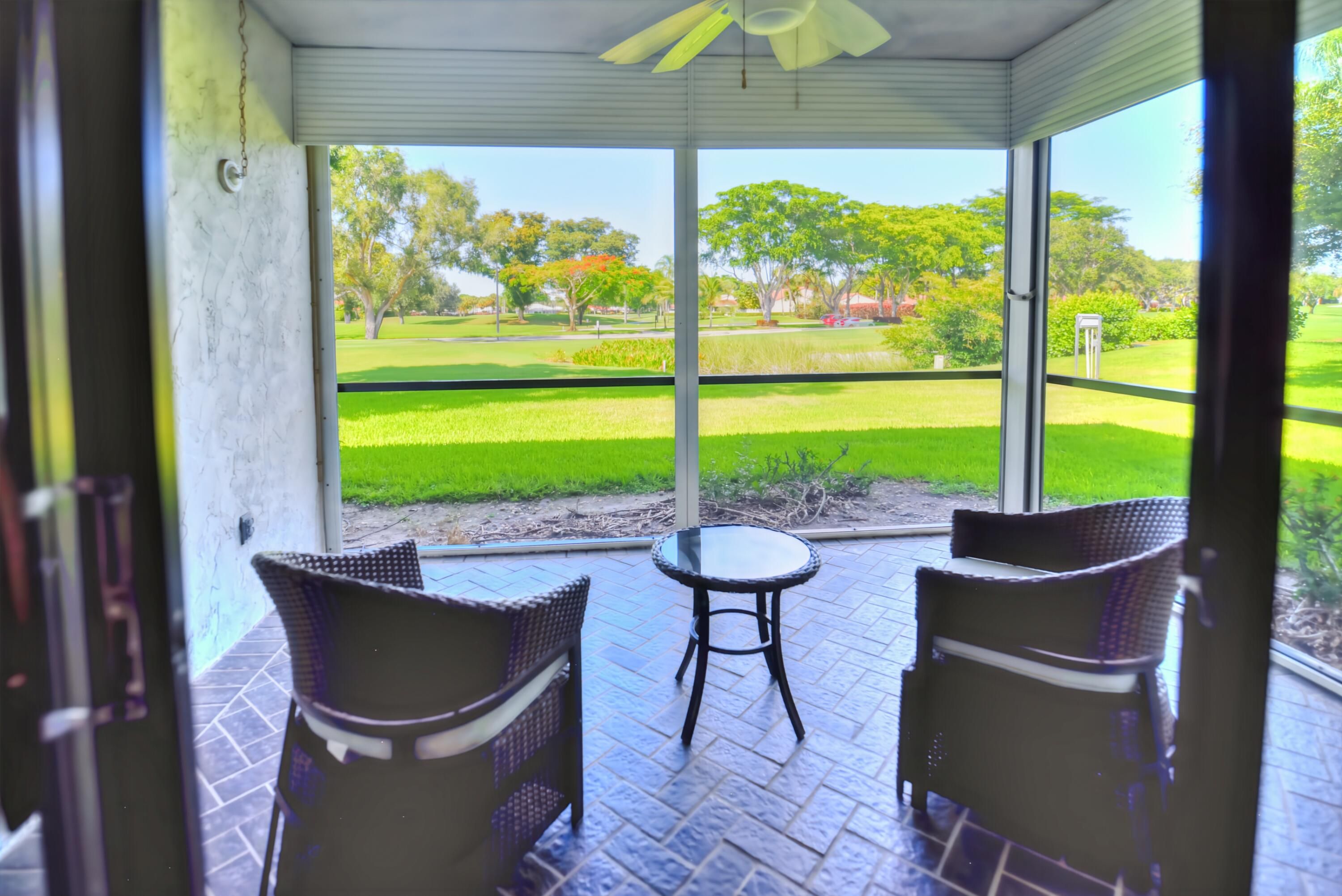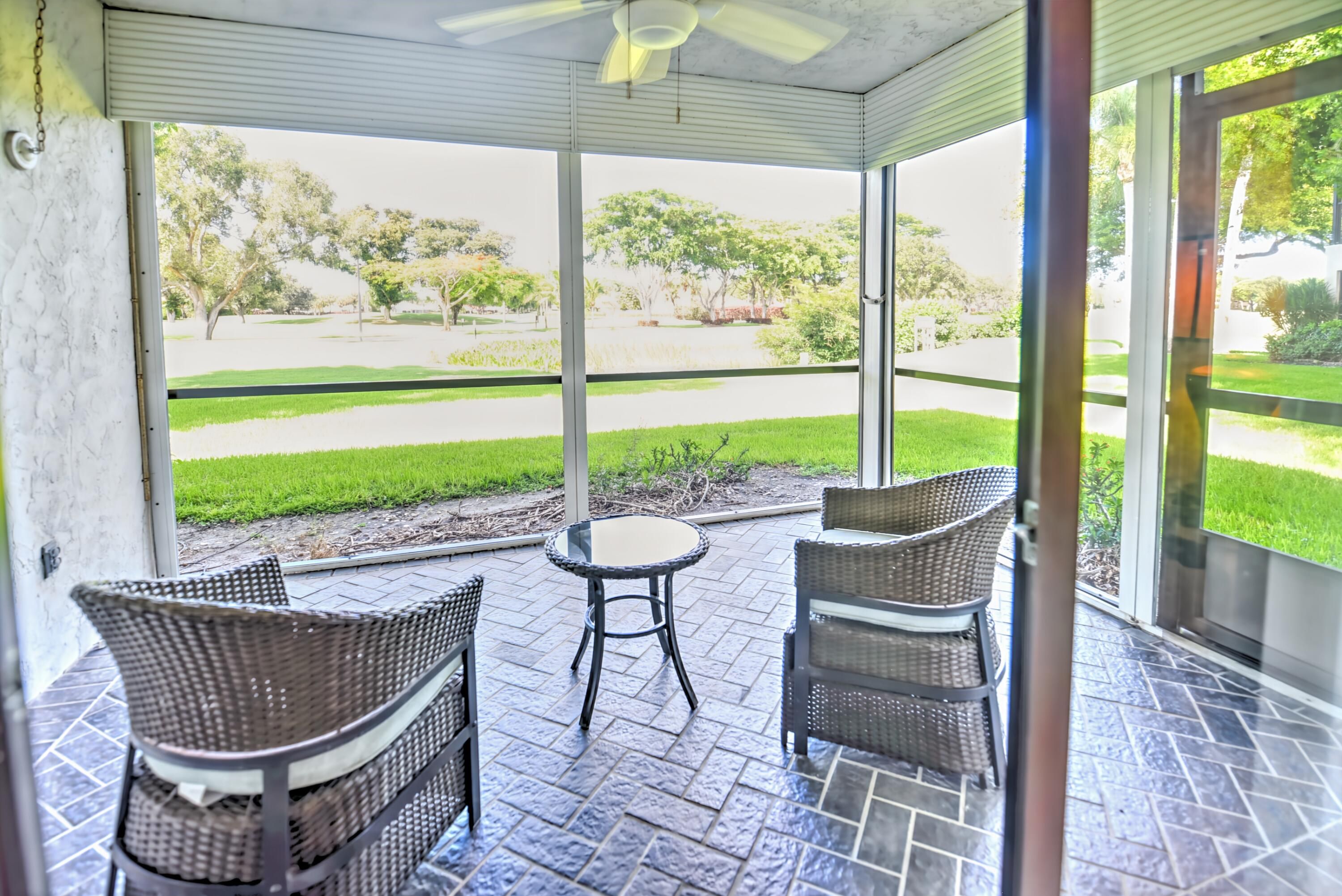 Welcome to Hunters Run . The club has every amenity for perfect resort living. Play our 3 18 hole golf courses, pickleball, tennis, fitness center, 7 dining venues and the friendliest members in south Florida. Something all day to put a smile on your face!!!! Lovely main level corner unit on the golf course with a side patio for golf cart and barbeque dining. Includes 2 bedrooms and 2 baths, dining area , eat in kitchen and screened lanai. Furnished and ready for you.