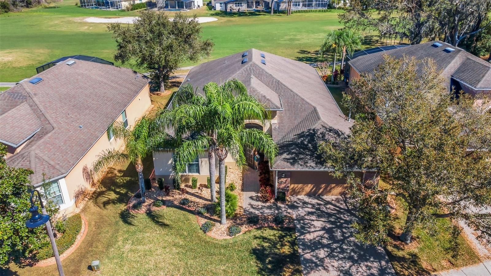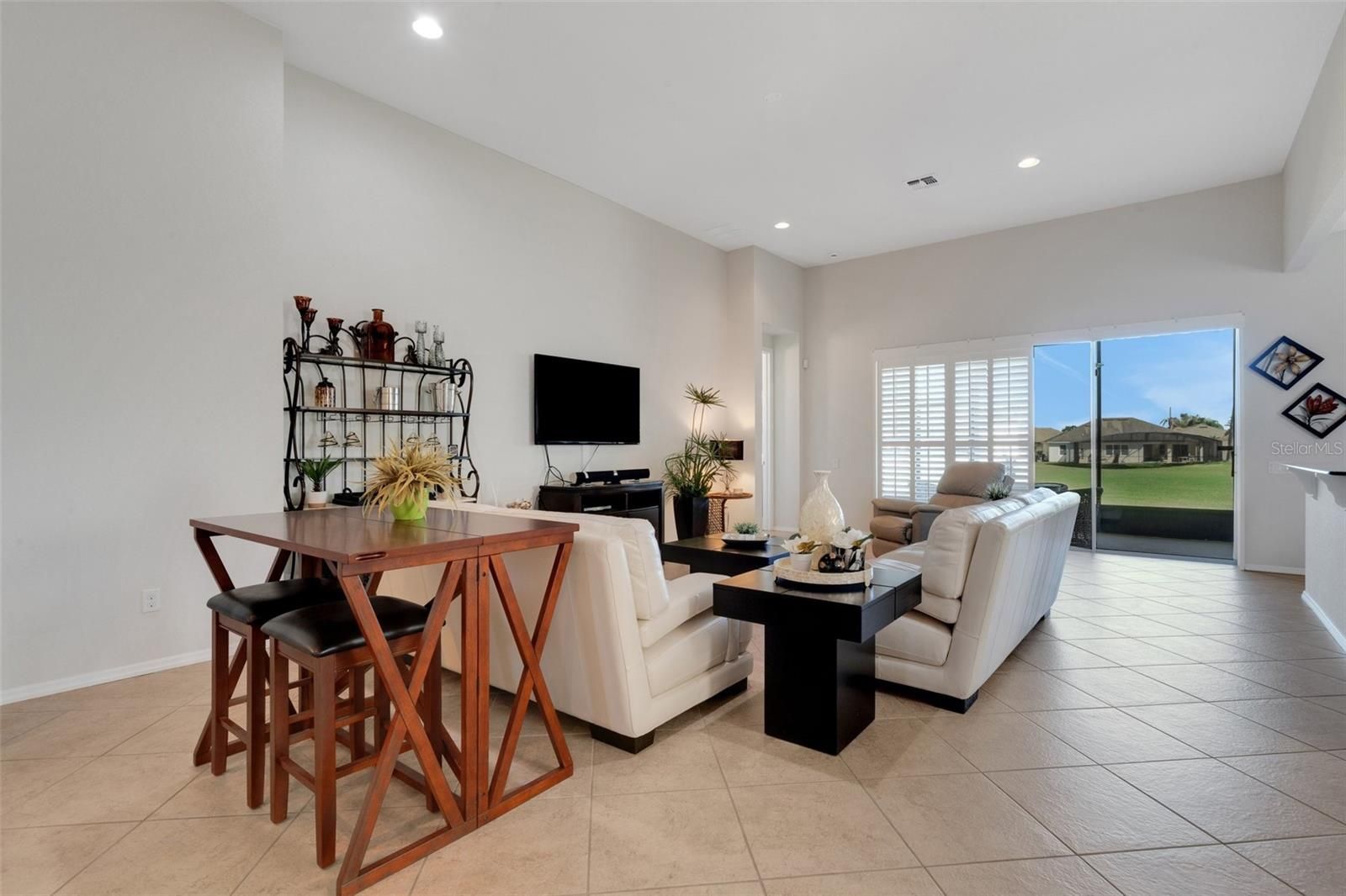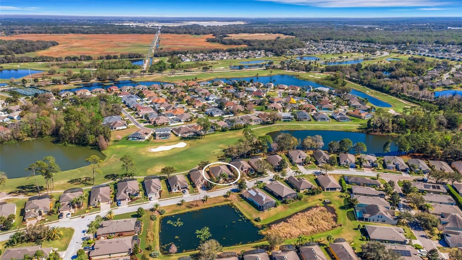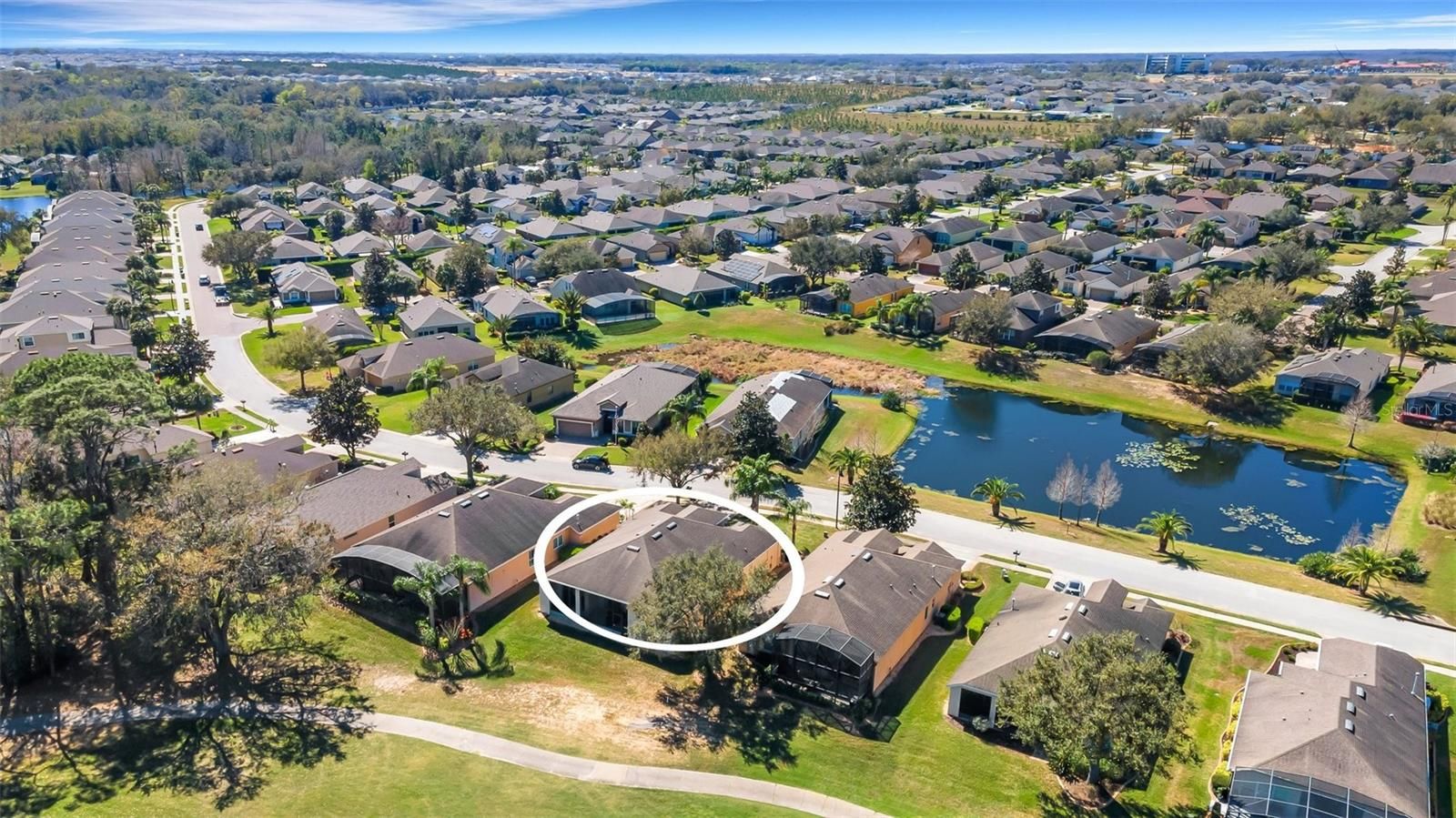 This home located in the desired community of Del Webb Orlando offers a serene and peaceful setting located on a premium lot, and is being offered TURNKEY. Sit back and relax in the large screened lanai oasis away from the hustle and bustle of I-4 with a view of the golf course and a pond. When you walk into this Viscaya floor plan through the screened front porch, you will find a spacious great room with 12 foot ceilings and large pocket sliding doors offering you a view to remember. The kitchen located off the large great room features stainless steel appliances, upgraded cabinets with crown molding and pull-outs, granite countertops and a large pantry. This home also includes 3 bedrooms, a den and a formal dining room. The primary bath retreat includes dual sinks, a tiled shower with frameless glass doors and a tub to soak your days worries away. The guest bedrooms and bathrooms are located in the front of the home separate from the primary suite offering privacy. Additional upgrades include updated landscaping complete with concrete curbing, upgraded can lighting, plantation shutters and a new hot water heater. The $425 semi-annual HOA fee provides 24x7 staffed security gate and master association-owned private road maintenance. Adjacent to recently renovated 18-hole White Heron Golf Club. The $328 monthly Del Webb HOA fee includes lawn maintenance and exclusive access to resident-owned 30,000+ SF Montecito clubhouse and amenities. DEL WEBB ORLANDO is a 55+ community with a tavern, indoor walking track, fitness center, indoor and outdoor pools and spas with locker rooms and showers, billiards, ping pong, craft room, and a ballroom for special events. Outdoor activities include pickleball, tennis, bocce, basketball, shuffleboard, community gardening center, an outdoor amphitheater, large brick fire pit and large screened-in gazebo over the water. Miles of biking and walking trails within Ridgewood Lakes gated community. Located conveniently to shopping at Posner Park (4 miles), Disney World, Universal Studios, Orlando & Central FL entertainment nearby. Easy access to I-4, medical facilities, airports & Sunrail Station. Advent Health hospital is 3 miles away.