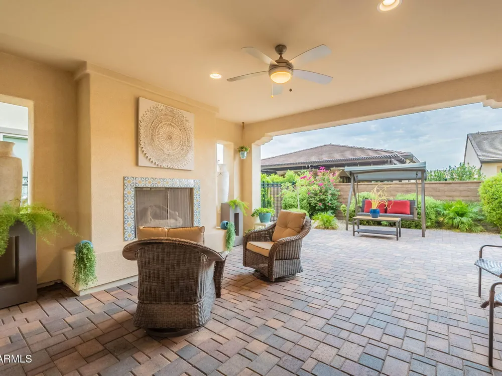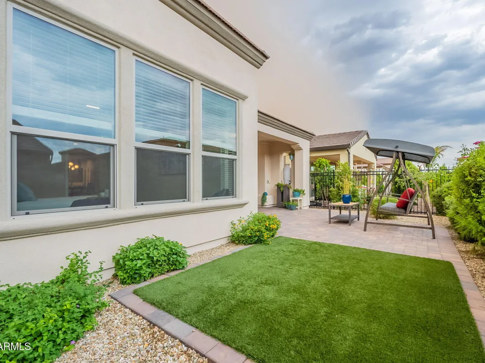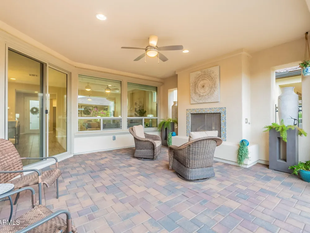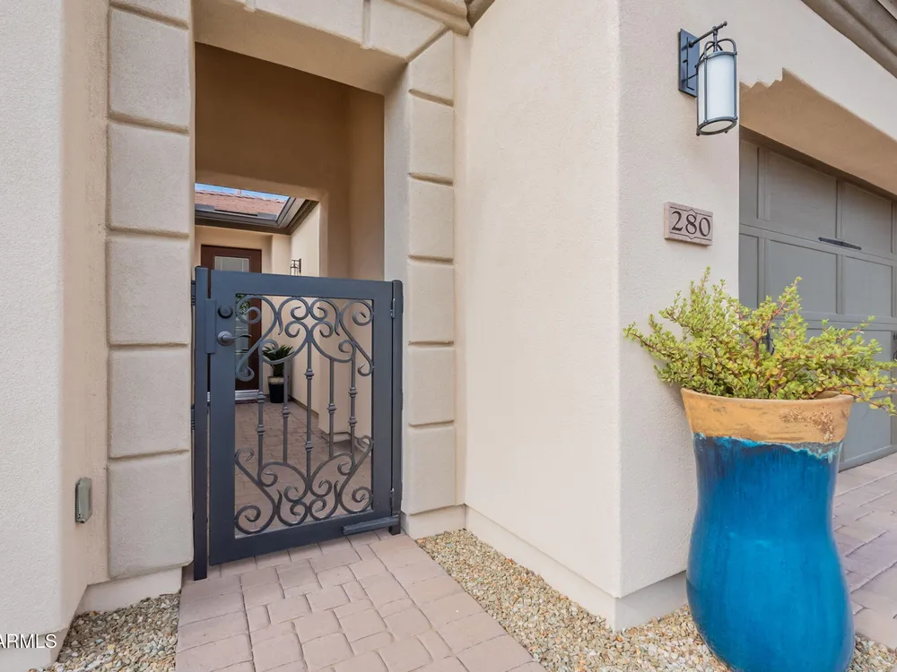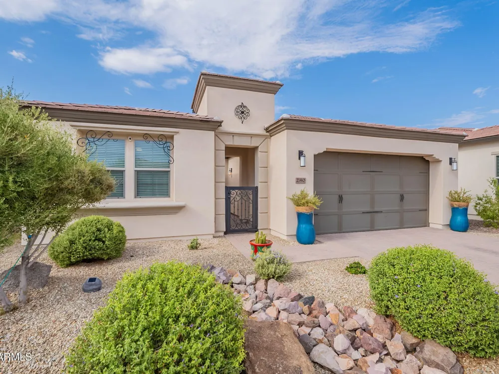 This stunning Cannes model is loaded with upgrades and designer touches throughout! From the moment you arrive, the custom front entry gate, spacious porch, and gorgeous Entry Brite front door make a striking first impression. Step inside this light and bright 2 BR + den home featuring an open kitchen with quartz counters, pendant lighting over the large island, custom soft-close drawers and pull-outs, plus upgraded lighting. The second bath is fully tiled, and the home offers ceiling fans, laundry sink in the smart space, and epoxy garage flooring with built-in cabinets. Outdoors, enjoy a private backyard with an extended fenced yard along with a covered patio featuring a tile-enhanced fireplace—perfect for entertaining! Encanterra Country Club offers 2 restaurants, multiple pools, championship golf, and countless activities. Luxury meets relaxation, welcome to The Good Life!