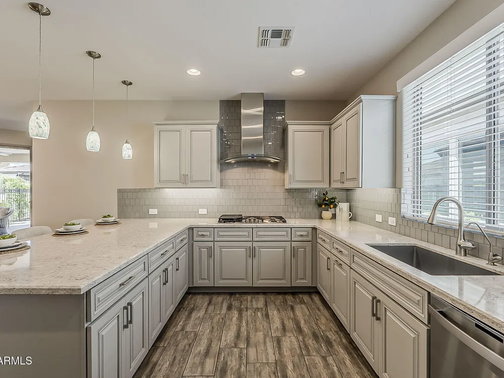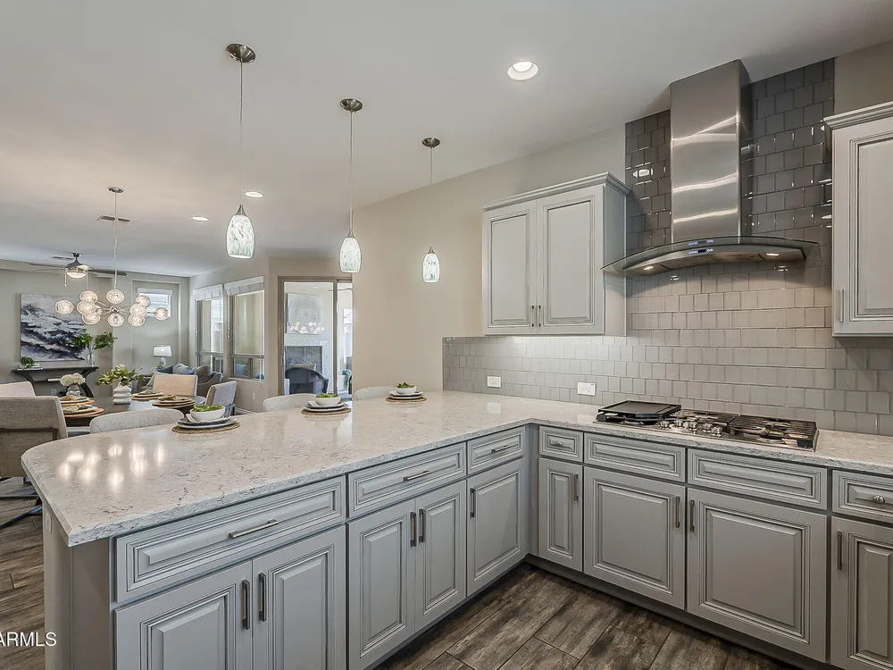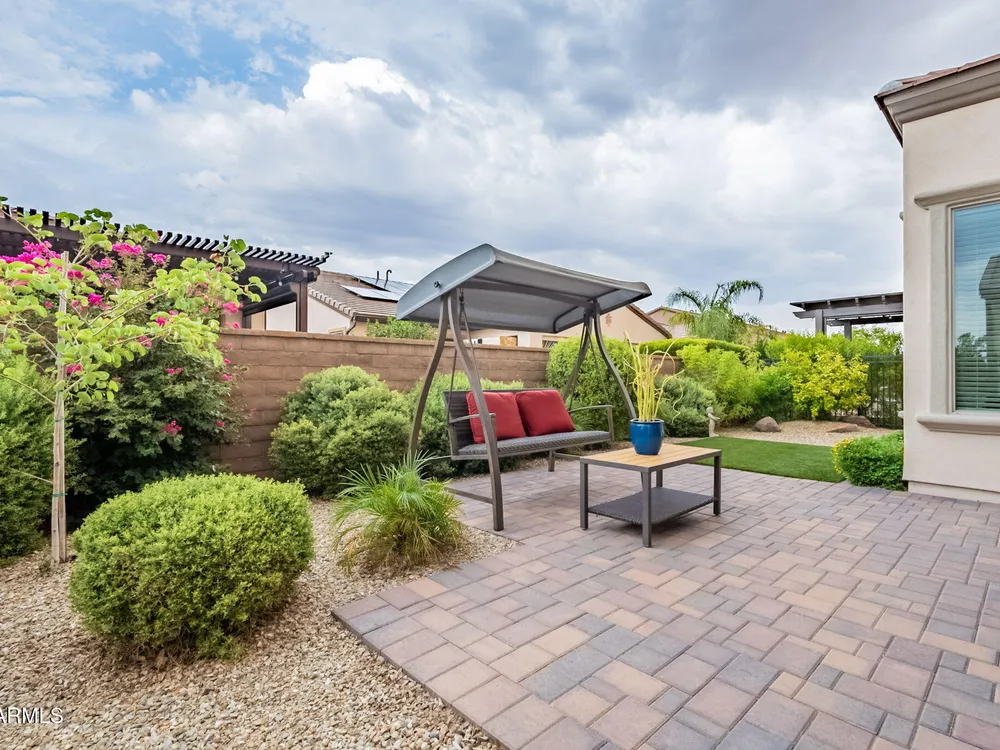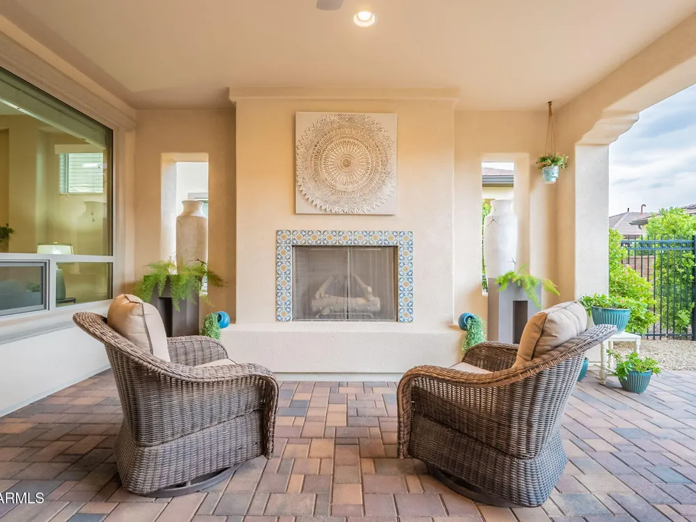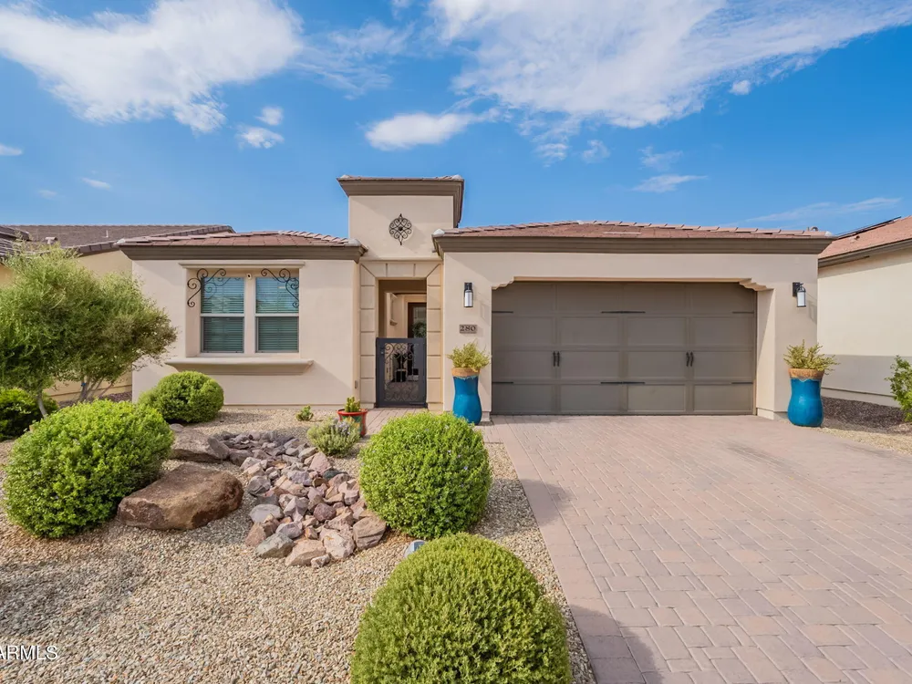 This stunning Cannes model is loaded with upgrades and designer touches throughout! From the moment you arrive, the custom front entry gate, spacious porch, and gorgeous Entry Brite front door make a striking first impression. Step inside this light and bright 2 BR + den home featuring an open kitchen with quartz counters, pendant lighting over the large island, custom soft-close drawers and pull-outs, plus upgraded lighting. The second bath is fully tiled, and the home offers ceiling fans, laundry sink in the smart space, and epoxy garage flooring with built-in cabinets. Outdoors, enjoy a private backyard with an extended fenced yard along with a covered patio featuring a tile-enhanced fireplace—perfect for entertaining! Encanterra Country Club offers 2 restaurants, multiple pools, championship golf, and countless activities. Luxury meets relaxation, welcome to The Good Life!