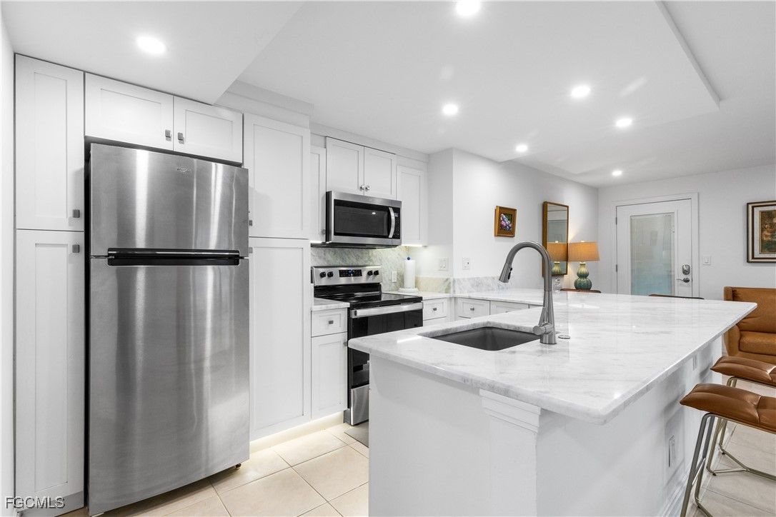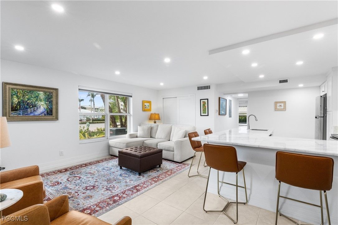 Just steps away from your front door to the beach. Via Miramar Beach is across the street. This first floor 1 bedroom totally updated condominium is in Gulf Bay Apts on Moorings Bay. Boat slips available to lease for quick boating to Gulf through Doctor's Pass. Low rise building gives more privacy than other high-rise condos. Totally updated condo comes furnished except for personal affects. Stainless steel appliances. Marble countertops. Washer and dryer are located in closet in living rooom. Eat in bar. Windows look west between 2 buildings to the Gulf across the street. Bedroom has walk-in closet. Internet and cable are included in maintenance fees. Quiet location.