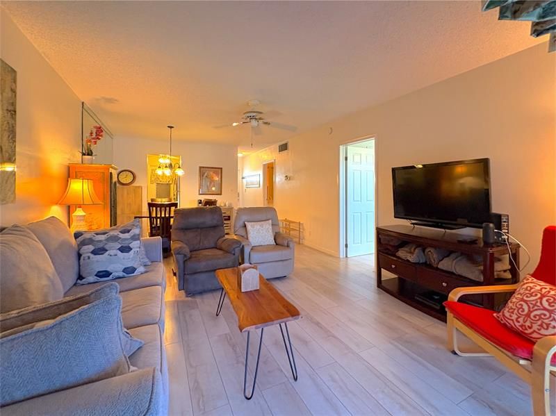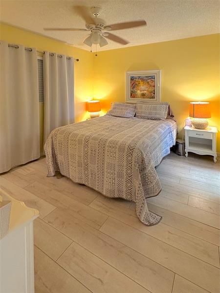 Do not miss this beautifully maintained 2BR/1BA 2nd-floor condo with stunning golf course and lake views from the glass-enclosed Florida room with accordion shutters. Freshly painted, tastefully furnished, and offered turnkey (or unfurnished). Features include an updated kitchen with stainless steel appliances (2017), hurricane windows, laminate/tile floors, king bed with walk-in closet in master, new queen mattress in guest room, water heater (2017), AC (2021), and roof (2015). Community offers 2 pools, shuffleboard, petanque, and BBQ areas. Minutes to shops, dining, and beaches.