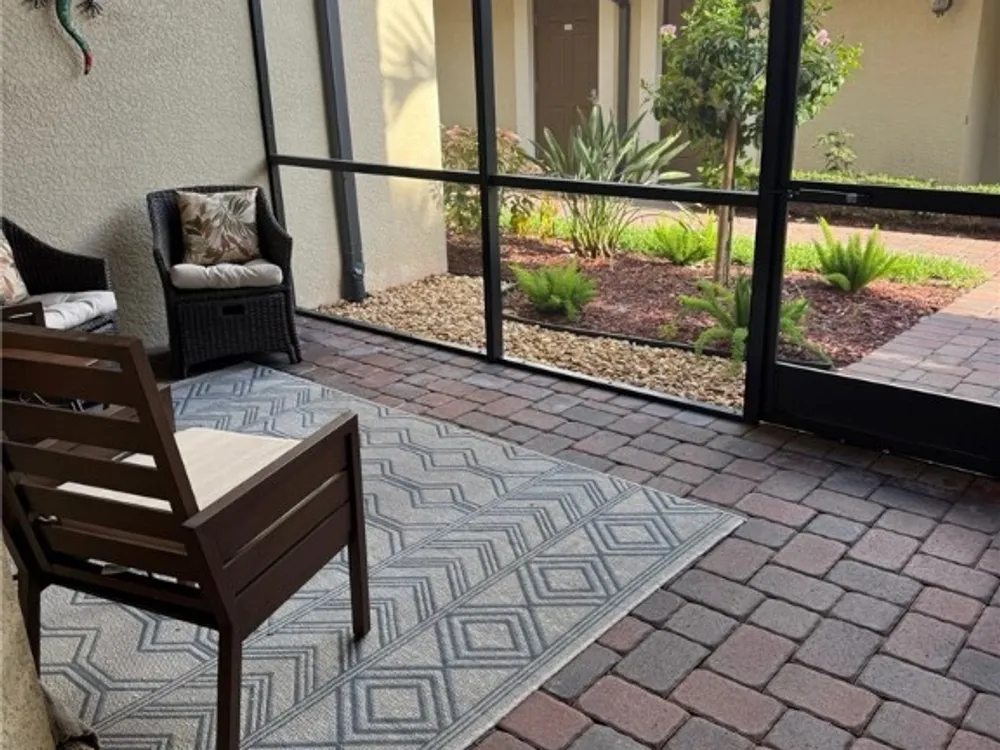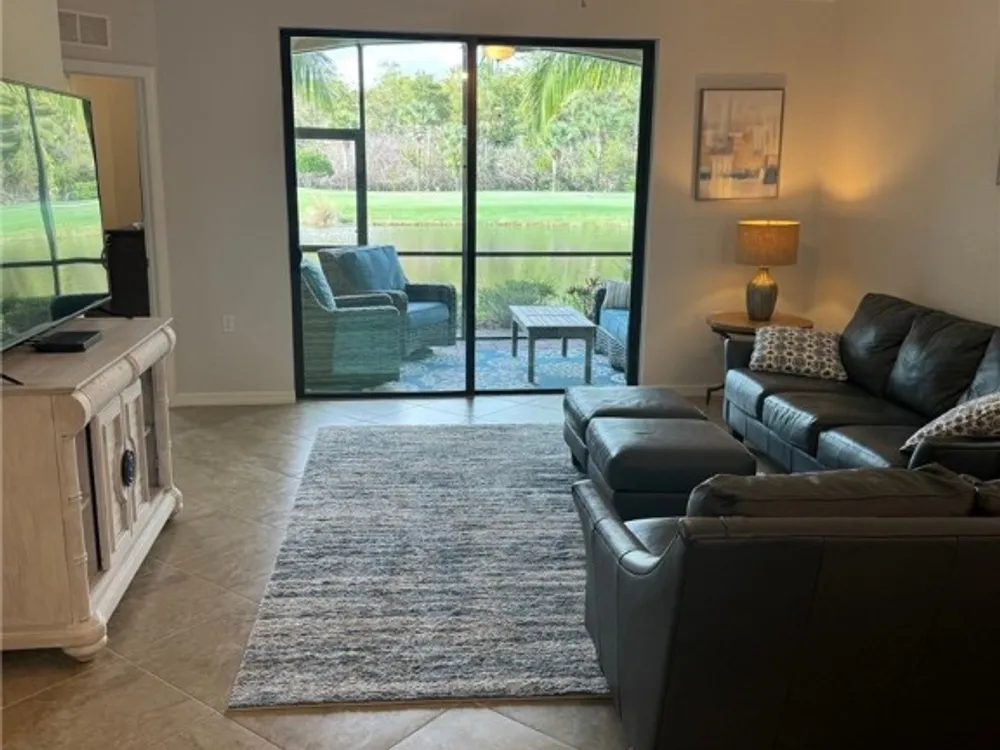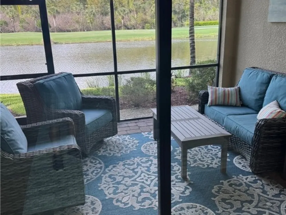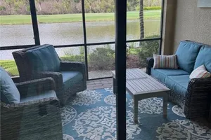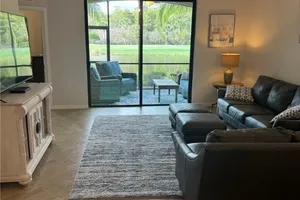 GOLF MEMBERSHIP INCLUDED! Step into this first floor Veranda offering 2 bedrooms plus a den, 2 bathrooms, laundry, 1 car garage, screened front and back lanai's overlooking water, 8th Hole and Reserve. This desired end unit has additional windows enhancing natural light, the 1,549 sq foot condo is being sold completely furnished and turnkey. This resort style community of Bonita National Golf & Country Club offers a zero entry pool/hot tub that includes full service from pool cafe. Three other pools. Spa, Sauna, Gym, Tennis Courts, Three Restaurants, and soon Bocci Ball and Pickleball.
