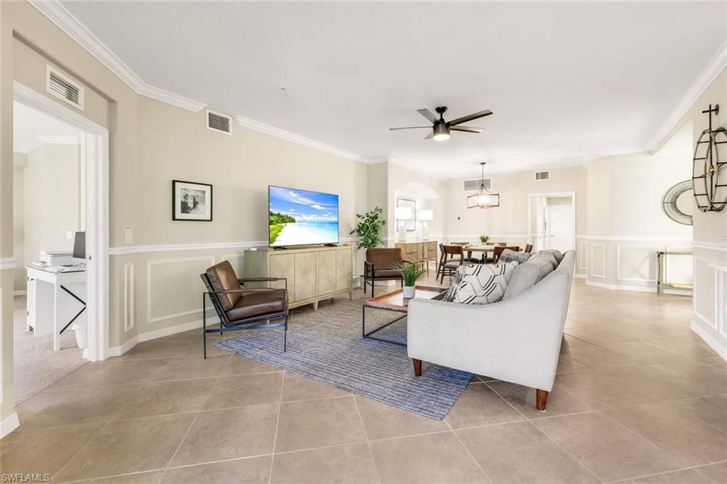 SOCIAL MEMBERSHIP INCLUDED! Step into this beautifully appointed first-floor corner coach home, featuring three spacious bedrooms, two full baths, and a two-car attached garage. The moment you enter, you’ll appreciate the exquisite details—crown molding, elegant wainscoting, and diagonally laid tile flooring. The open Great Room floor plan is perfect for entertaining, while the kitchen is discreetly tucked behind a wall to keep your living spaces neat and inviting. The primary suite serves as a private retreat with dual walk-in closets and a luxurious bathroom featuring an oversized soaking tub, separate shower, and dual vanities. A split-bedroom design ensures privacy for guests with two additional bedrooms and a full bath. Enjoy casual meals or game nights in the charming breakfast nook, and host more formal gatherings in the defined dining area of the Great Room. Unwind on the spacious screened lanai overlooking tranquil wooded views for ultimate privacy. Tucked away on a quiet cul-de-sac, this home offers a peaceful setting to embrace the SWFL lifestyle. Residents have access to an amenity-rich center with a lagoon-style pool featuring a waterfall and lap lanes, poolside cabanas and café, a state-of-the-art fitness center, the U-Topia full-service spa and sauna, and a stunning clubhouse offering fine dining, game rooms, and meeting spaces.