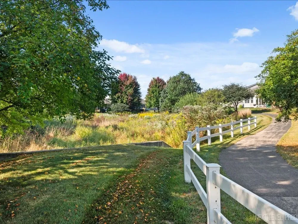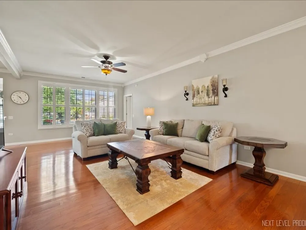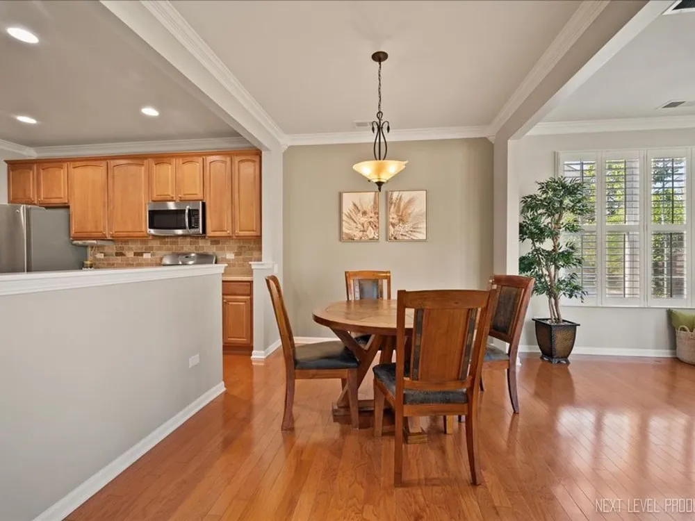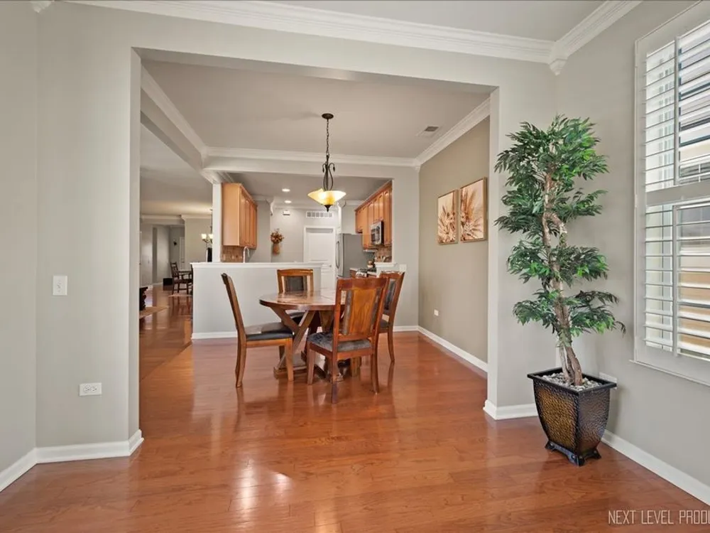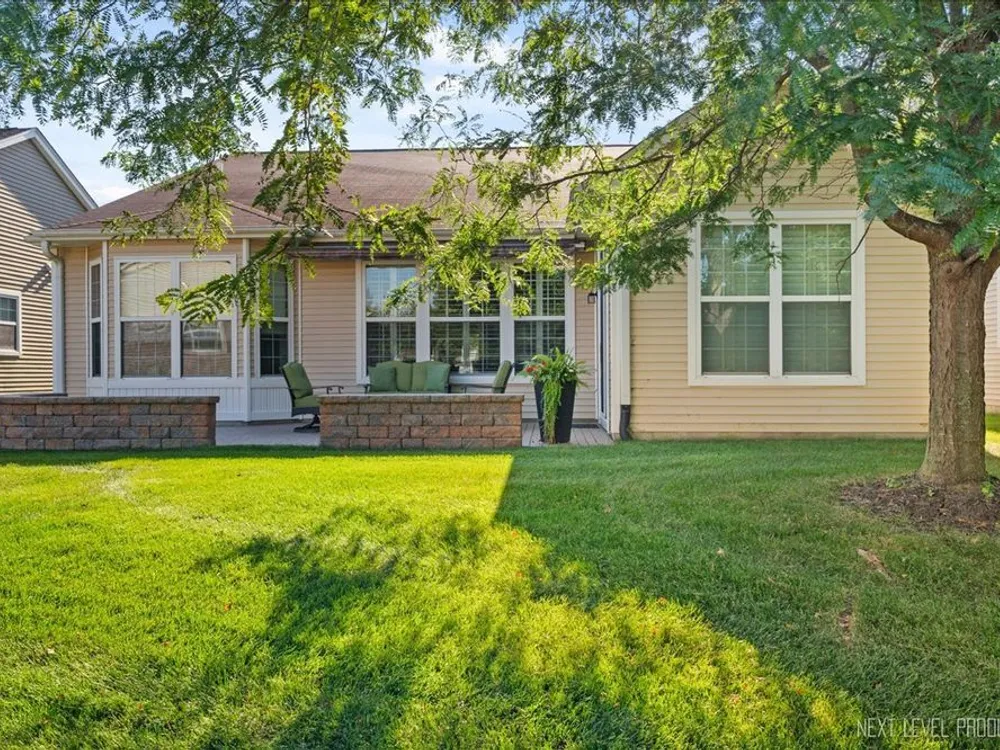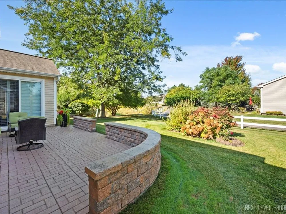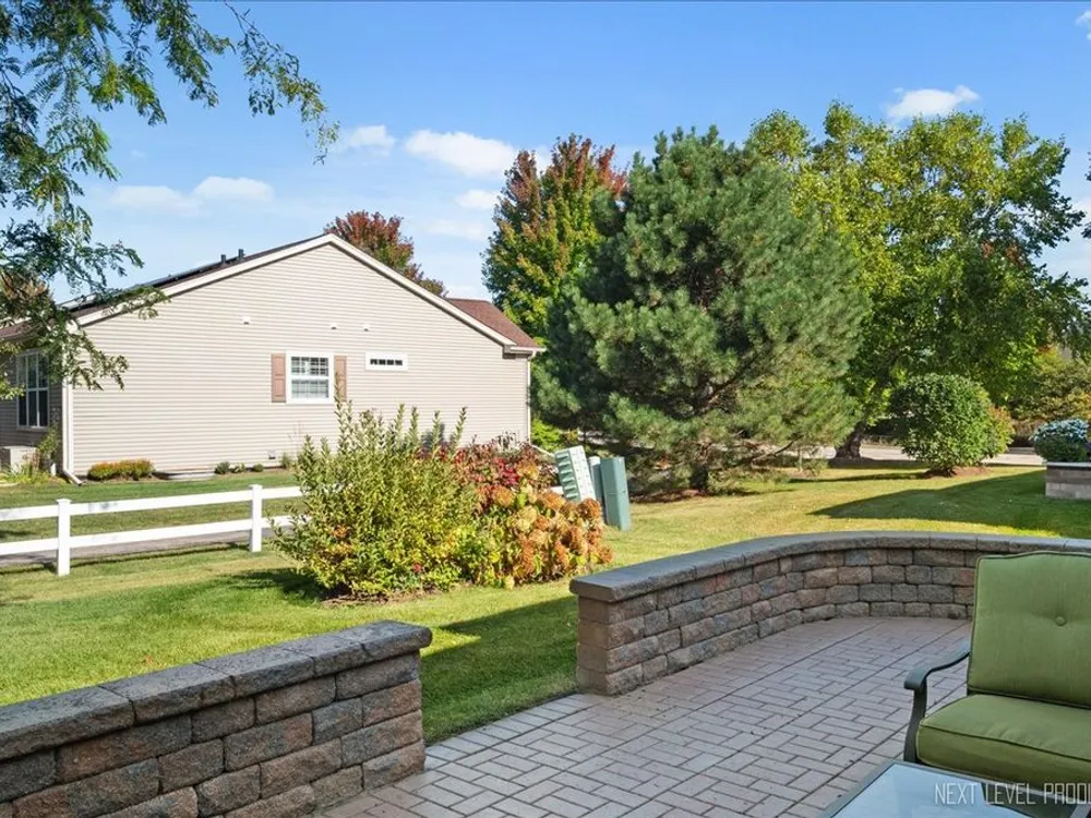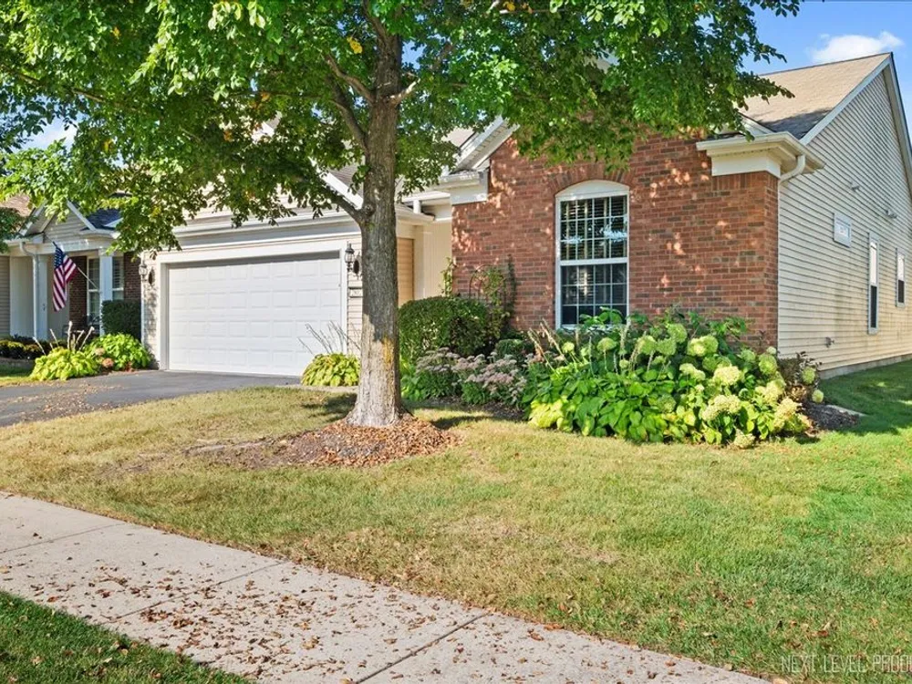 Welcome to this elegant Wilmette model home in Edgewater of Del Webb, which offers fabulous updates and a private location backing directly onto a walking path and nature area. The covered front porch welcomes guests to this lovely home with an open floor plan featuring hardwood floors, white trim with crown molding, panel molding, and custom window treatments, including plantation shutters. This Wilmette model boasts a formal foyer with a guest closet, a large combination great room and formal dining room, and a kitchen equipped with 42" maple cabinets, Corian countertops, stainless steel appliances, and a pantry cabinet. A separate eating area is open to a sunroom with access to a brick paver patio, complete with a SunSetter awning, offering beautiful views. The primary bedroom features a large bay window overlooking the backyard, a spacious walk-in closet, and a primary bath with dual vanities, a soaking tub, a separate shower, and a private commode. The front foyer leads to a hallway where you will find the second bedroom, perfect for guests, a second bath, and a large den that could also be used as a third bedroom. The utility room offers a washer and dryer with a full wall of cabinets above for ample storage, a utility sink, plus all the mechanicals (furnace & A/C new in 2020) are located in a private closet, hidden from view. There is an extended two-car finished garage with attic access, a beautiful epoxy floor, and two large wall storage cabinets, great for extra storage. Enjoy the professionally landscaped yard with a sprinkler system. Residents can enjoy all the amenities, including a clubhouse, indoor/outdoor pools, pickleball, bocce ball, a park, tennis courts, an exercise facility, walking paths, and plenty of social clubs. The location is also close to Randall Rd. shopping, restaurants, and I-90 for an easy commute. This move-in-ready home is in pristine condition and ready for a new owner!
