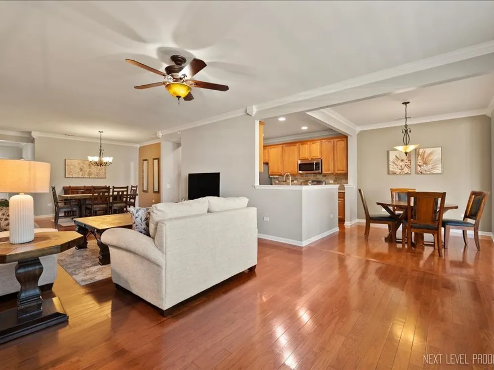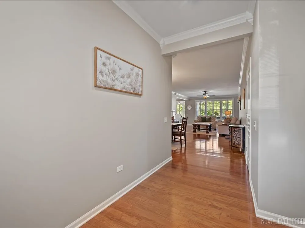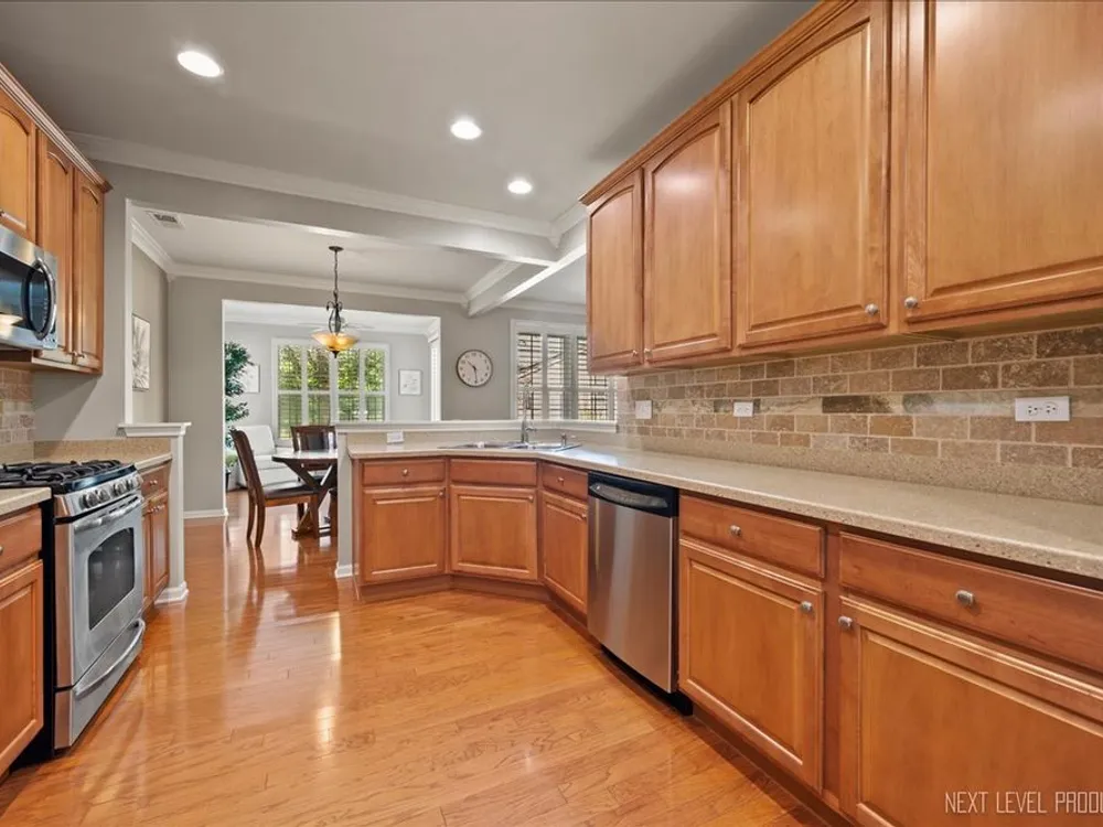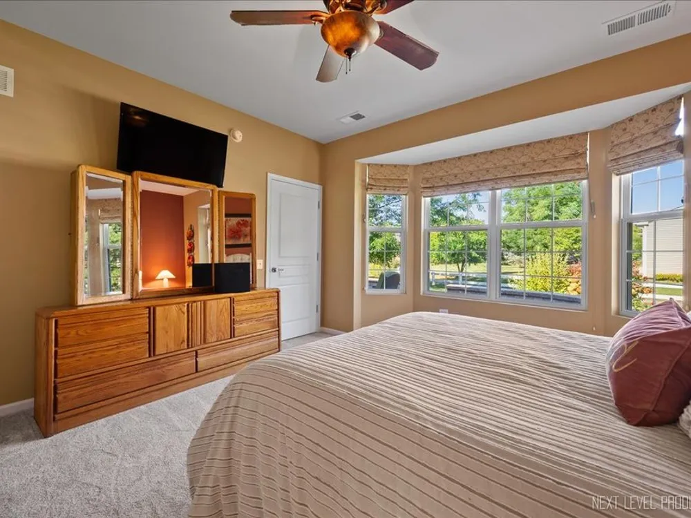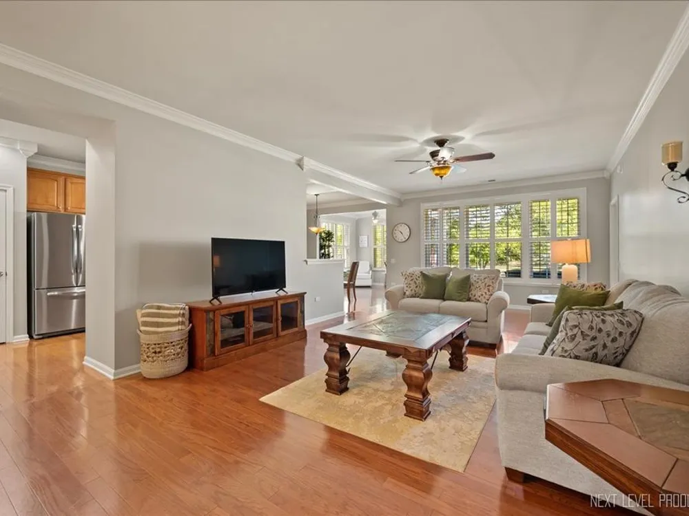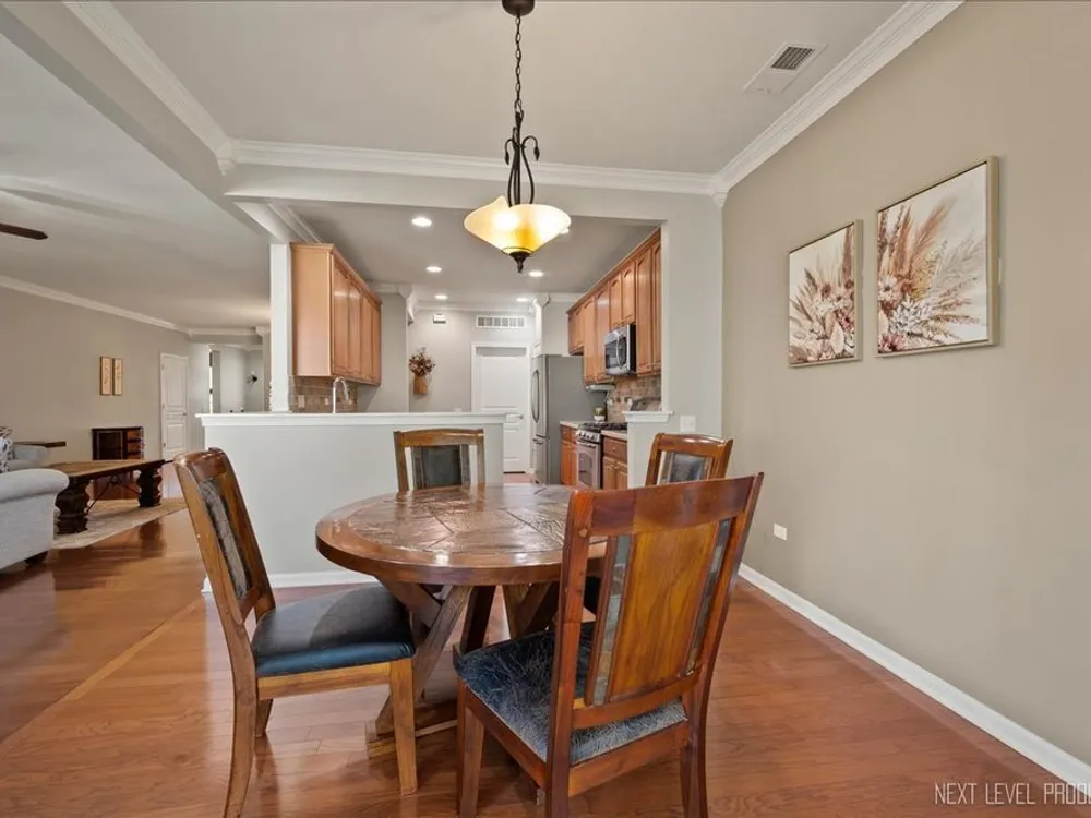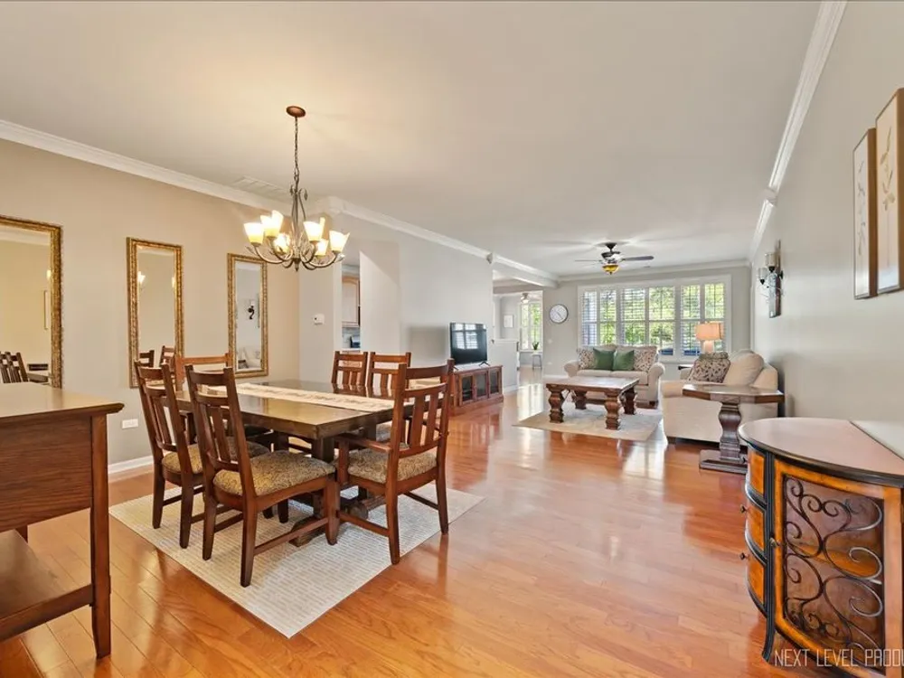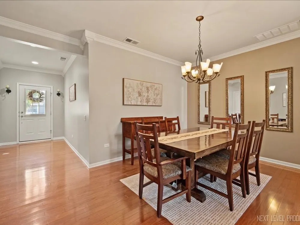 Welcome to this elegant Wilmette model home in Edgewater of Del Webb, which offers fabulous updates and a private location backing directly onto a walking path and nature area. The covered front porch welcomes guests to this lovely home with an open floor plan featuring hardwood floors, white trim with crown molding, panel molding, and custom window treatments, including plantation shutters. This Wilmette model boasts a formal foyer with a guest closet, a large combination great room and formal dining room, and a kitchen equipped with 42" maple cabinets, Corian countertops, stainless steel appliances, and a pantry cabinet. A separate eating area is open to a sunroom with access to a brick paver patio, complete with a SunSetter awning, offering beautiful views. The primary bedroom features a large bay window overlooking the backyard, a spacious walk-in closet, and a primary bath with dual vanities, a soaking tub, a separate shower, and a private commode. The front foyer leads to a hallway where you will find the second bedroom, perfect for guests, a second bath, and a large den that could also be used as a third bedroom. The utility room offers a washer and dryer with a full wall of cabinets above for ample storage, a utility sink, plus all the mechanicals (furnace & A/C new in 2020) are located in a private closet, hidden from view. There is an extended two-car finished garage with attic access, a beautiful epoxy floor, and two large wall storage cabinets, great for extra storage. Enjoy the professionally landscaped yard with a sprinkler system. Residents can enjoy all the amenities, including a clubhouse, indoor/outdoor pools, pickleball, bocce ball, a park, tennis courts, an exercise facility, walking paths, and plenty of social clubs. The location is also close to Randall Rd. shopping, restaurants, and I-90 for an easy commute. This move-in-ready home is in pristine condition and ready for a new owner!