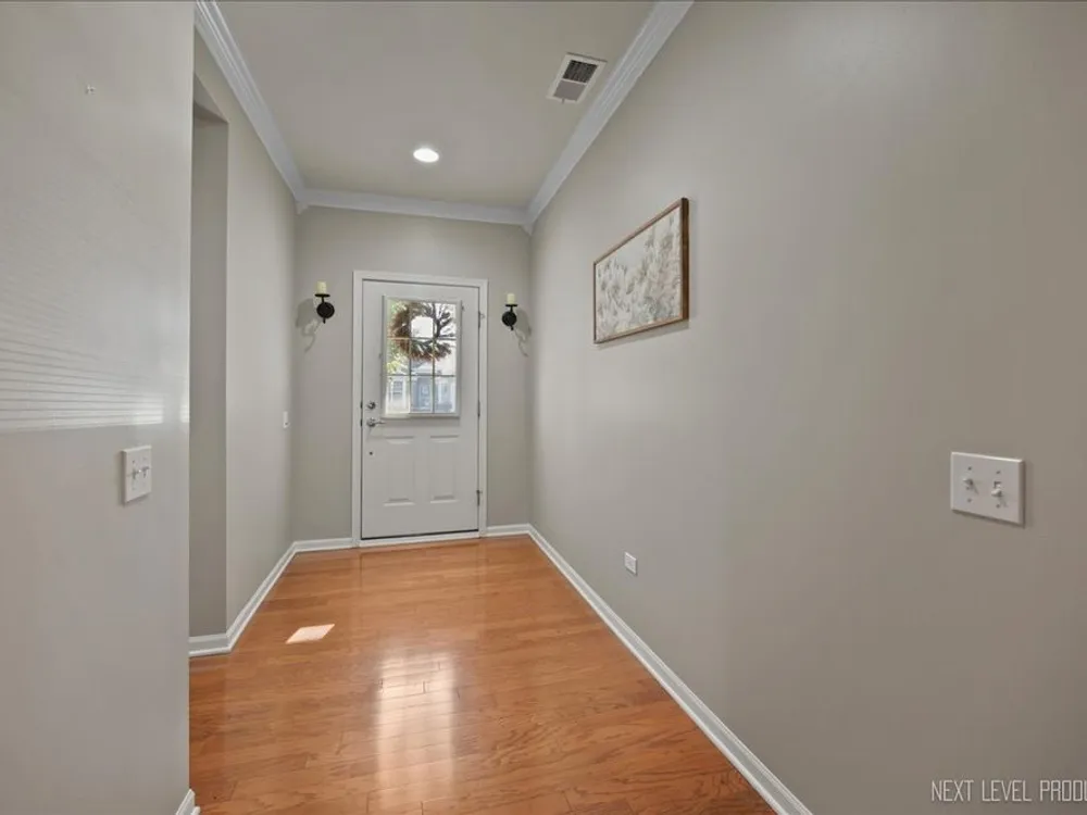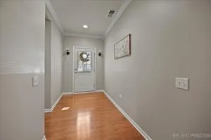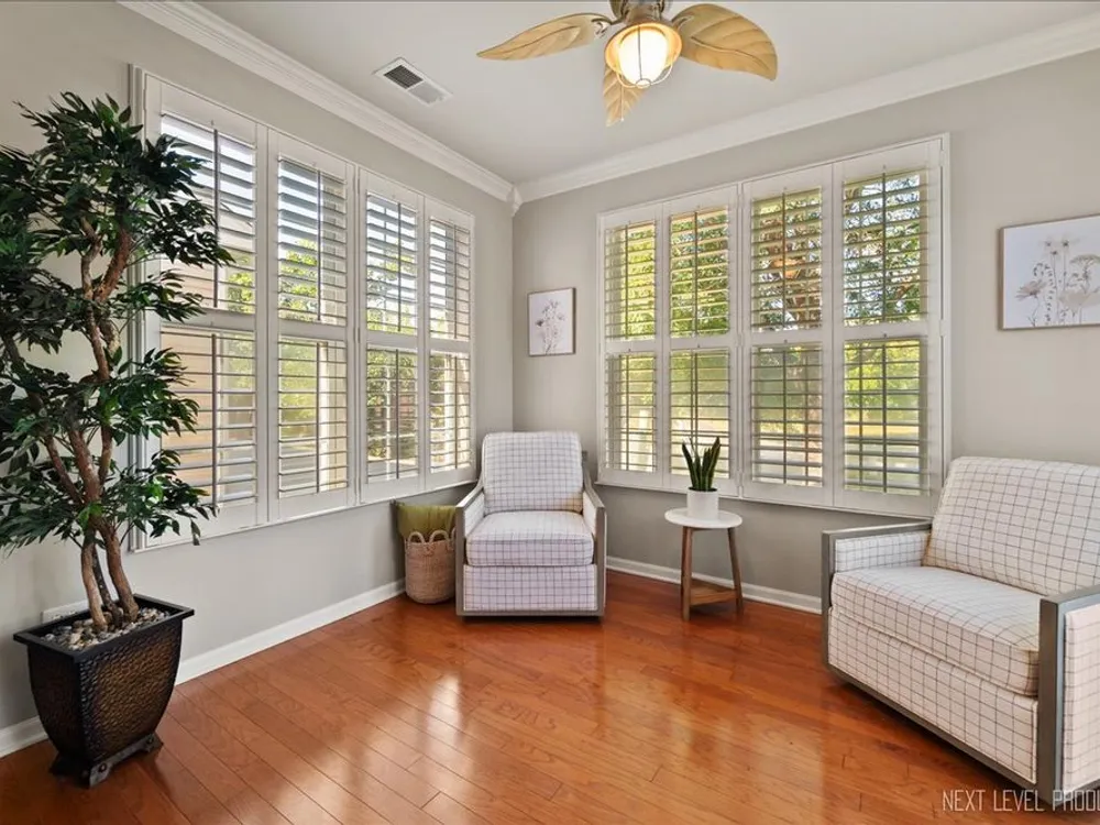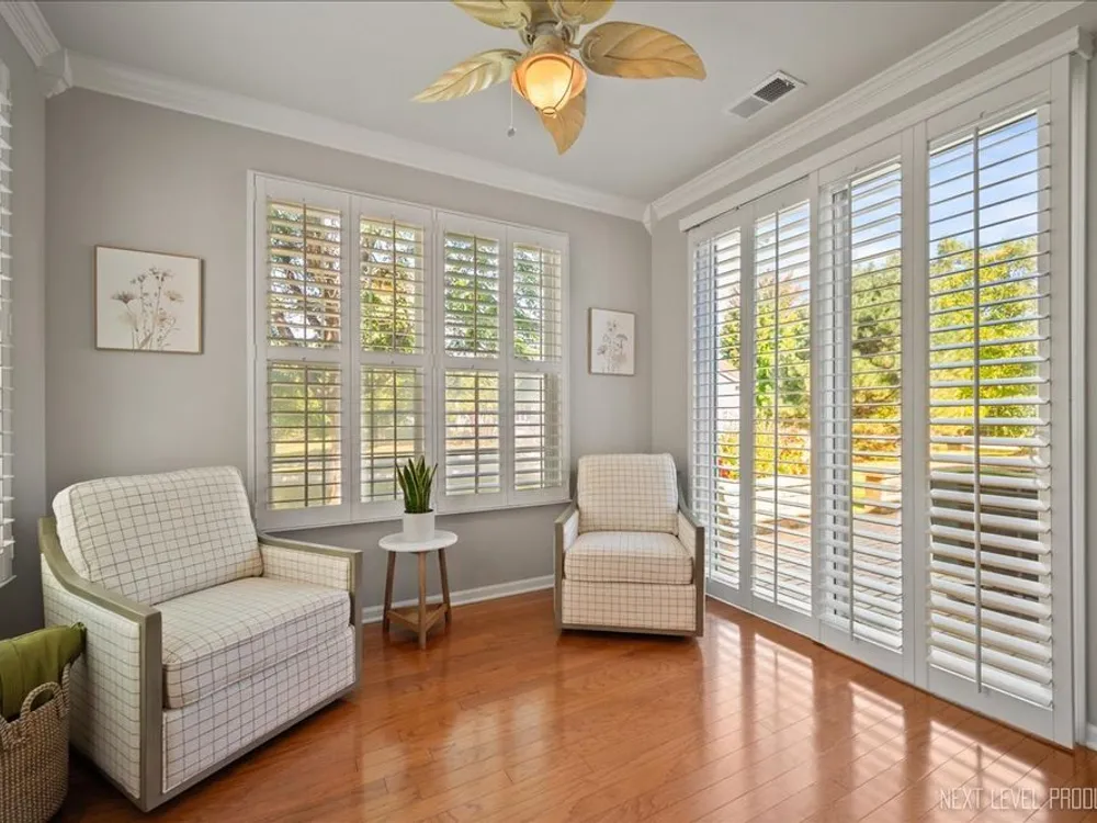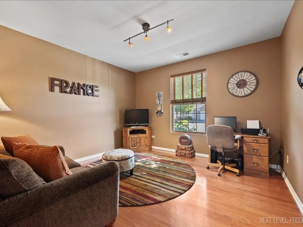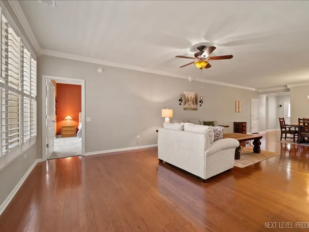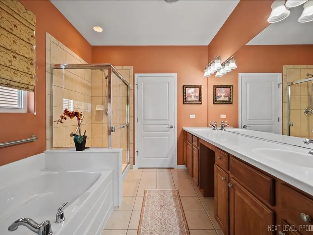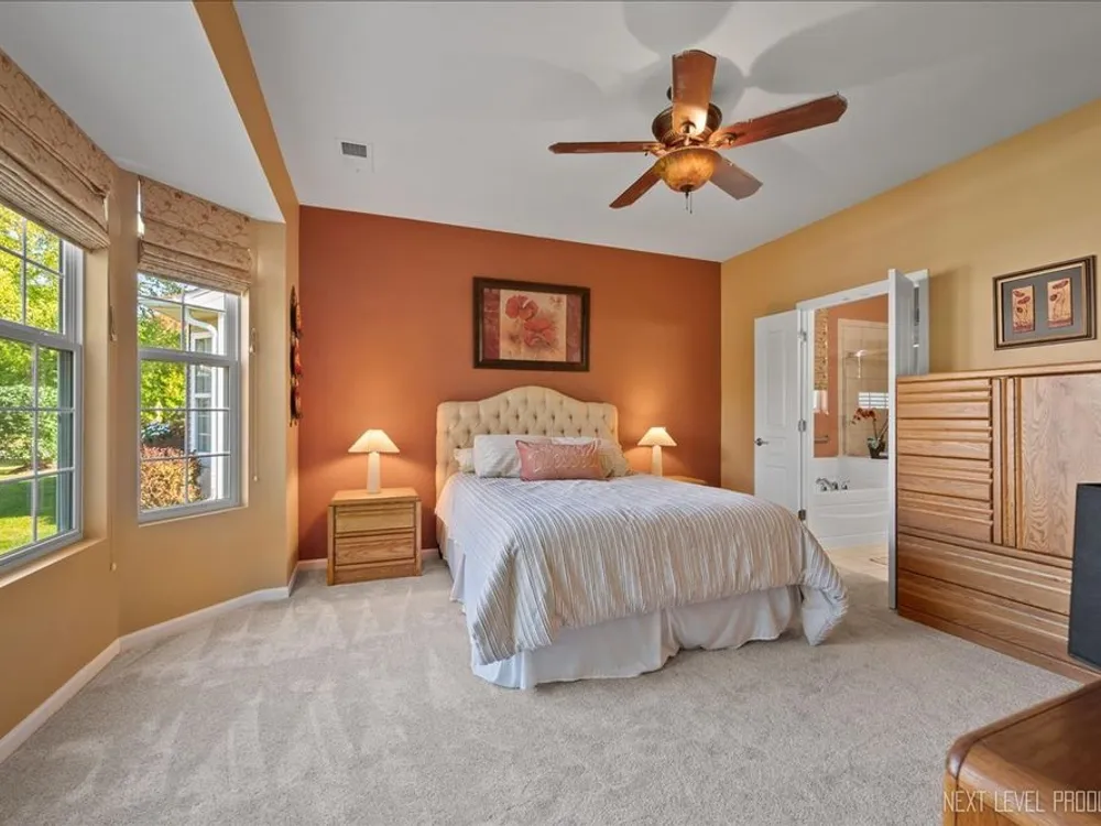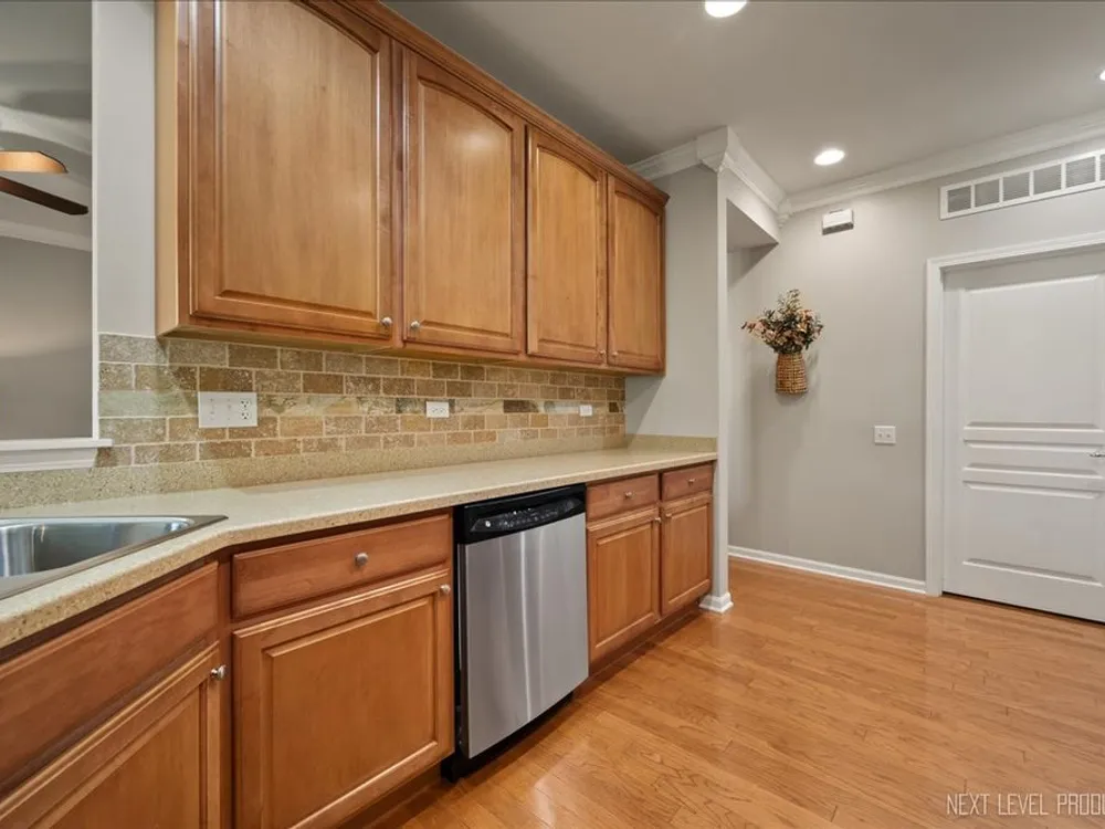 Welcome to this elegant Wilmette model home in Edgewater of Del Webb, which offers fabulous updates and a private location backing directly onto a walking path and nature area. The covered front porch welcomes guests to this lovely home with an open floor plan featuring hardwood floors, white trim with crown molding, panel molding, and custom window treatments, including plantation shutters. This Wilmette model boasts a formal foyer with a guest closet, a large combination great room and formal dining room, and a kitchen equipped with 42" maple cabinets, Corian countertops, stainless steel appliances, and a pantry cabinet. A separate eating area is open to a sunroom with access to a brick paver patio, complete with a SunSetter awning, offering beautiful views. The primary bedroom features a large bay window overlooking the backyard, a spacious walk-in closet, and a primary bath with dual vanities, a soaking tub, a separate shower, and a private commode. The front foyer leads to a hallway where you will find the second bedroom, perfect for guests, a second bath, and a large den that could also be used as a third bedroom. The utility room offers a washer and dryer with a full wall of cabinets above for ample storage, a utility sink, plus all the mechanicals (furnace & A/C new in 2020) are located in a private closet, hidden from view. There is an extended two-car finished garage with attic access, a beautiful epoxy floor, and two large wall storage cabinets, great for extra storage. Enjoy the professionally landscaped yard with a sprinkler system. Residents can enjoy all the amenities, including a clubhouse, indoor/outdoor pools, pickleball, bocce ball, a park, tennis courts, an exercise facility, walking paths, and plenty of social clubs. The location is also close to Randall Rd. shopping, restaurants, and I-90 for an easy commute. This move-in-ready home is in pristine condition and ready for a new owner!