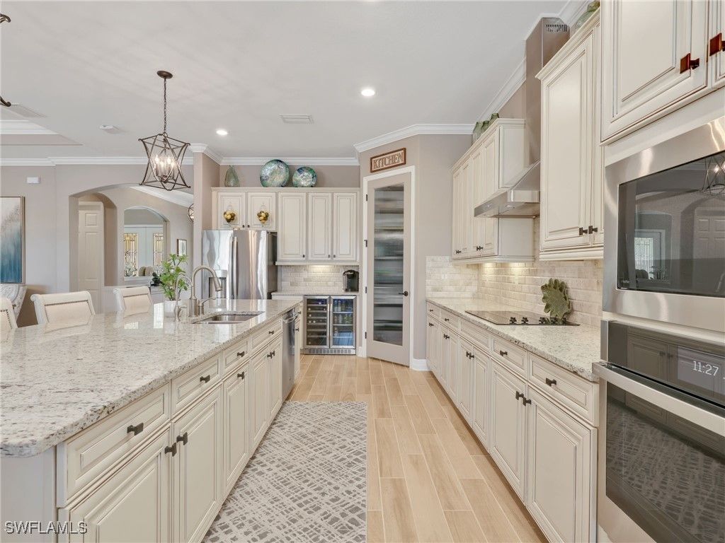 Exquisite Summerville Lake View Home in Bonita National Golf & Country Club! This beautifully upgraded 3-bedroom plus den, 3-bath, 3-car garage home offers resort-style living at its finest. Outside, enjoy a heated saltwater pool and spa, summer kitchen with stonework, wood ceiling lanai with lighting, sealed driveway and lanai, and lush custom landscaping with added drainage and gutters. Inside, this fully integrated Google Smart Home features plank tile flooring, fresh interior paint, plantation shutters, custom drapery, designer lighting, and custom closets throughout. The kitchen impresses with upgraded cabinetry, stainless range hood, under-counter wine cooler, custom backsplash, and wainscoting in the formal dining area. The living room showcases a shiplap ceiling, custom entertainment wall with fireplace. The primary suite is a true retreat with a custom ceiling, electronic shade, dual closets, and an elegant bath featuring his and her vanities, a soaking tub, a separate glass shower, and framed mirrors. Guest suites feature crown moulding, custom lighting, and tile to ceiling. The home is equipped with a Kinetico whole-house water filtration system, plus reverse osmosis at the kitchen sink for ultra-clean drinking water. The garage offers epoxy floors, insulated doors, custom cabinetry, attic storage, and an HVAC air scrubber. Enjoy the amenities of Bonita National, including an 18-hole championship golf course, resort-style pool with waterfall and cabanas, full-service spa, fitness center, tennis courts, fine and casual dining, and a lively social calendar. This home is one of the most extensively upgraded Summerville models in Bonita National—move-in ready and truly exceptional.
