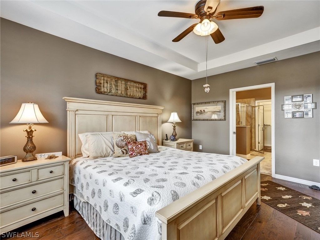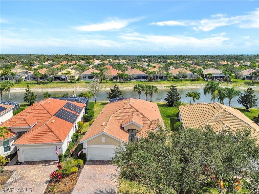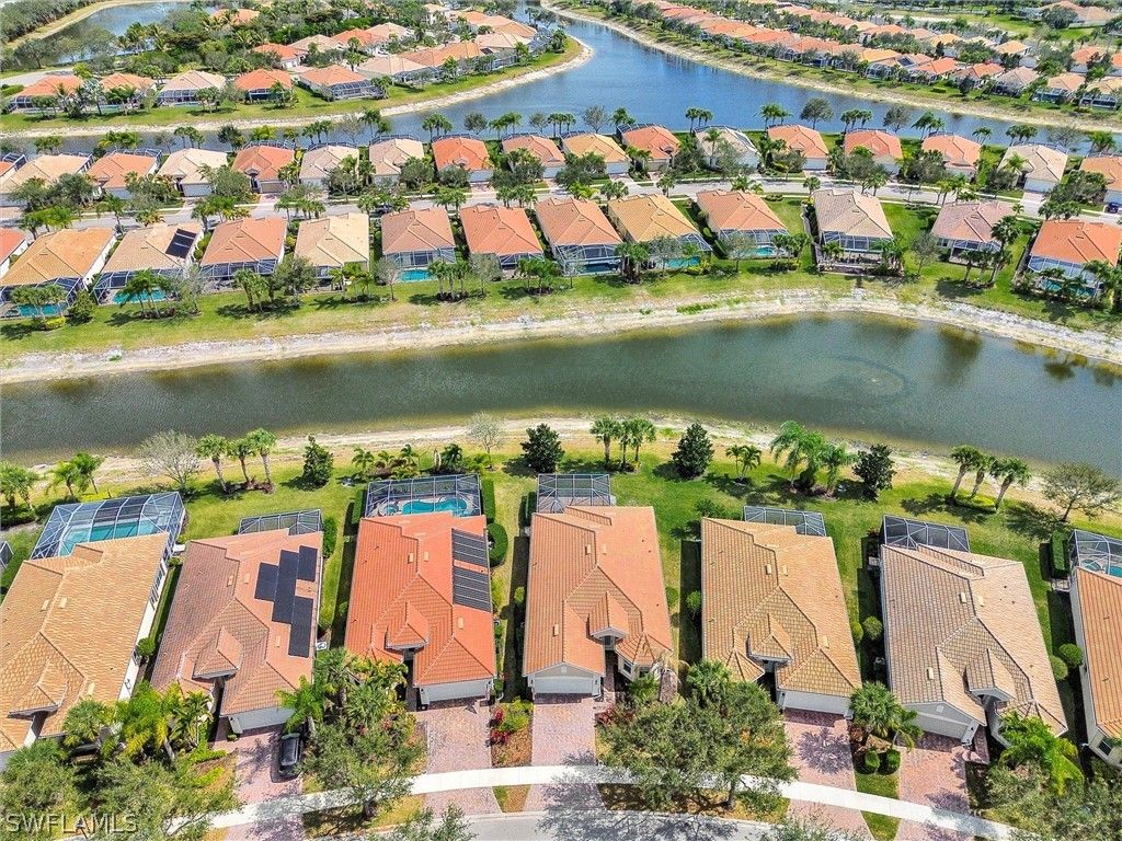 Welcome to paradise in amenity rich Village Walk of Bonita Springs. Enjoy the sunrise view of the lake on the oversized lanai. This lovely Vernon Hill model featuring 4 bedrooms, 2 baths, and 2 car garage is being offered turnkey furnished. The 4th Bedroom has an amoire. Upgrades include granite counters, upgrade refrigerator, plantation shudders, crown molding, recessed lighting, a beautiful glass insert on front door, hurricane impact windows, electric storm shutter, extended garage with epoxy floor, built in cabinets, and much more. Village Walk is a resort style community with many walking paths, aesthetic pedestrian bridges, a butterfly garden, 8 har tru tennis courts, pickleball courts, bocci, fitness and exercise room, restaurant, a resort pool and a lap pool, ice cream parlor, village spa, hair salon, bagel shop, post office, gas station and a touchless car wash. The HOA services include landscaping, irrigation, high-speed internet, and cable TV. The activity director keeps the social calendar active for a variety of interests. This 24hr guard gated resort community is close to shops, beach and RSW international Airport.