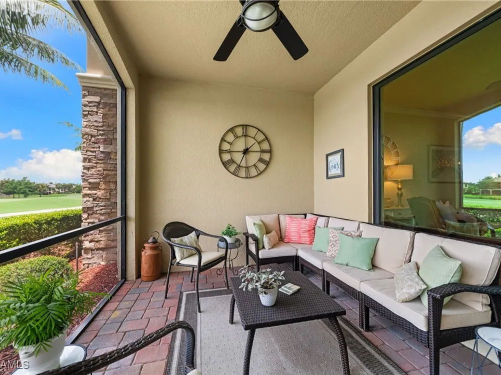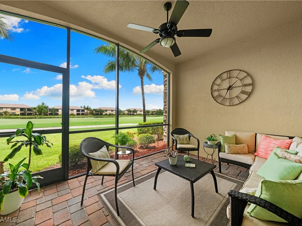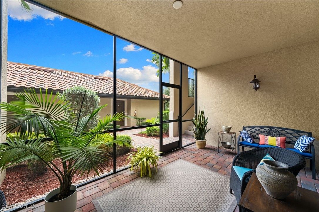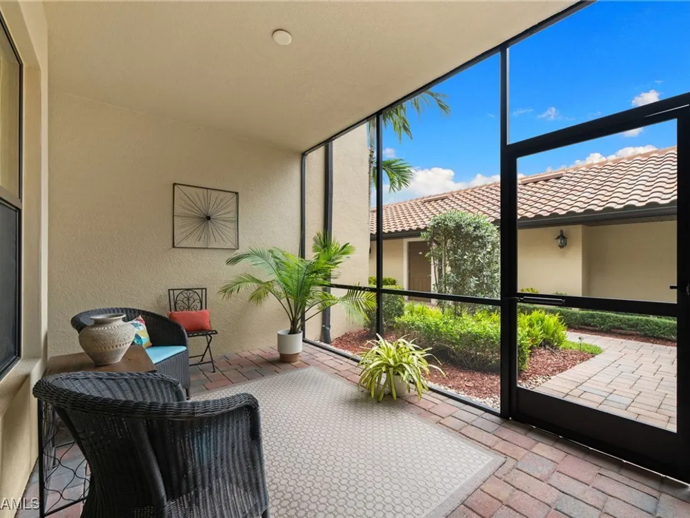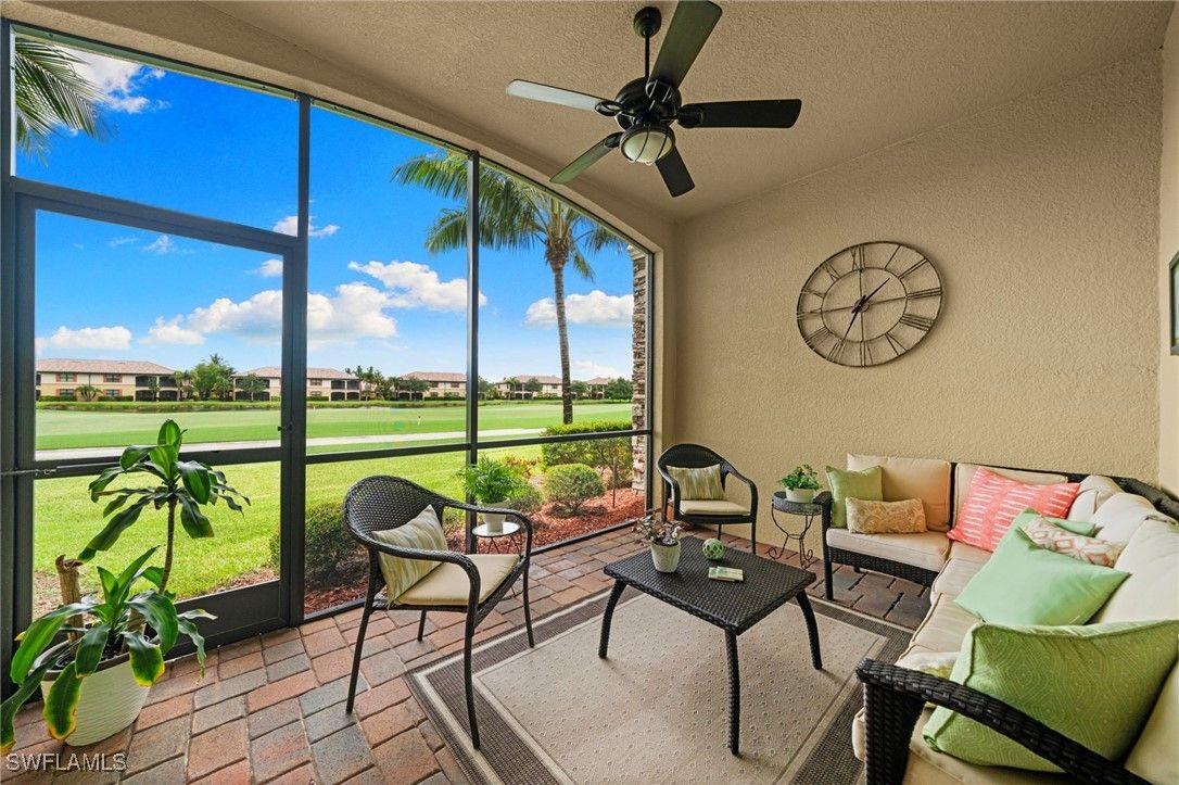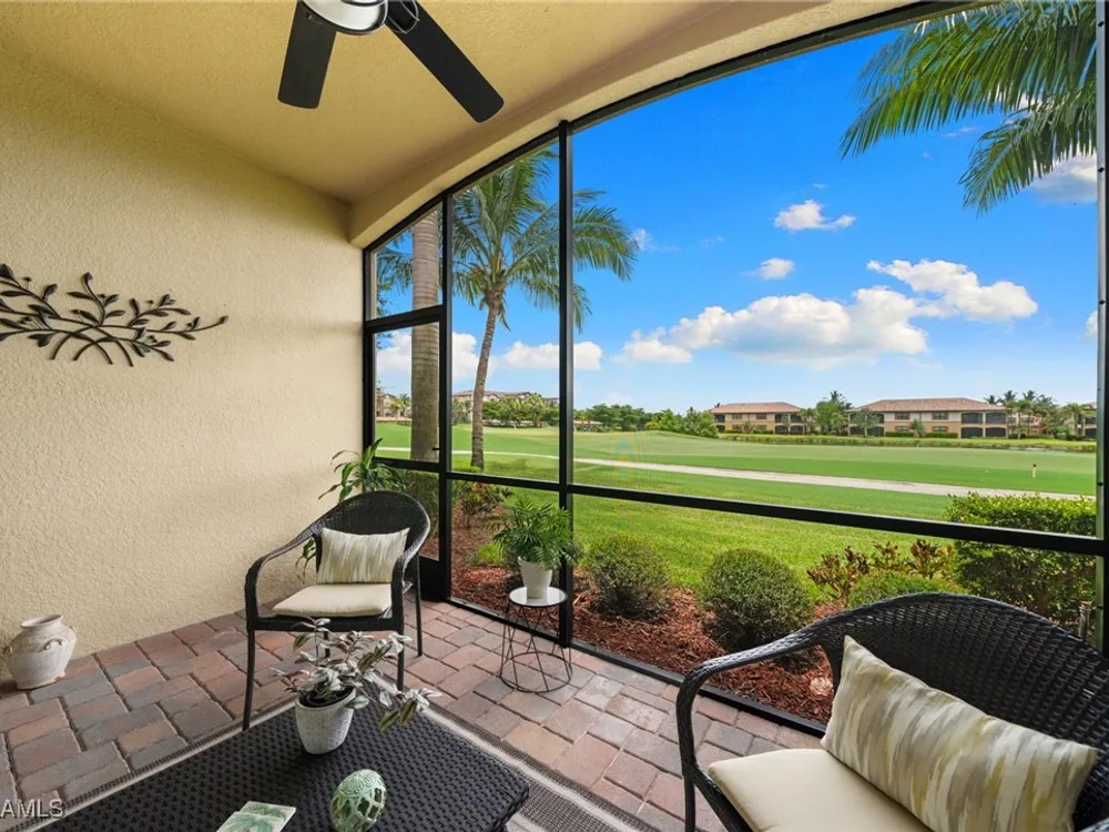 Step into this sought after ground floor, "Arabella" floor plan offering 2 bedrooms plus a den, 2 bathrooms, and a 1 car garage in the resort style community of Bonita National. As an end unit, this veranda home has additional windows and is bathed in natural light, enhancing its open and airy feel. The spacious living area flows seamlessly to a screened lanai with sweeping views of the lush golf course, perfect for enjoying morning coffee or evening sunsets. Thoughtfully upgraded, this home features no carpet for easy maintenance, crown molding, and is being sold partially furnished. Owners may golf unlimited from May - October. Bonita National offers world class amenities, including championship golf, tennis, fitness center, resort pool, multiple dining options and pickleball and bocce are being added soon! All just minutes from the beaches, shopping, dining and airport!