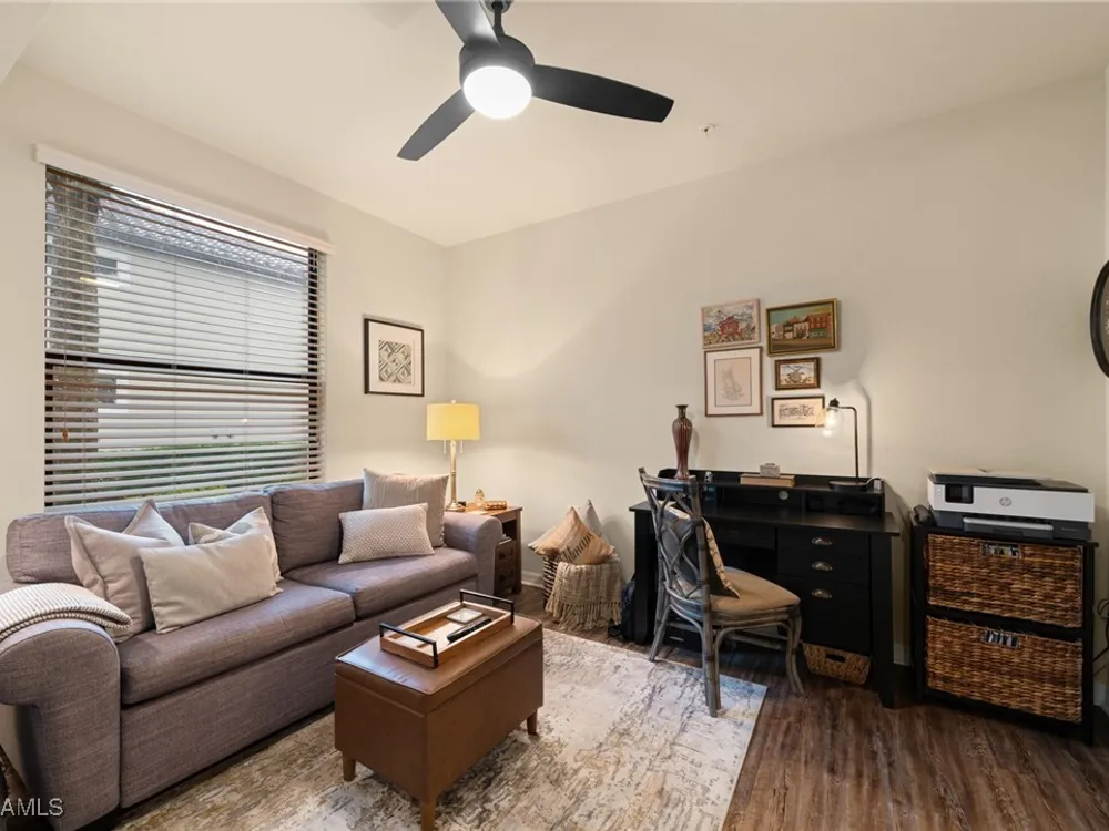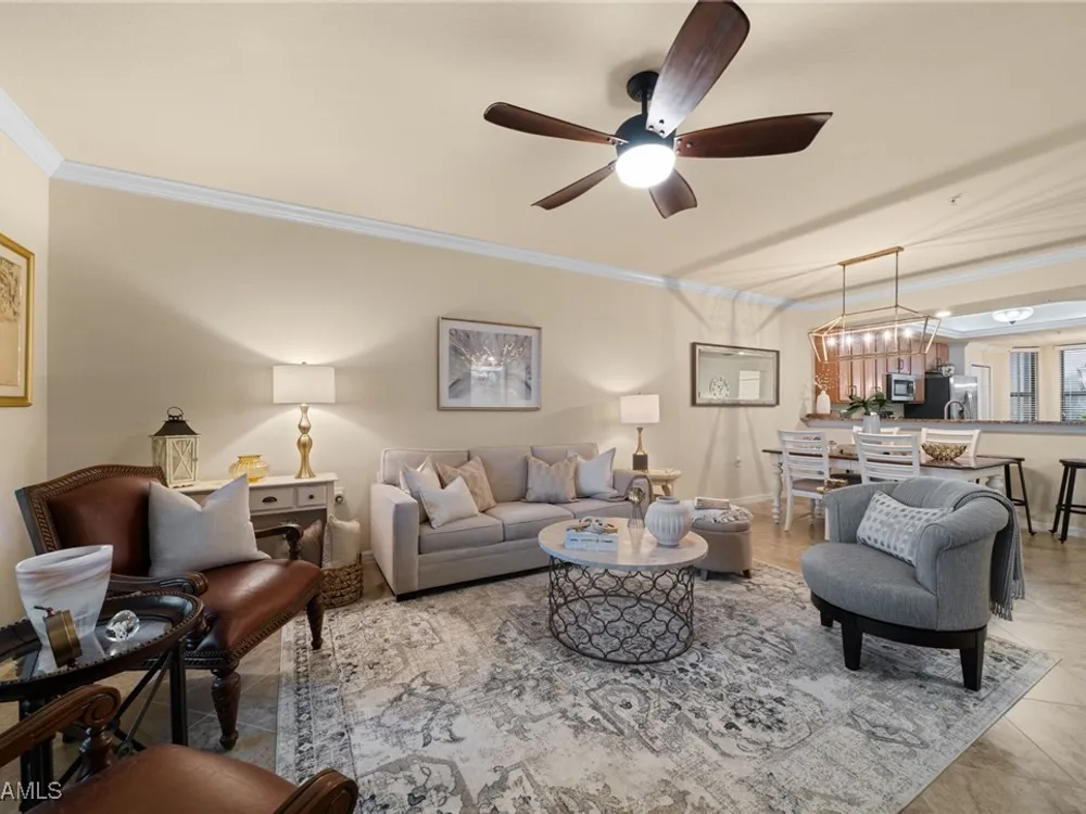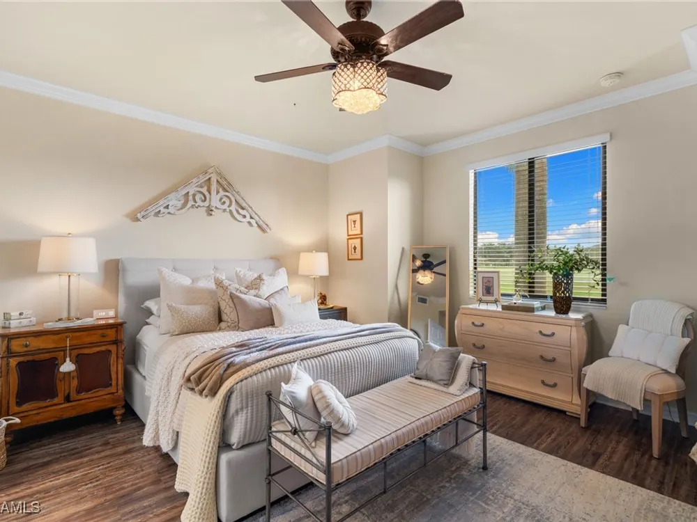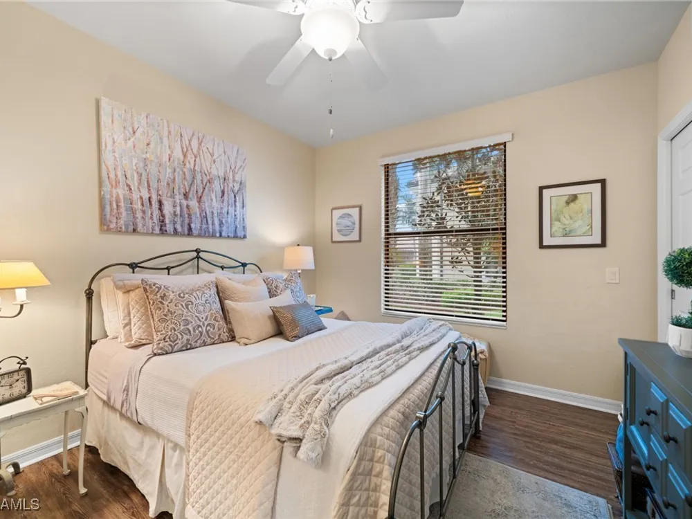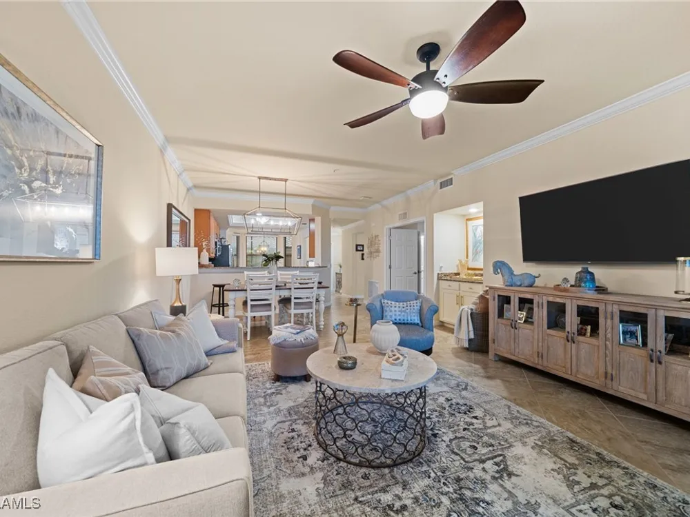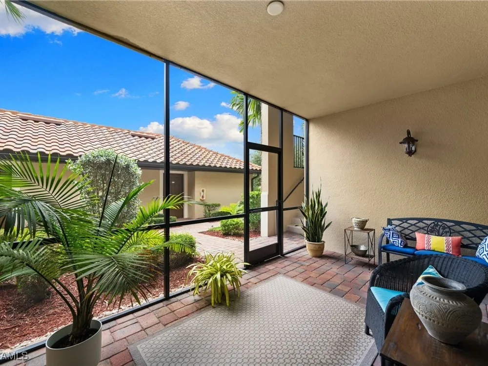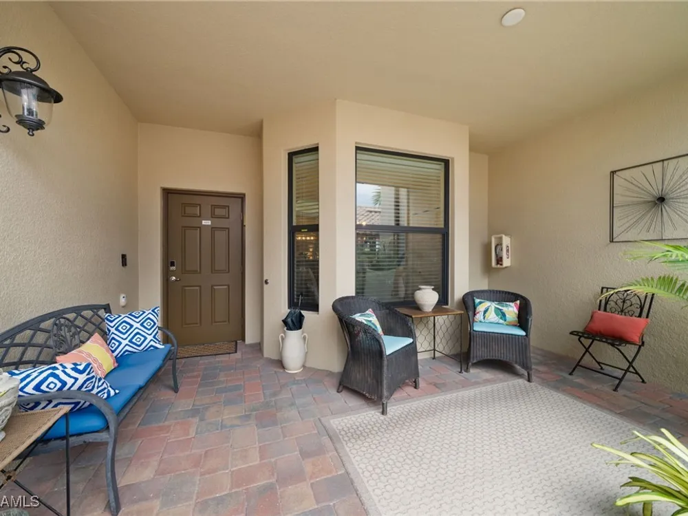 Step into this sought after ground floor, "Arabella" floor plan offering 2 bedrooms plus a den, 2 bathrooms, and a 1 car garage in the resort style community of Bonita National. As an end unit, this veranda home has additional windows and is bathed in natural light, enhancing its open and airy feel. The spacious living area flows seamlessly to a screened lanai with sweeping views of the lush golf course, perfect for enjoying morning coffee or evening sunsets. Thoughtfully upgraded, this home features no carpet for easy maintenance, crown molding, and is being sold partially furnished. Owners may golf unlimited from May - October. Bonita National offers world class amenities, including championship golf, tennis, fitness center, resort pool, multiple dining options and pickleball and bocce are being added soon! All just minutes from the beaches, shopping, dining and airport!