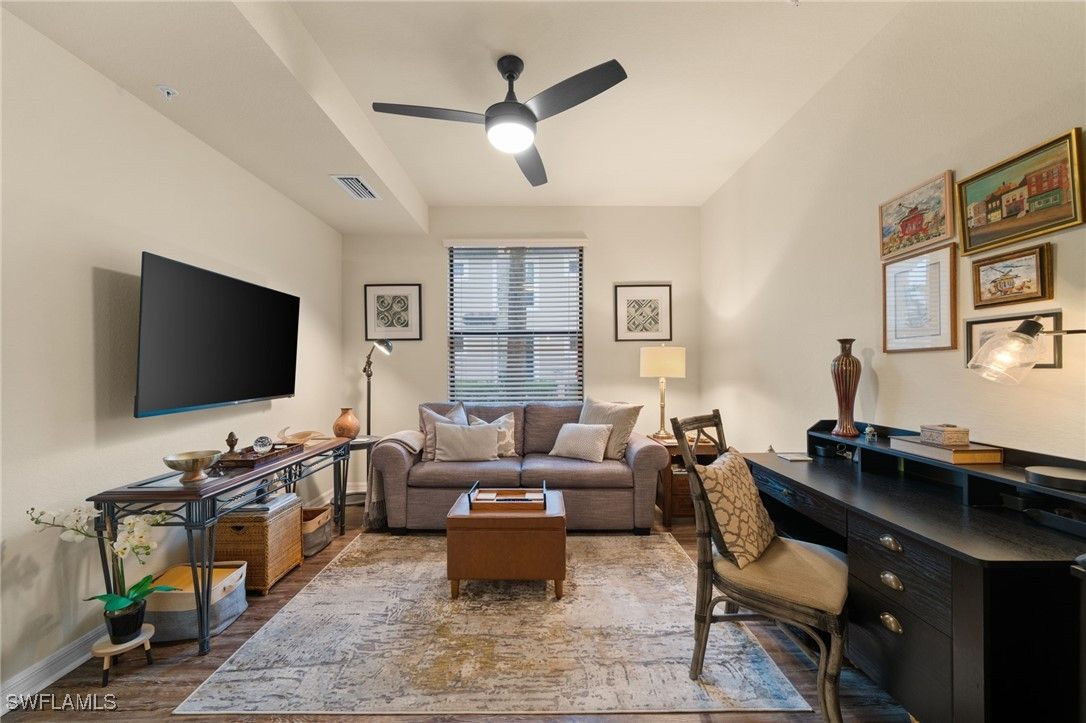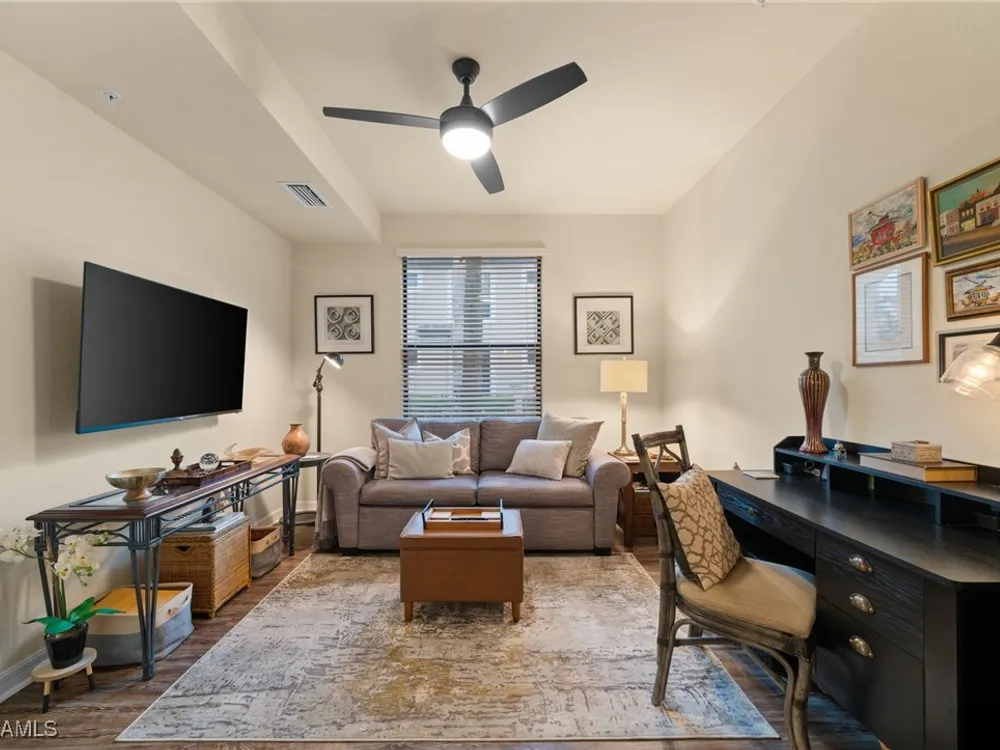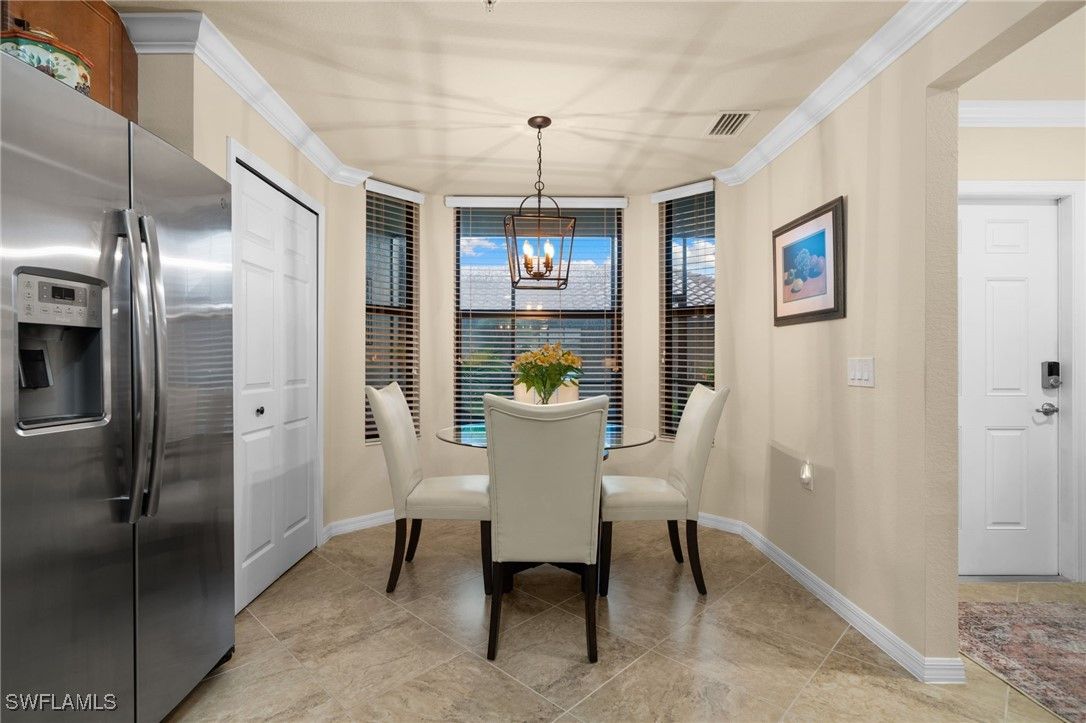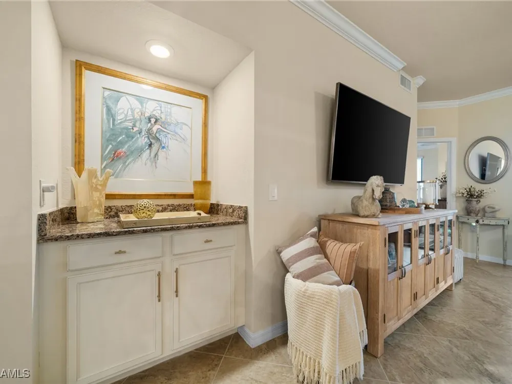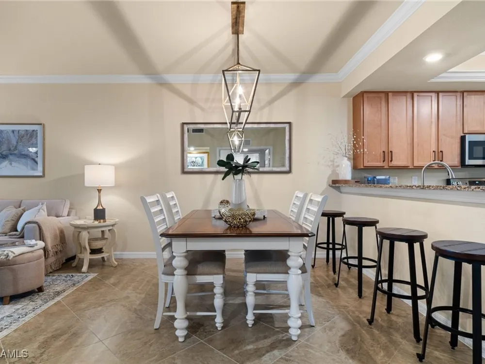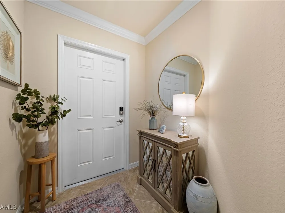 Step into this sought after ground floor, "Arabella" floor plan offering 2 bedrooms plus a den, 2 bathrooms, and a 1 car garage in the resort style community of Bonita National. As an end unit, this veranda home has additional windows and is bathed in natural light, enhancing its open and airy feel. The spacious living area flows seamlessly to a screened lanai with sweeping views of the lush golf course, perfect for enjoying morning coffee or evening sunsets. Thoughtfully upgraded, this home features no carpet for easy maintenance, crown molding, and is being sold partially furnished. Owners may golf unlimited from May - October. Bonita National offers world class amenities, including championship golf, tennis, fitness center, resort pool, multiple dining options and pickleball and bocce are being added soon! All just minutes from the beaches, shopping, dining and airport!