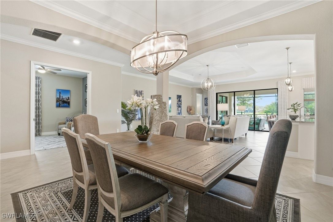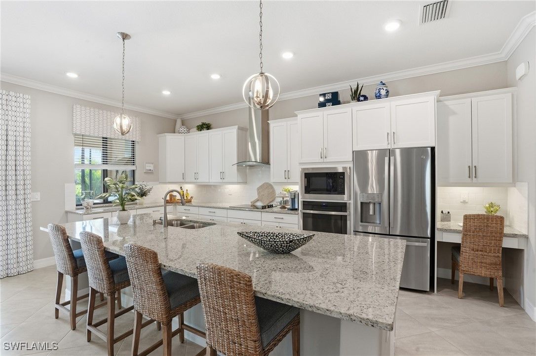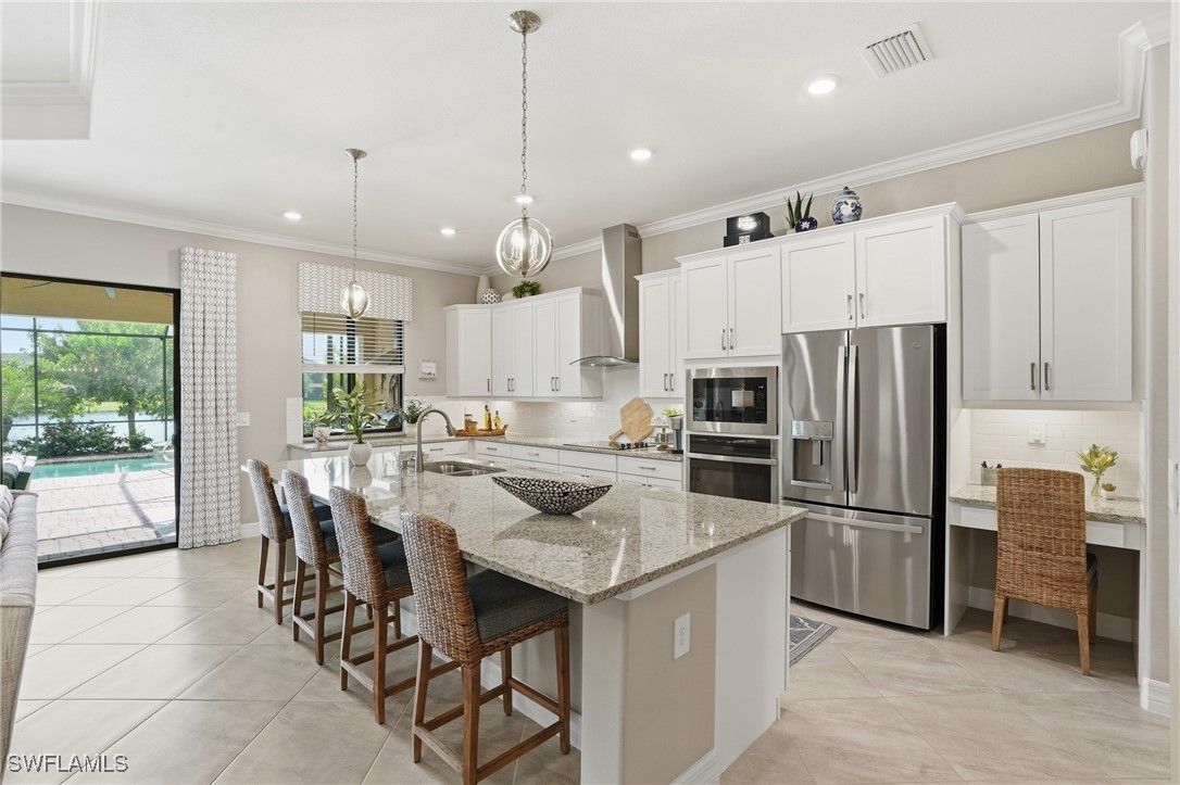 Introducing a rarely available Angelina model TURN-KEY in the highly sought-after Bonita National Golf & Country Club—where elegance, comfort, and resort-style living truly come together. This stunning 3-bedroom, 2-bath home is one of the most desirable floor plans in the community. Better than a model, this beautifully designer-decorated home is truly move-in ready and offers the perfect blend of coastal elegance and casual sophistication. The open-concept layout effortlessly flows from the great room to the gourmet kitchen and dining areas, creating an ideal space for relaxed living and effortless entertaining. The gourmet kitchen is as functional as it is beautiful, featuring an abundance of cabinetry that offers exceptional storage space for all your culinary needs. Thoughtfully designed with extended upper cabinets, deep lower drawers, and a large pantry area, this kitchen ensures everything has its place—keeping your counters clutter-free and your cooking experience seamless. Whether you love to entertain or simply enjoy an organized home, the generous storage options make this kitchen a standout. A rare vented kitchen hood with exterior exhaust—a highly sought-after upgrade for serious cooks. Slide open the pocketing glass doors and step into your private outdoor sanctuary. The extended screened lanai showcases a sparkling heated salt water pool and spa, a custom-built outdoor kitchen with sink, and generous seating areas for lounging and dining. Thoughtfully placed professional landscape lighting creates an inviting evening ambiance, perfect for entertaining under the stars. Eastern exposure delivers beautiful sunrise views and comfortable afternoon shade on the lanai. Additional features include: Spacious primary suite with lanai access and luxurious ensuite bath, two beautifully finished guest bedrooms, upgraded laundry room with storage and utility sink. Epoxy-finished garage floor with overhead storage racks and custom cabinets, impact-resistant doors and windows for peace of mind and the Lani is equipped with hurricane design storm shades. Located in the resort-style community of Bonita National, offering golf privileges for social member May thru October, tennis, future pickleball courts, fitness center, full-service spa, clubhouse dining, and more! This home offers everything you dreamed of in Florida living—elegance, comfort, and a lifestyle that feels like vacation every day. A must-see in person—homes like this don’t come along often!