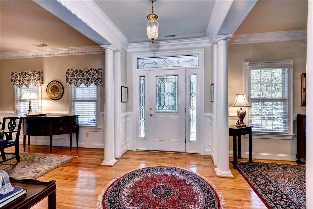 Stunning Southern Living–style Cape Cod in Governor’s Land with a brand-new 2025 roof! Set on a private, .56-acre treed lot, this timeless home welcomes you with a wide front porch and elegant moldings throughout. The gracious foyer is flanked by formal living and dining rooms, leading to the heart of the home—a spacious kitchen with center island, pantry, abundant cabinetry, granite counters, Wolf double ovens, Thermador gas cooktop, and tiled backsplash. The kitchen opens to the inviting great room featuring a mahogany inlay floor, built-ins, and gas fireplace. A bright breakfast area with cathedral ceiling and generous natural light creates a cheerful gathering spot. The first-floor primary suite offers a tray ceiling, large walk-in closet, and tiled bath with soaking tub and dual vanities. Two additional bedrooms share a Jack and Jill bath. Upstairs, a fabulous in-law or teen suite includes a fourth bedroom, full bath, and bonus room. Outdoor living shines with a private deck, fenced dog run, and a peaceful, serene setting—an ideal birdwatching retreat. Additional highlights: 2023 natural gas generator, tankless water heater, and oversized 2-car garage with workshop.