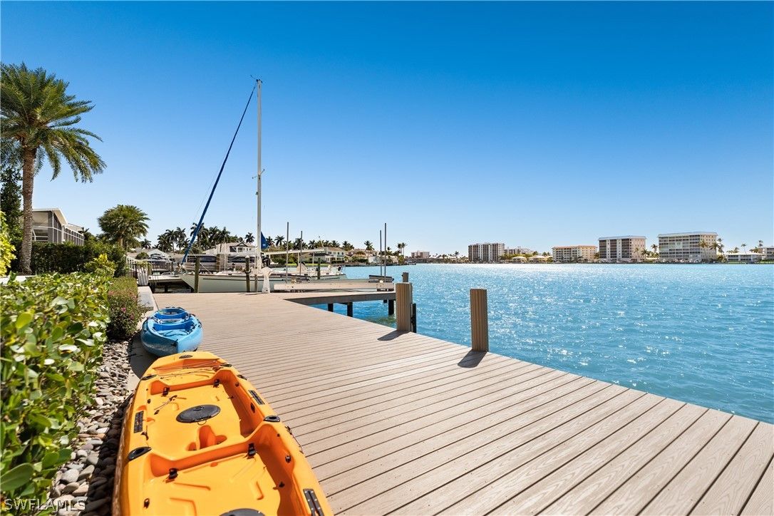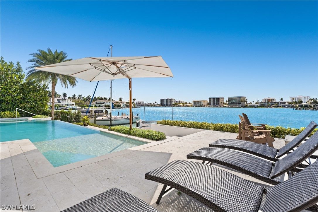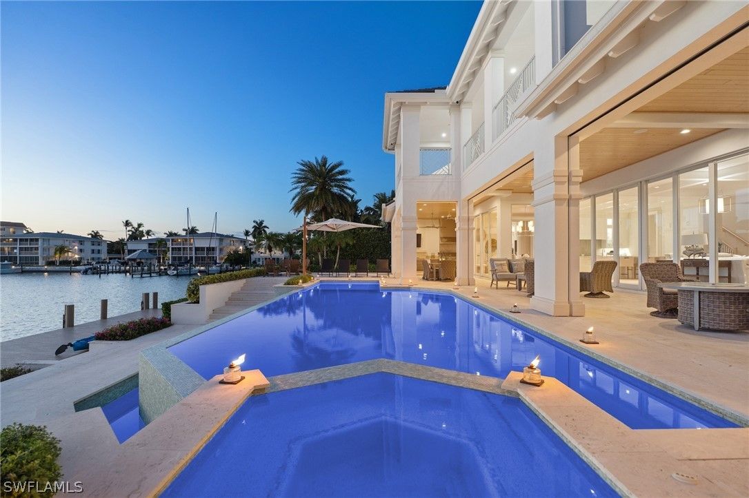 Sweeping southwestern bay views and direct, no-bridge access to the Gulf define the effortless coastal lifestyle at 2805 Leeward Lane. Expertly constructed by Coleman with longevity and quality in mind, the residence embodies a timeless architectural style—an elegant balance of relaxed coastal living and thoughtful, high-performance design. A grand entry through impressive mahogany double doors reveals an expansive great room, where walls of 10-foot glass sliders frame tranquil water vistas and invite natural light to pour in. At the heart of the home, a stunning custom Ruffino kitchen serves as both a showpiece and gathering space, appointed with dual Cristallo quartzite islands, a Wolf gas range, a dedicated butler’s pantry, and uninterrupted views across the bay. Spanning approximately 100 feet of pristine water frontage, the outdoor living experience is equally compelling. Designed for both entertaining and everyday enjoyment, the grounds feature an expansive Trex dock with a brand new 30,000-pound Shorestation Hydraulic lift, a submersible kayak launch, a built-in firepit, and electric roll-down screens and shutters. The summer kitchen and covered dining area—complete with a fireplace—offer a seamless transition from indoors to out, creating the perfect setting to take in Naples’ breathtaking sunsets. The primary suite provides a serene retreat, with a light-filled bath designed for relaxation, while four additional en-suite bedrooms ensure comfort and privacy for family and guests alike. Enhanced by modern conveniences including a whole-home generator, elevator, Lutron lighting, and Control4 automation, this exceptional waterfront residence is ideally located in the heart of the Moorings—offering a rare opportunity to experience refined coastal living at its finest.