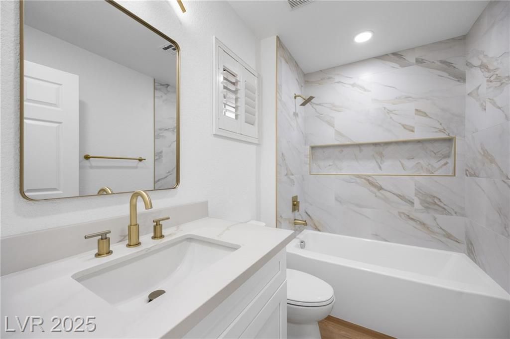 Completely reimagined & move-in ready! This stunning single-story golf course home in the 55+ community of Sun City Summerlin has been renovated top to bottom. Enjoy waterfall countertops in the kitchen, a spacious open layout, and your very own putting green in the backyard. Beautiful curb appeal, and direct golf course views make this a rare find. This home is an absolute must see — schedule your private tour today before it’s gone!