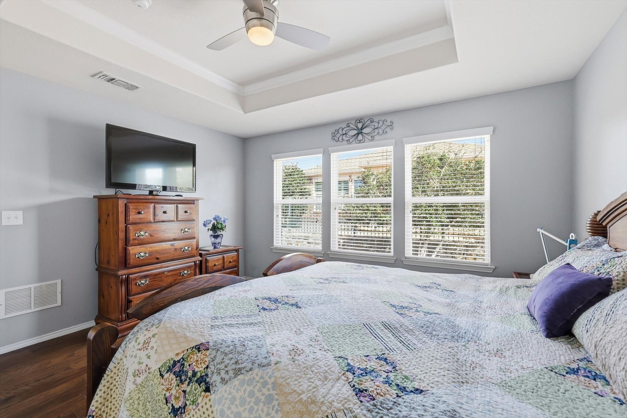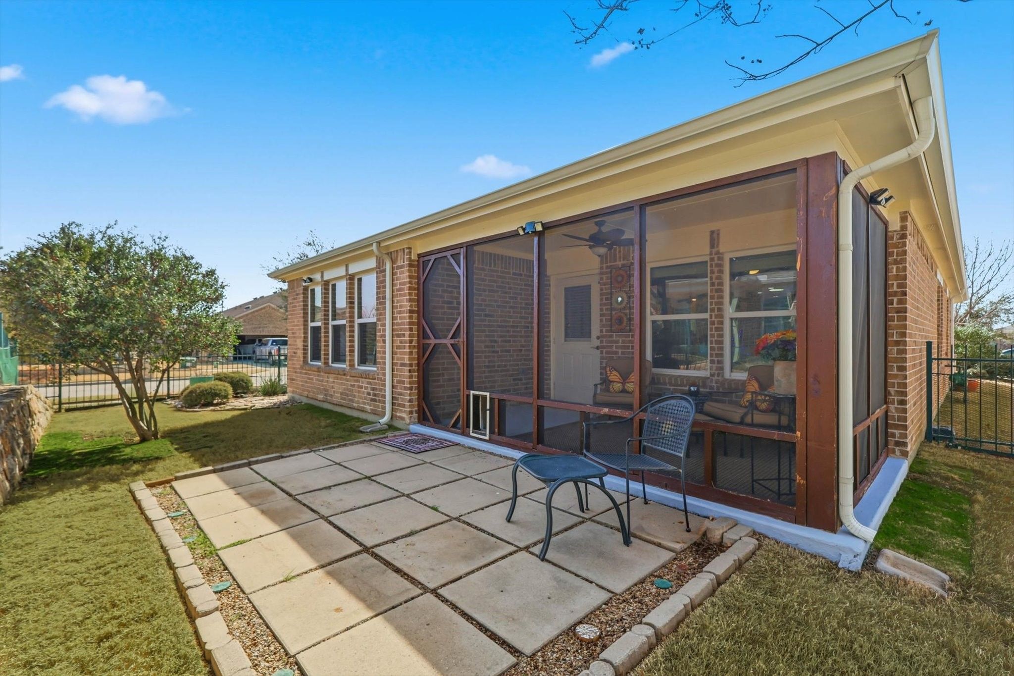 Well Maintained Gray Myst Floor Plan located on a beautiful landscaped corner lot in the sought after 55+ active community of Frisco Lakes. This 2 bedroom home also offers an open den, study or bonus room and has a closet. Kitchen has light granite counters, white cabinets, light color tile floors, gas range, stainless appliances and cozy breakfast nook. Living and Dining Room have tray ceilings and a ceiling fan with an open floor plan for entertaining. Primary suite has an ensuite bath with dual sinks, walk in shower and walk in closet. Guest bedroom and bath are split from primary suite to offer privacy. Wood floors in Living areas and bedrooms. A screened patio is great for relaxing and enjoying the beautiful trees and landscaping. Backyard is fully fenced with 2 gates. Home has many upgrades from 2024-2025. This community boasts an array of amenities designed to enrich your lifestyle, including scenic walking paths, picturesque ponds, pickleball courts and a pristine 18 hole golf course. Immerse yourself in the vibrant social scene at the amenity centers where endless opportunities for recreation and camaraderie await.