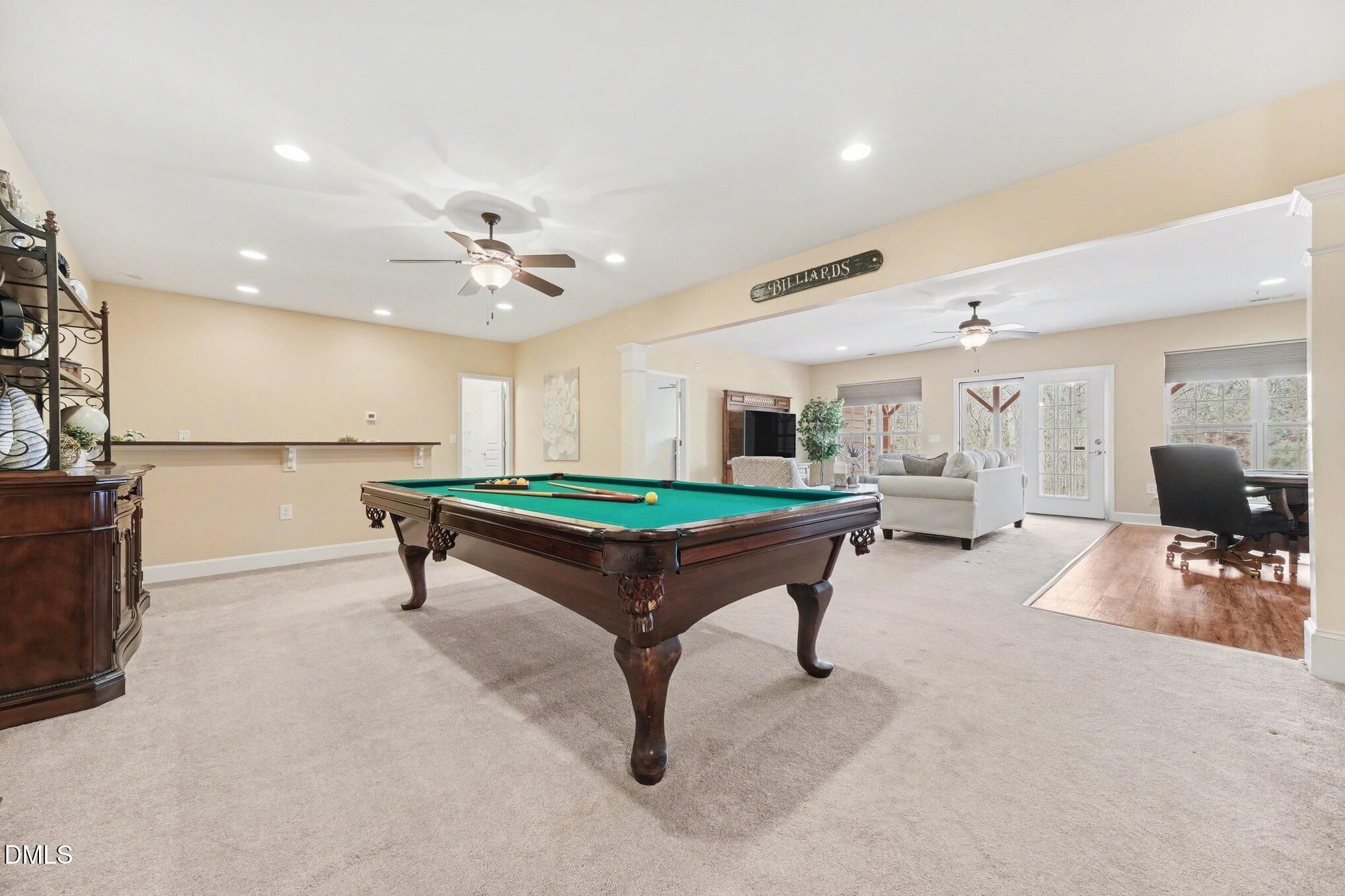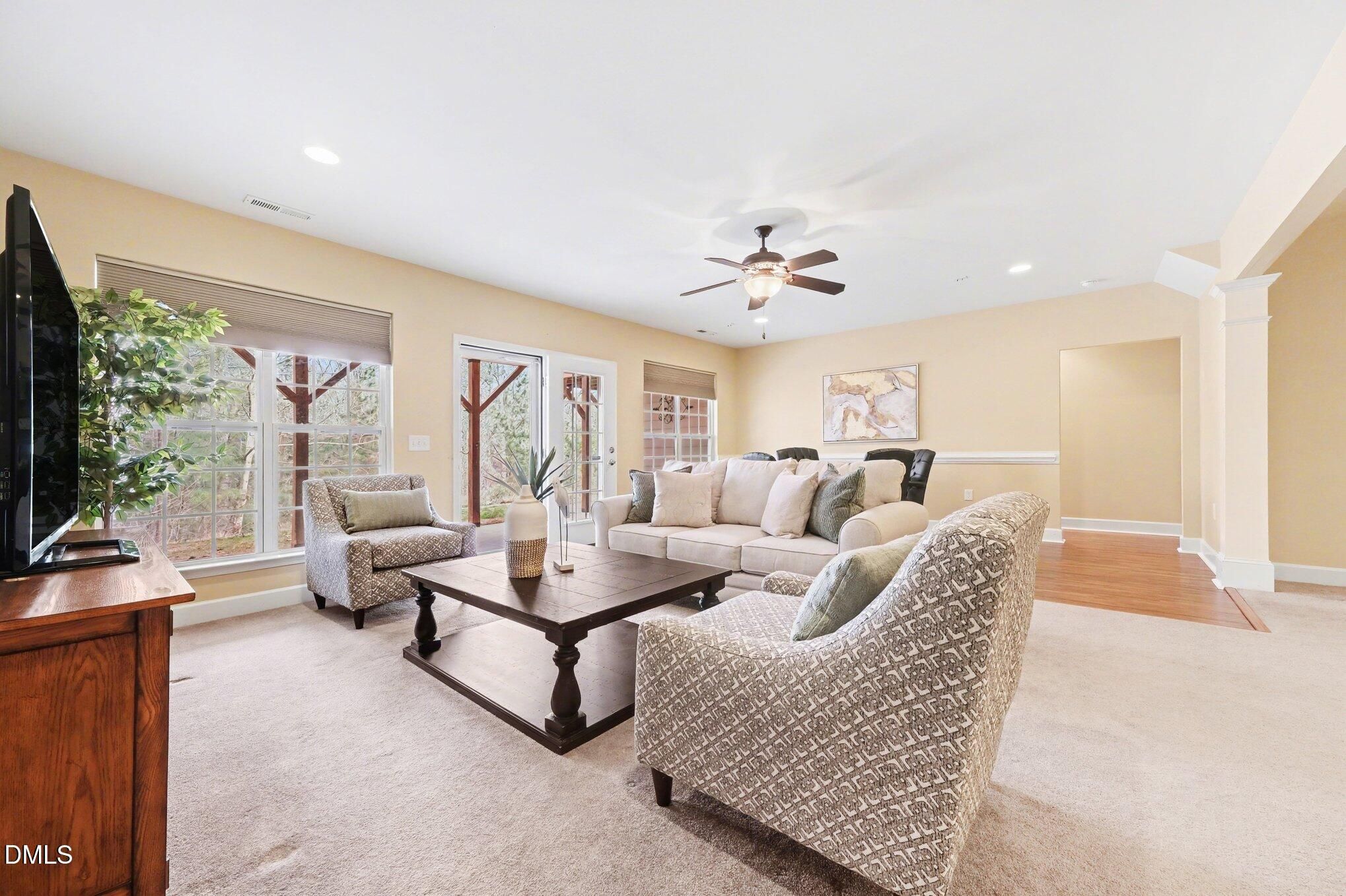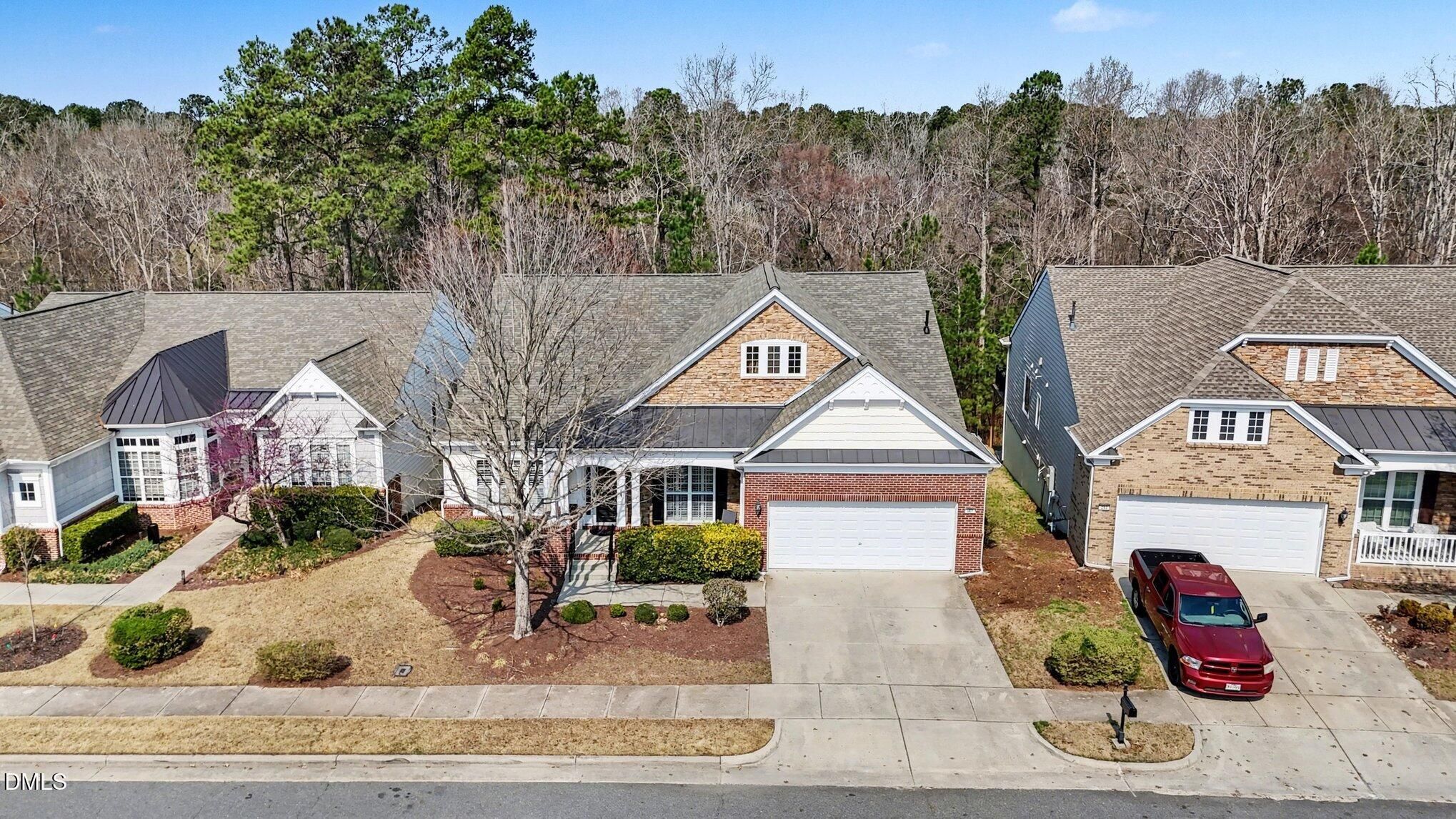 Original owner offering a rare opportunity to own one of the premier properties in Carolina Preserve! This home backs to the protected wooded area of Jordan Lake, ensuring exceptional privacy with no future development behind the property. Major updates have already been completed, including a brand-new roof installed in February 2026 with transferable warranty, HVAC systems replaced in 2020 and 2024, and a water heater installed in 2020. The seller is also offering a credit for interior paint and carpet replacement, giving the new owner the opportunity to personalize the home after closing. The thoughtfully designed main level features three bedrooms, each with a private bathroom, plus a convenient half bath for guests. A spacious laundry room with sink and counter space is also located on the main floor. The kitchen offers generous counter space, a center island, raised bar seating, and a walk-in pantry, and flows easily into the main living areas. The formal dining room comfortably seats ten and showcases tray ceilings, crown molding, and wainscoting. A private front office filled with natural light provides the perfect work-from-home space. The living room opens through sliding glass doors to a peaceful sunroom overlooking the wooded backyard, creating a serene place to relax. Just outside, a large deck provides the ideal setting for outdoor entertaining and summer BBQs. Downstairs, an additional 1,681 square feet of heated and cooled space offers incredible flexibility. With a separate HVAC system, this area can easily function as expanded living space or remain closed off when not in use. The lower level includes two large living/game rooms with bar and sink, a fourth bedroom and full bathroom, a flexible hobby or bonus room, and extensive storage. French doors open to a covered patio and the private backyard. Well maintained and thoughtfully designed, this home offers space, privacy, and endless possibilities for its next owner.