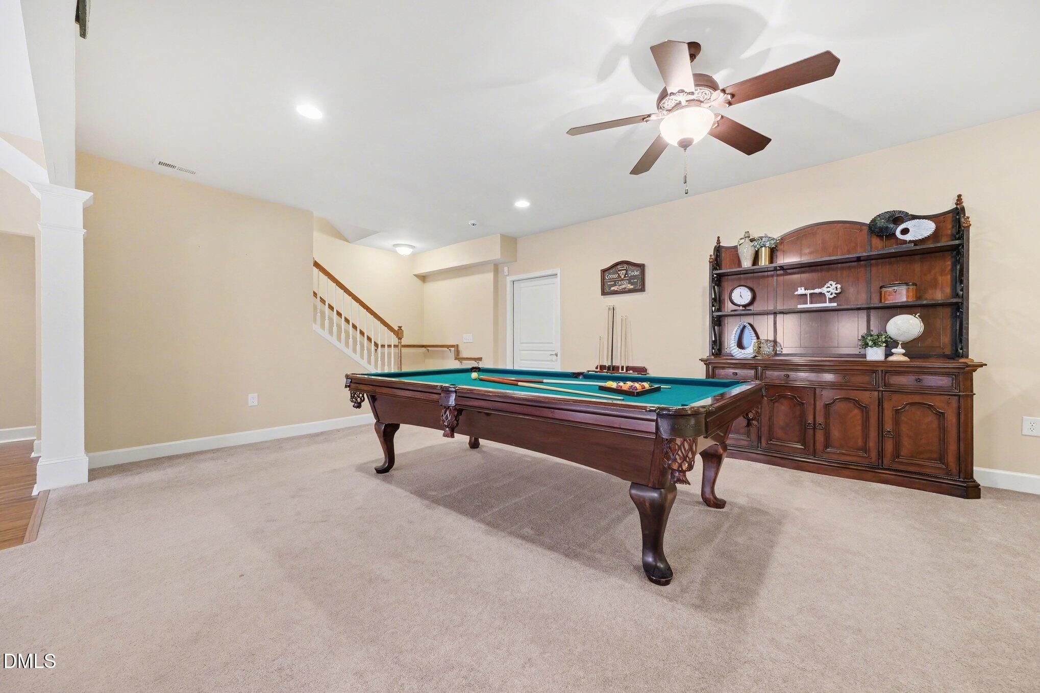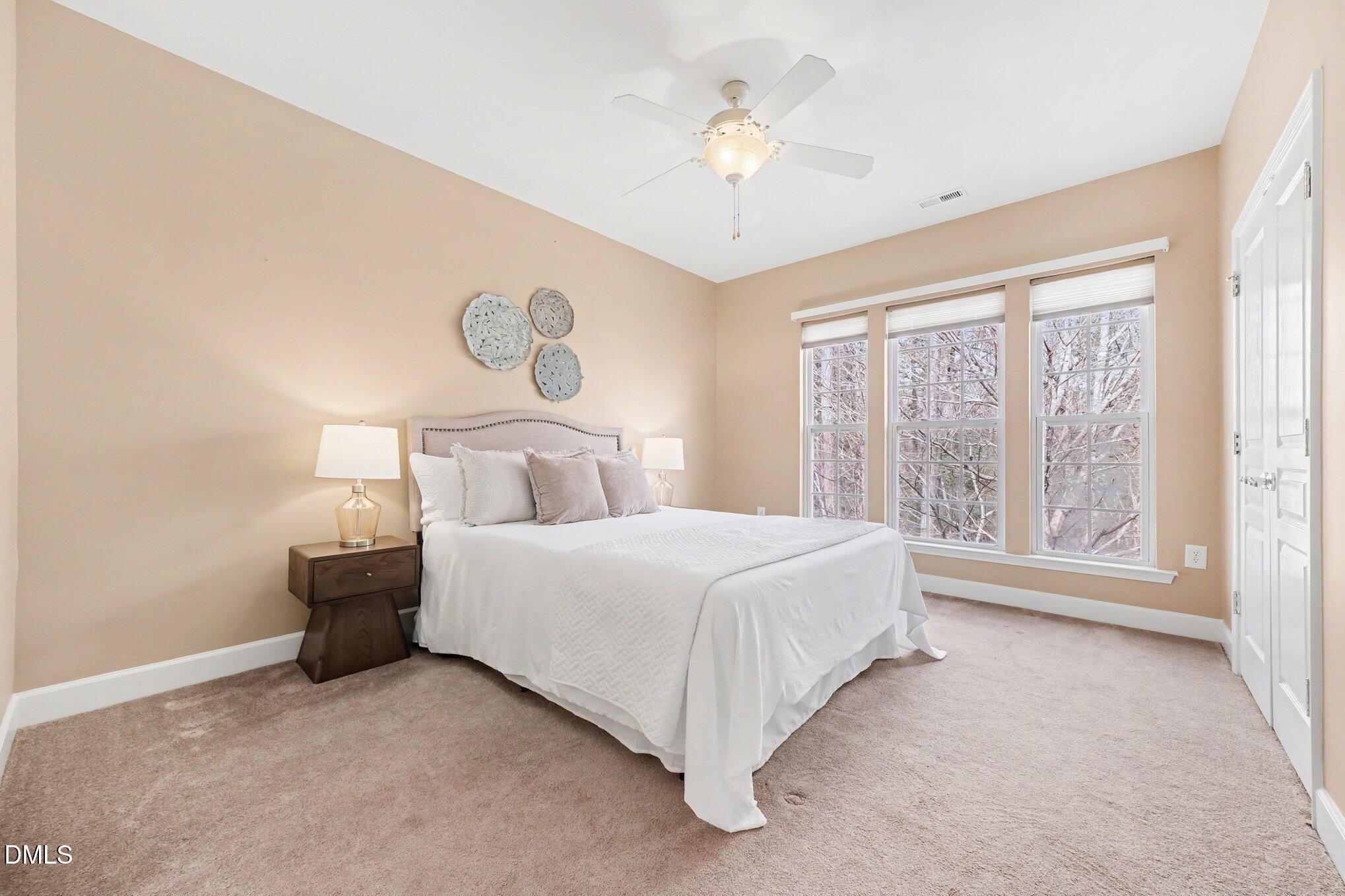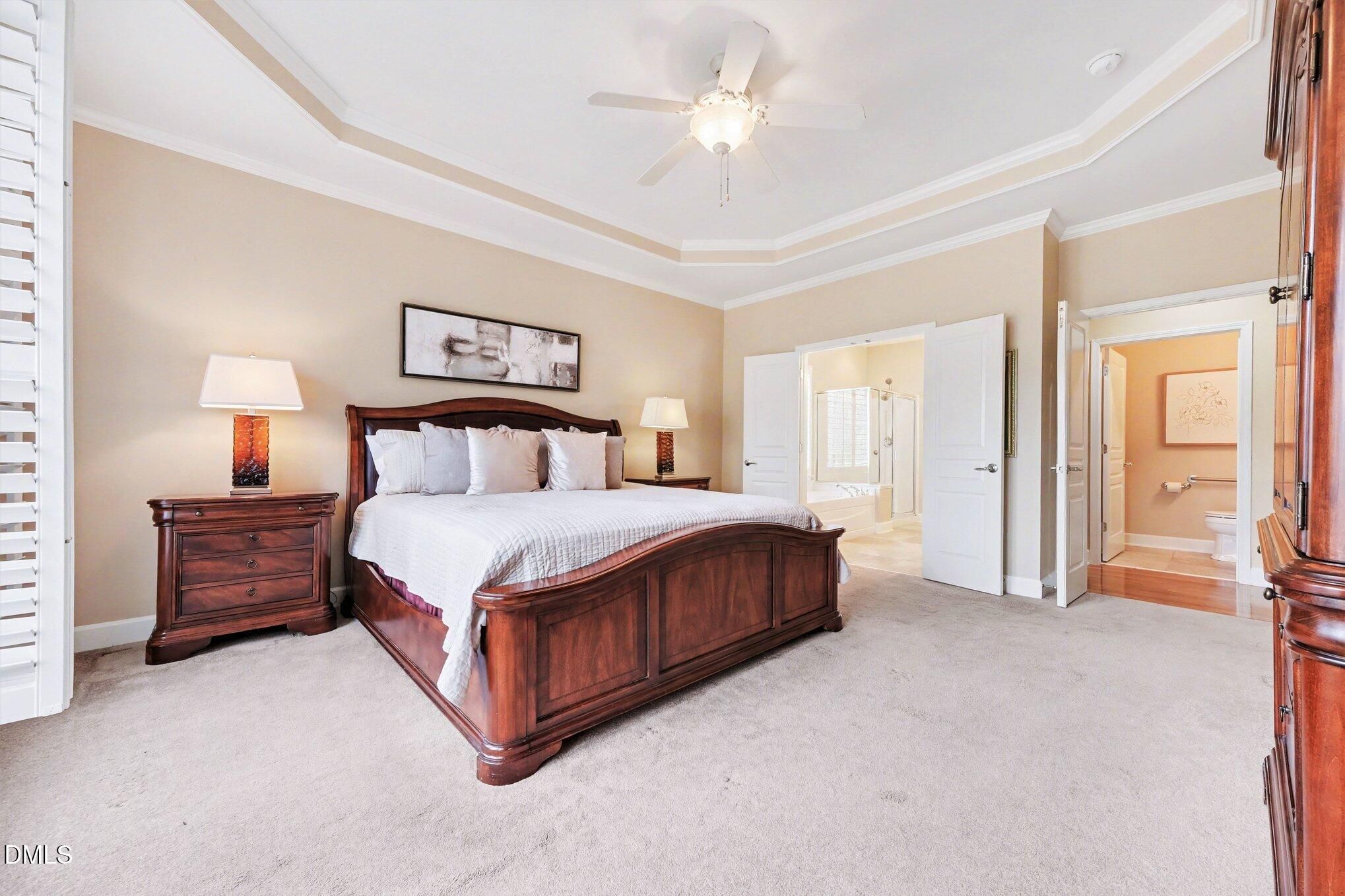 Original owner offering a rare opportunity to own one of the premier properties in Carolina Preserve! This home backs to the protected wooded area of Jordan Lake, ensuring exceptional privacy with no future development behind the property. Major updates have already been completed, including a brand-new roof installed in February 2026 with transferable warranty, HVAC systems replaced in 2020 and 2024, and a water heater installed in 2020. The seller is also offering a credit for interior paint and carpet replacement, giving the new owner the opportunity to personalize the home after closing. The thoughtfully designed main level features three bedrooms, each with a private bathroom, plus a convenient half bath for guests. A spacious laundry room with sink and counter space is also located on the main floor. The kitchen offers generous counter space, a center island, raised bar seating, and a walk-in pantry, and flows easily into the main living areas. The formal dining room comfortably seats ten and showcases tray ceilings, crown molding, and wainscoting. A private front office filled with natural light provides the perfect work-from-home space. The living room opens through sliding glass doors to a peaceful sunroom overlooking the wooded backyard, creating a serene place to relax. Just outside, a large deck provides the ideal setting for outdoor entertaining and summer BBQs. Downstairs, an additional 1,681 square feet of heated and cooled space offers incredible flexibility. With a separate HVAC system, this area can easily function as expanded living space or remain closed off when not in use. The lower level includes two large living/game rooms with bar and sink, a fourth bedroom and full bathroom, a flexible hobby or bonus room, and extensive storage. French doors open to a covered patio and the private backyard. Well maintained and thoughtfully designed, this home offers space, privacy, and endless possibilities for its next owner.