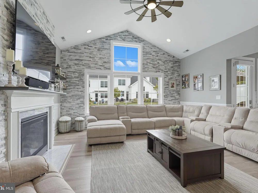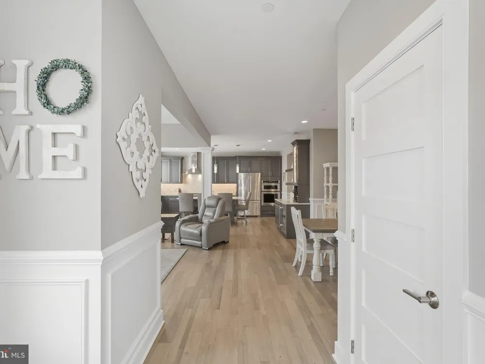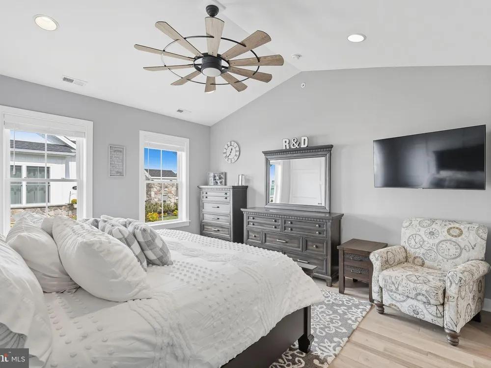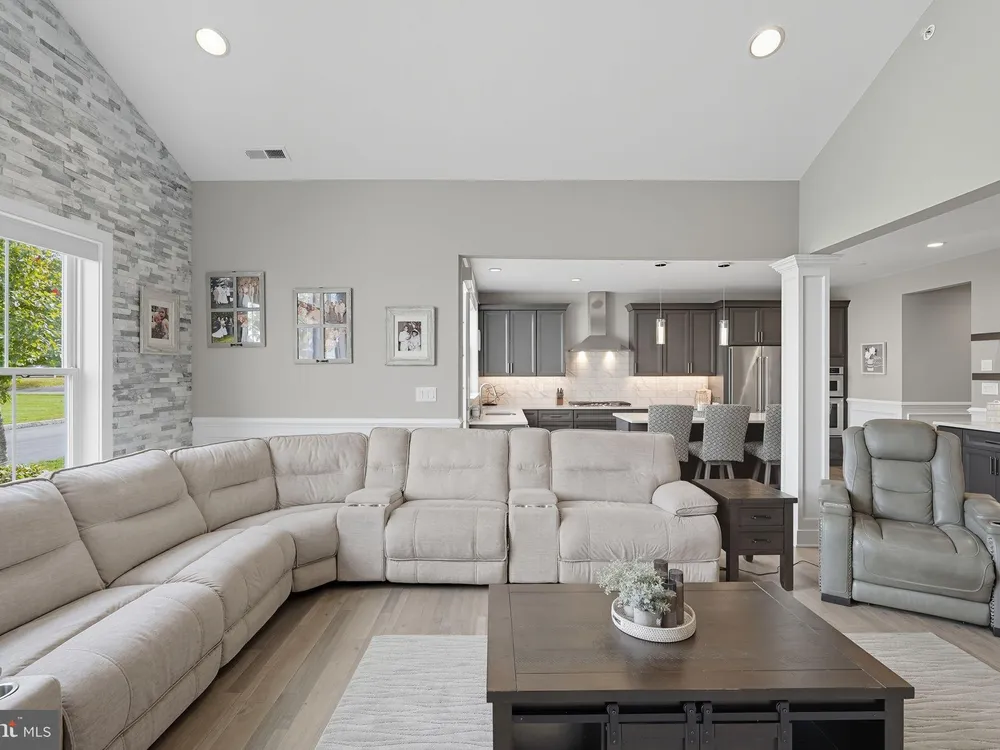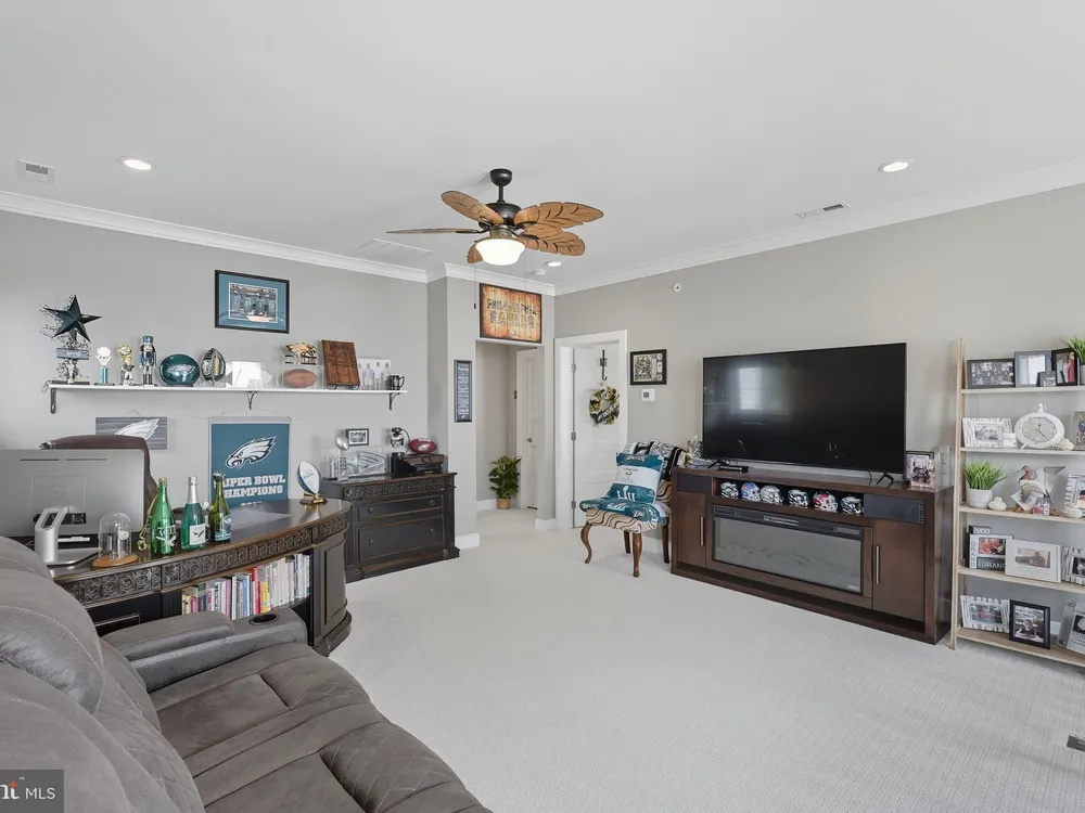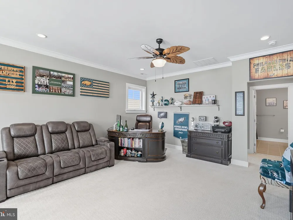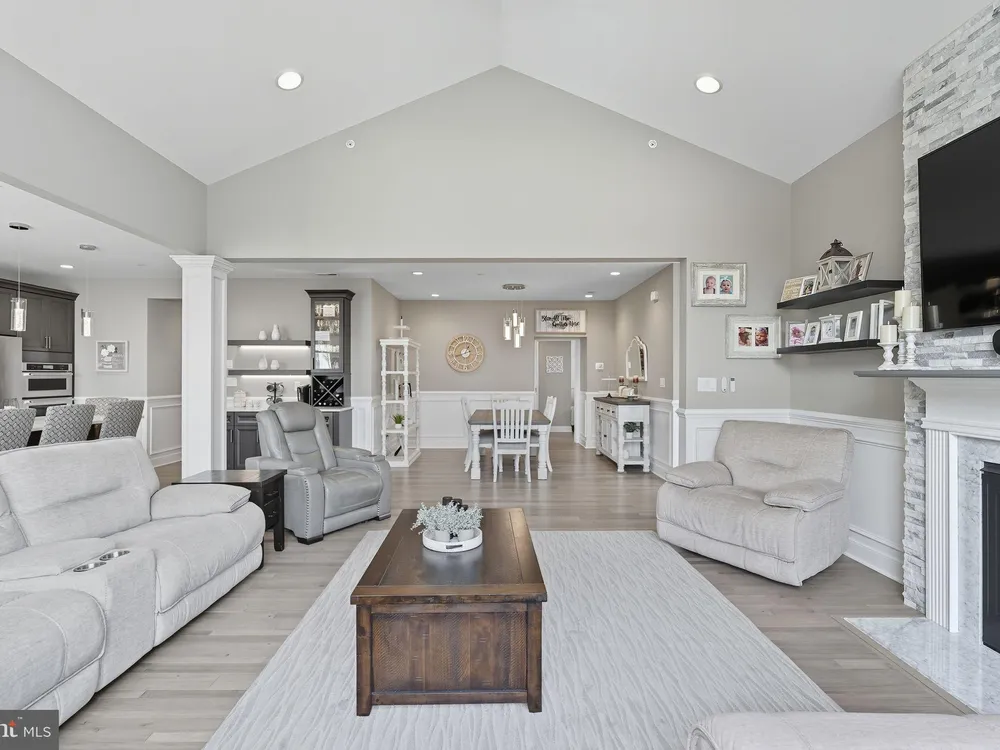 Welcome to this stunning quad-style home with 3 bedrooms and 2.5 baths that blends luxury, comfort, and convenience in the highly sought-after 55+ community of Yardley Preserve. From the moment you arrive, you’ll be impressed by the landscaping, decorative stone accents, high-end exterior lighting, a bluestone patio, and a Larson front storm door with a built-in screen—setting the tone for refined living. Step inside to discover an open floor plan filled with natural light, recessed lighting, Bengal Bay random-width hardwood floors, and fresh designer paint. The spacious family room boasts a dramatic cathedral ceiling, a stone fireplace wall with a custom mantle, a ceiling fan, and motorized window treatments. The dining area is a spacious, open area. The gourmet kitchen is a true showstopper with upgraded Century cabinetry, high-end hardware, Eternal Calcutta Gold countertops, KitchenAid stainless steel appliances, a walk-in pantry with custom organization, and a stylish coffee/wine bar with a built-in beverage cooler. Custom trim work, wainscoting, and thoughtful details carry throughout. The first-floor owner’s suite offers a luxurious retreat with a cathedral ceiling, two professionally organized walk-in closets, a custom-built accent wall for added elegance, and a spa-like bathroom featuring an additional custom vanity, upgraded ceramic tile, dual sinks, and a walk-in shower. Also on the main level, a large laundry room with abundant storage and an upgraded powder room with a stone accent wall add both convenience and style.On the second floor, you’ll find a generous loft perfect as a second family room or office, two spacious bedrooms, a full bath with upgraded tile and an oversized linen closet, and a huge storage room.Additional highlights include a finished, expanded 25' oversized 2-car garage with an epoxy-coated floor and storage room, a Ring doorbell, and an outdoor sound system with patio speaker. Designer upgrades such as crown molding in the foyer and loft, stained treads with painted risers, and contemporary railings add elegance throughout. With every detail thoughtfully designed, this home blends luxury, comfort, and convenience in one of Yardley’s most desirable active-adult communities.