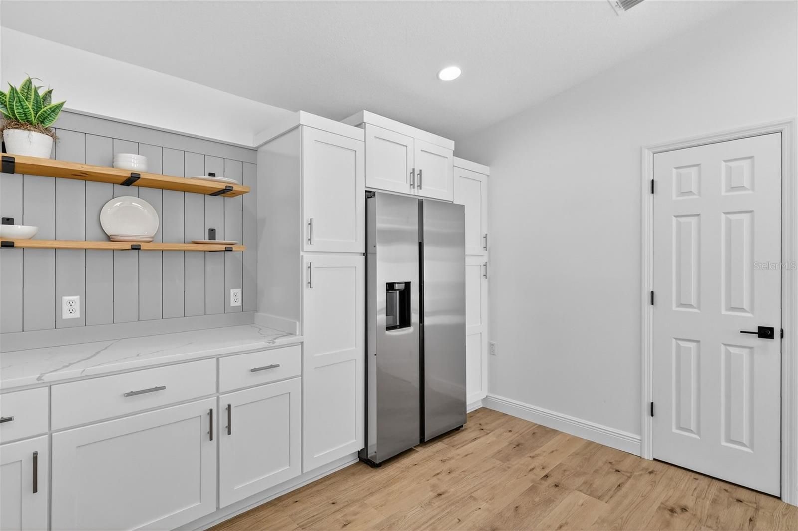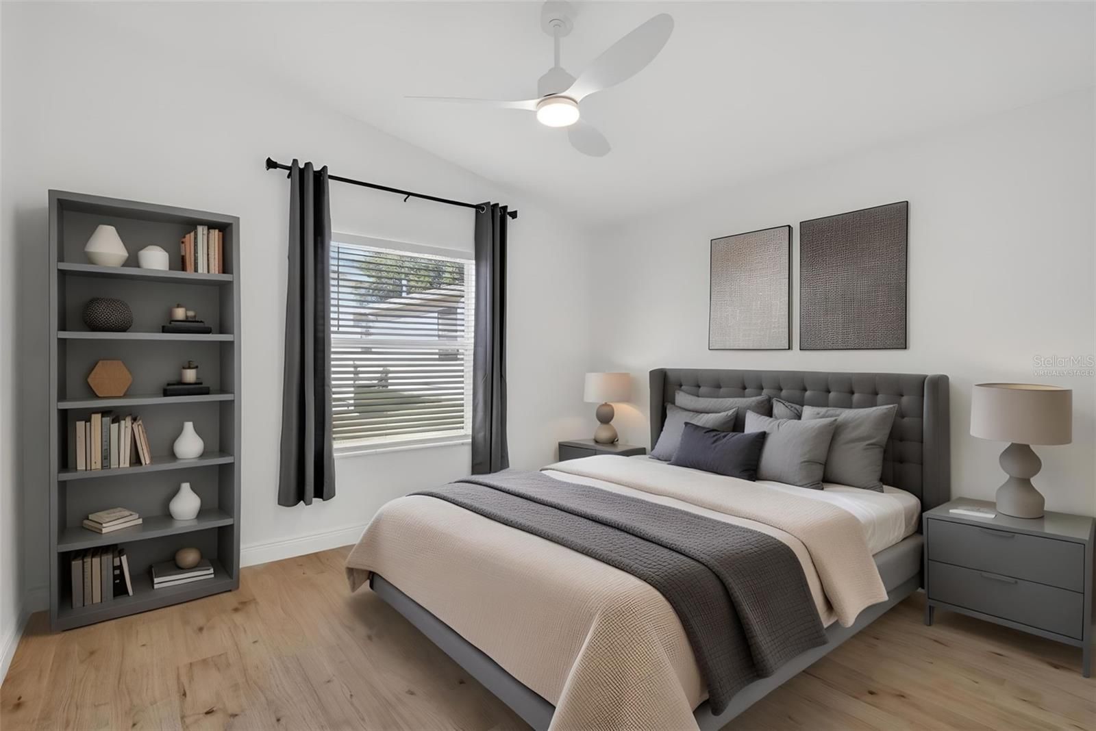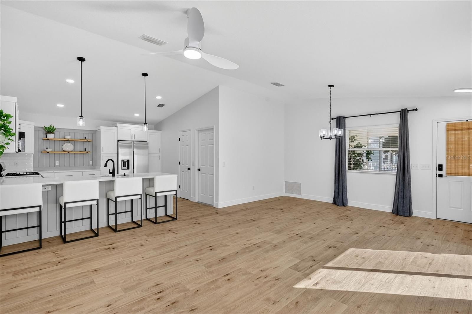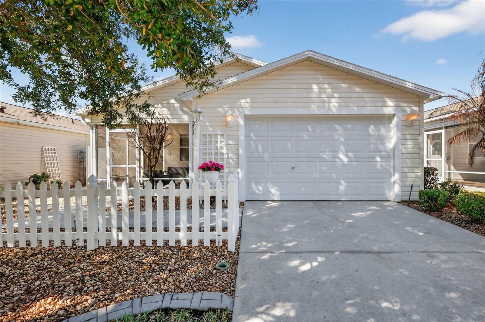One or more photo(s) has been virtually staged. ABSOLUTELY STUNNING, and COMPLETELY RENOVATED 2-Bedroom 2-Bath Colony villa nestled in the Katherine Villas in the Village of Caroline - one of the most sought-after neighborhoods in all of The Villages! This PREMIER LOCATION places you JUST MINUTES from BOTH Lake Sumter Landing and Spanish Springs Town Squares with live nightly entertainment! CONVENIENTLY LOCATED between County Roads 466 and 466A, you’ll enjoy effortless access to shopping dining, banking, medical, and more - everything you need, right at your fingertips! This BEAUTIFULLY UPDATED home offers low-maintenance LUXURY with stylish CONTEMPORARY finishes and thoughtful UPGRADES THROUGHOUT! The CHARMING exterior features a white picket fence, a MAJESTIC live oak tree, LOW-MAINTENANCE stoned landscaping beds with CURBED edging, and quaint stepping stones leading to a SPACIOUS side PAVER patio—creating an inviting first impression. Enter into the cozy SCREENED LANAI - the PERFECT spot to RELAX with your morning coffee, evening cocktail, or a good book! From here, a French door invites you in to an EXPANSIVE, OPEN-CONCEPT layout of the living, dining, and kitchen where SOARING VAULTED ceilings create a commodious atmosphere that feels BRIGHT and welcoming from the moment you enter! GORGEOUS, light wood, Pergo flooring runs SEAMLESSLY throughout the entire home, complemented by MODERN lighting and ceiling fans, NEW textured ceilings, HIGH baseboards, and NUMEROUS ADDITIONAL UPGRADES (See attached list for additional items). The SPECTACULAR, EXPANSIVE chef’s kitchen serves as the centerpiece of the home, showcasing STAGGERED WHITE SHAKER soft-close cabinetry; MODERN VEINED QUARTZ countertops; STAINLESS appliances with GAS cooking; TILE backsplash; SHIPLAP accent wall with CUSTOM WOOD SHELVES; built-in DOUBLE PANTRIES with ROLL-OUT shelving; additional PANTRY closet; under CABINET LIGHTING; and an EXPANSIVE, COUNTER-HEIGHT, EAT-IN breakfast bar with SHIPLAP accents - perfect for casual dining and entertaining. The SPACIOUS main living area is filled with NATURAL LIGHT from four large windows and sliding glass doors that open to a PRIVATE side PAVER patio, creating a wonderful indoor-outdoor living space ideal for relaxing or hosting gatherings. The luxurious primary suite features a VAULTED ceiling, GENEROUS WALK-IN closet, and a beautifully updated en-suite bathroom with a light GRAY vanity with marble top and a Carrara-style TILED WALK-IN shower. The second bedroom also offers a VAULTED ceiling and built-in closet. The guest bathroom includes a GRAY SHAKER vanity, tub and shower combination, and convenient hallway LINEN closet. Completing the package is an 18’ x 22’ garage featuring EPOXY floors, CONVENIENT laundry nook with storage cabinets, utility sink, and PLENTY of space for a vehicle, golf cart, and additional storage! DON’T MISS YOUR OPPORTUNITY to make this EXQUISITE HOME YOUR OWN! The Village of Caroline offers an UNBEATABLE LOCATION - ONLY MINUTES from Mallory Hill and Arnold Palmer Country Clubs and Championship Golf Courses. Health enthusiasts will love the proximity to the Lake Miona Regional Recreation Center and Fitness Trails. Also nearby are Coconut Cove Recreation Center, Caroline Neighborhood Pool, and many additional recreation centers with golf, pickle ball, swimming pools, and more! PLEASE WATCH OUR WALKTHROUGH VIDEO of this MAGNIFICENT HOME in a FABULOUS LOCATION and call today to schedule your Private Showing or Virtual Tour!
