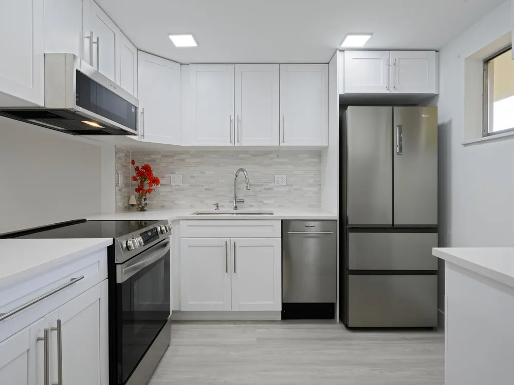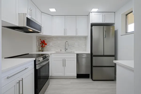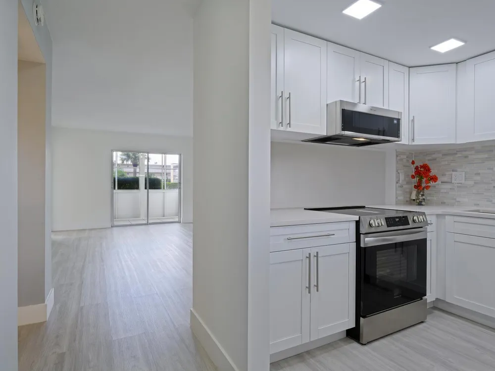 Be the first to live in this fully renovated 2-bed, 2-bath first-floor condo, redesigned with modern luxury in mind. Both bathrooms feature brand-new, high-end finishes, including a spa-like walk-in shower in the primary suite. The stunning new kitchen offers white shaker cabinets, quartz countertops, and new stainless-steel appliances. Neutral luxury vinyl plank flooring flows throughout the open living/dining space, leading to an enclosed patio--ideal for relaxing or entertaining. Updates include a new electrical panel, new fixtures, and accordion/roll-down shutters. Stylish, turnkey, and never lived in since renovation! Located in the highly sought after Lake Clarke Gardens, an age 55+ community with amenities that include 2 heated pools, sauna, exercise room, billiards room, & BBQ area