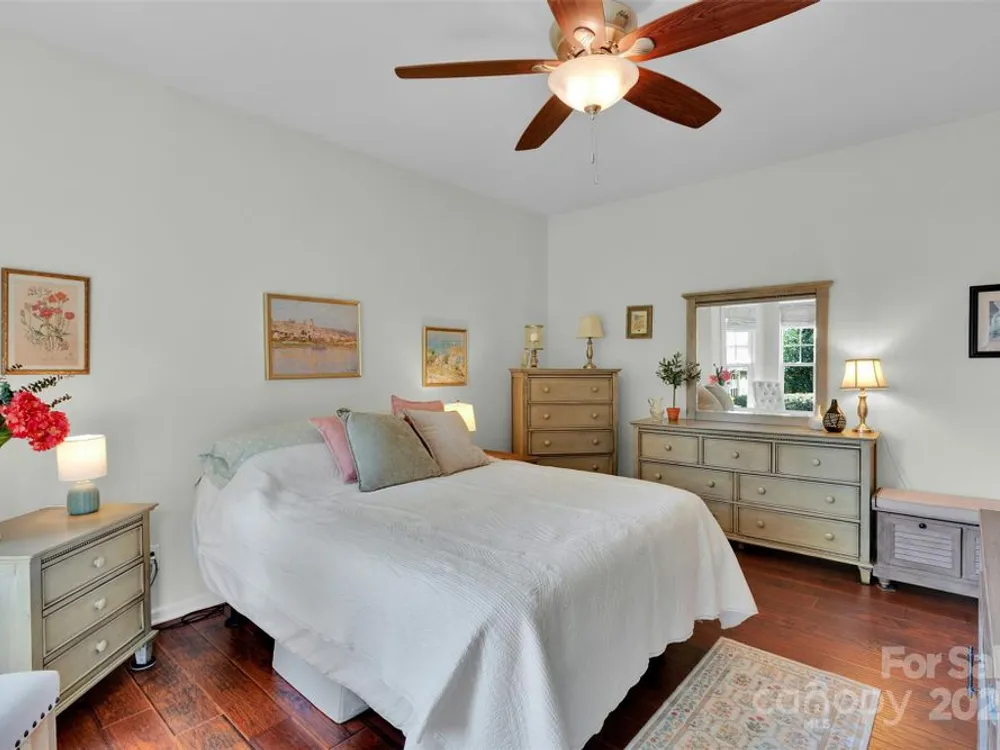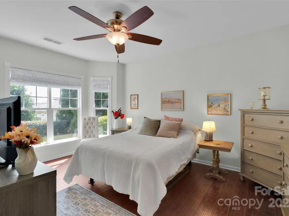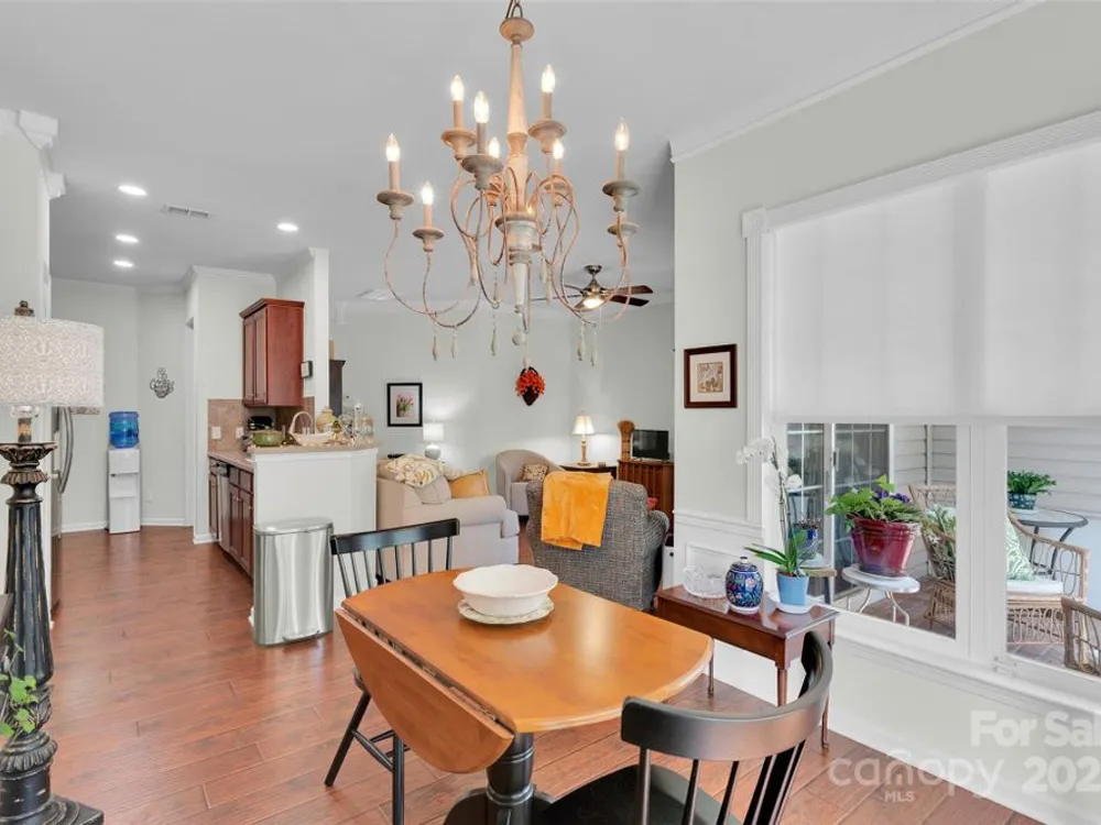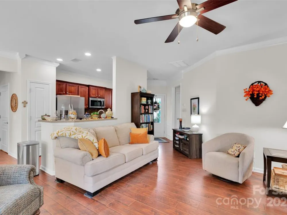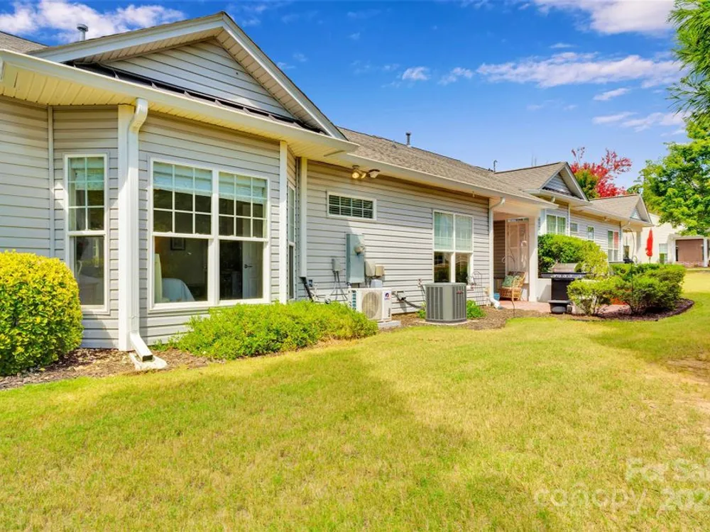 Welcome to this meticulously maintained 2-bedroom, 2-bath villa that’s truly move-in ready! Hardwood floors flow throughout the open, light-filled layout, creating a seamless connection between the kitchen, dining, and living areas. The kitchen is a standout, featuring new Frigidaire stainless steel gas range and over-the-range microwave, Corian countertops, and abundant cabinet space. This home has been thoughtfully upgraded for comfort and efficiency: a new HVAC system was installed in 2022, a highwall ductless heating/cooling split system (mini-split) was added in the garage in 2023, and a new water heater was installed in 2025. Custom blinds and Roman shades complete the stylish finishes throughout. The spacious primary suite boasts a walk-in closet and private ensuite bath, while the versatile secondary bedroom is ideal for guests or a home office. Step outside to enjoy your mornings and evenings on the covered patio overlooking the landscaped yard. Located in the highly desirable 55+ community of Sun City Carolina Lakes, this home gives you access to resort-style amenities including a golf course, clubhouse, indoor and outdoor pools, tennis and sports courts, walking trails, and lake activities. Convenient shopping, dining, and everyday essentials are just minutes away.