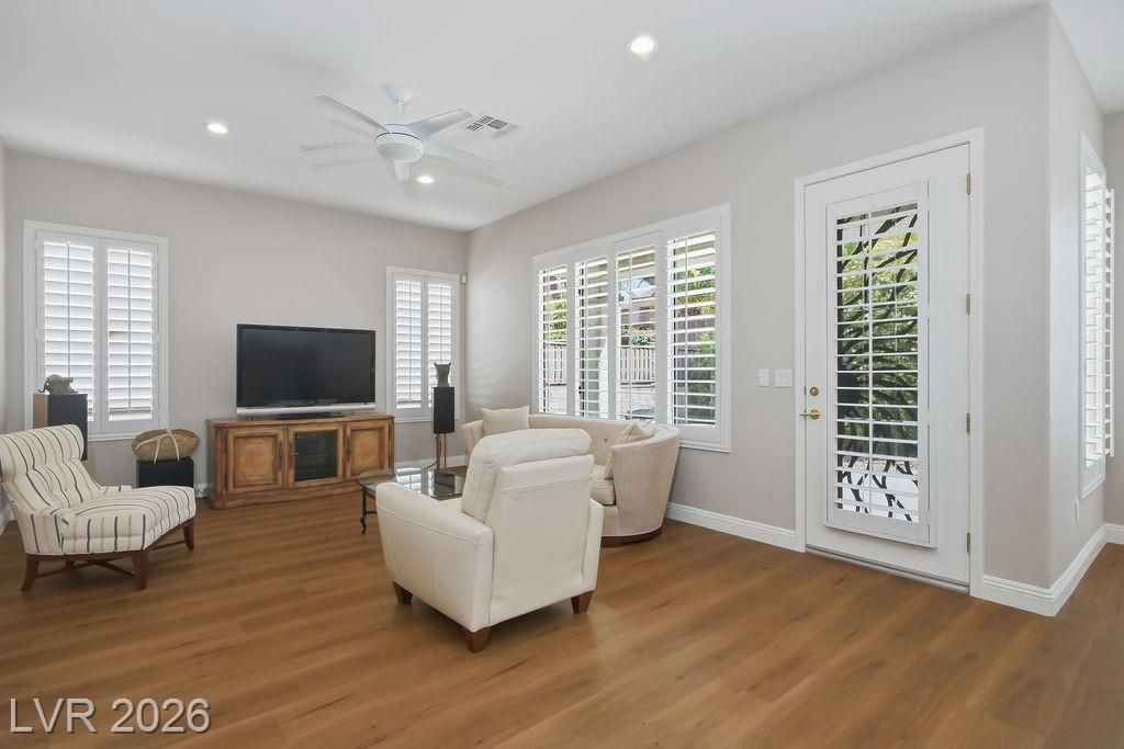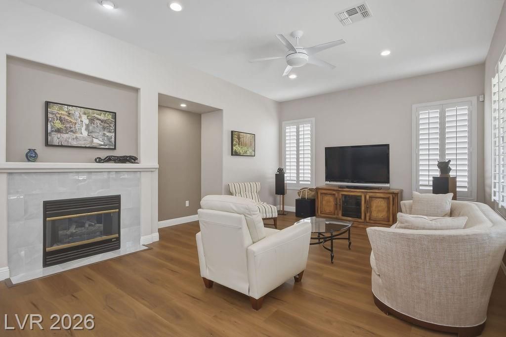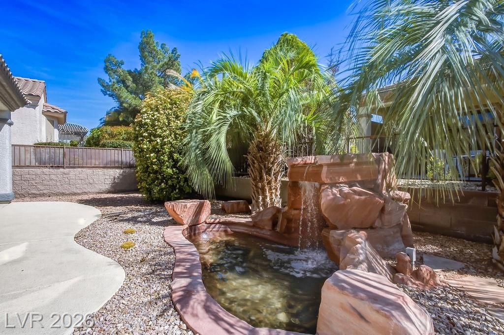 Nestled in the Northern enclave of age qualified Sun City Anthem, mere moments from the many shopping & dining choices along Eastern, this lovely home awaits it's new owner. Wonderfully landscaped yards create a peaceful place to welcome friends. A dramatic Foyer gives way to a massive Great Room & a bank of windows that bathe the space natural light. The kitchen offers upgraded appliances, refinished cabinets, a huge quartz island under a skylight that overlooks a separate Family Room. Plantation-style shutters allow as much light as you wish, and new, upgraded lighting fixtures set the mood for all occasions. Enjoy a bite at the oversize covered patio, or stroll the grounds that features a soothing custom sandstone pond & waterfall. Recent upgrades include new HVAC, fresh ext. paint and redone sprinklers. Additionally, luxury Vinyl Plank Flooring, upgraded electrical, whole-house water conditioner, & solar panels for clean energy for low & predictable energy costs.