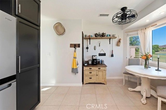 VIEWS OF THE GOLF COURSE, VIEWS OF THE LAKE,VIEWS OF THE MOUNTAINS! This fantastic home was Designer remodeled in 2024. It has NEW windows, interior paint, exterior paint, lighting, toilets, baseboards, rocker switches, blinds, and elevated washer and dryer, upper end LG stainless steel appliances. Also new granite counters , stainless steel large sink and faucet, Back splash in deco tiles, cabinets painted and glazed, new hinges and handles, pullouts and breakfast nook with a killer view. the is a new filtered water system, garbage disposal and ceiling fans, under cabinet lighting. TV/office room (3rd bedroom) has a built-in desk(closet is removed) and tv mount. Large primary suite with dual vanity, large shower and slider to front patio, as well as a walk in closet and ceiling fan. There is tile throughout the house except bedrooms with carpet. Primary living areas have cathedral ceilings. Water heater and AC replaced in the past 3-4 year. The tile roof was redone with new 2 ply paper in 2024. The 2 car garage has built in shelves, and attic storage. Astro turf front yard, paver walks and accents. The property has easy to maintain landscaping and plants. All of this PLUS it is located the Palmilla 55+ community, with a community pool/spa, as well as you have access to plus the nearby Beach & Swim Club featuring a sandy, resort-style pool with private cabanas, BBQs, and even a waterslide. Menifee Lakes is filled with free concerts in the park, breathtaking sunsets over the water and annual celebrations and parades. Golfers will love the Menifee Lakes Golf Course, the valley’s only 36-hole golf facility with two championship courses. Don't miss out on this turnkey opportunity!