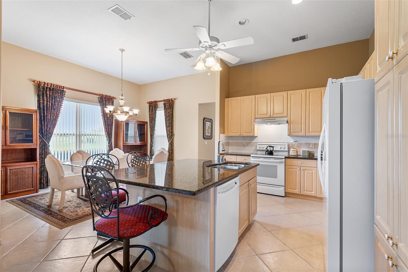 - Ceiling Fan(s), Central Vacuum, Eat-in Kitchen, High Ceilings, Kitchen/Family Room Combo, L-Shaped Dining Room, Open Floorplan, Main Level Primary, Solid-Wood Cabinets, Stone Counters, Thermostat, Walk-In Closet(s)