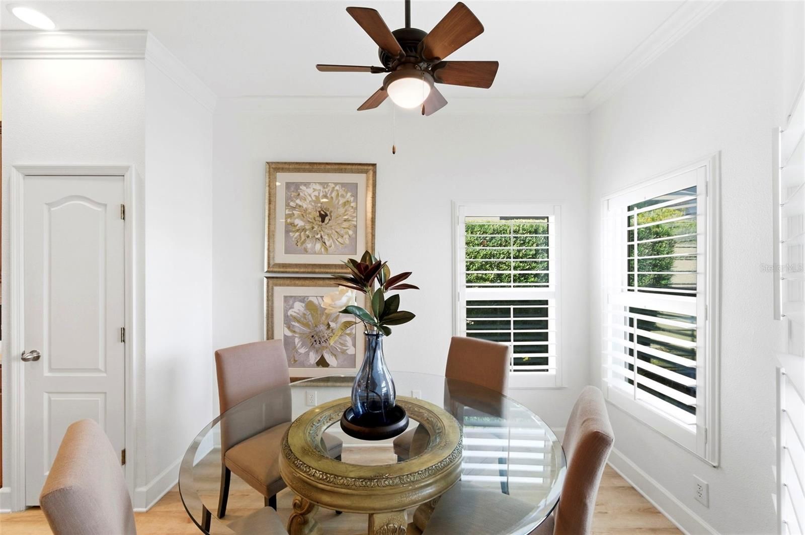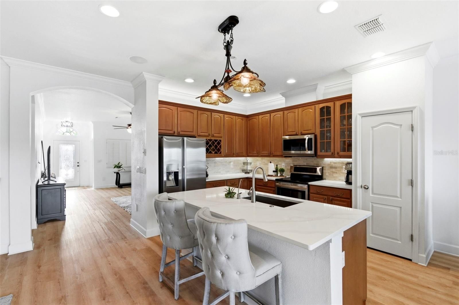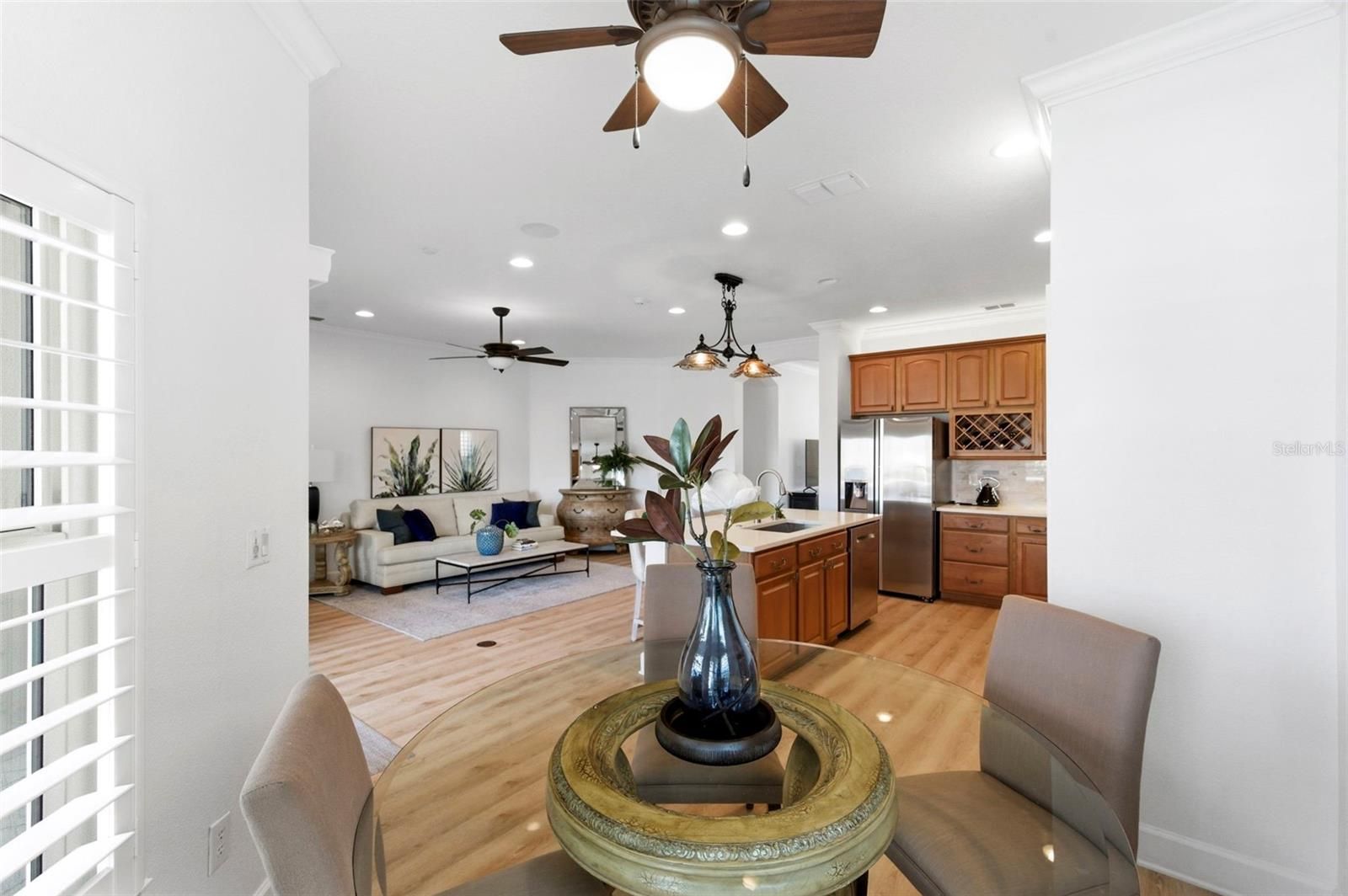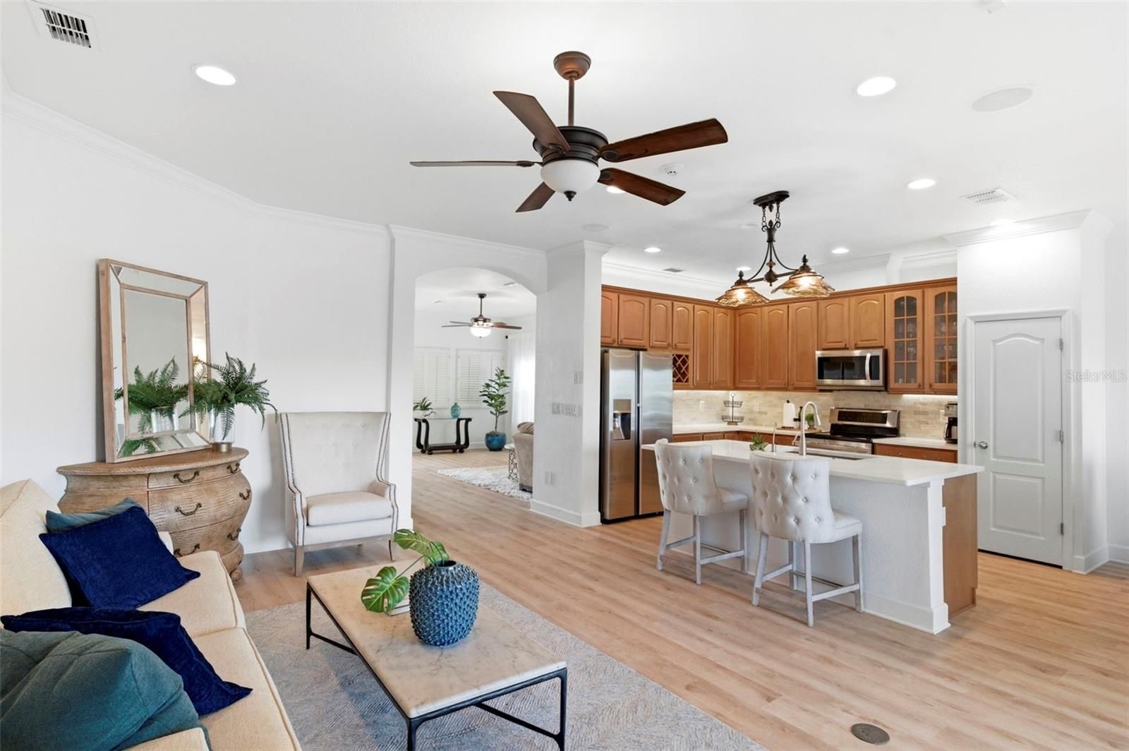 Welcome home to 2817 Plantain Dr! This beautifully maintained home, located inside the gated 55+ Key Vista Villas community, is perfectly situated between two preservation areas teeming with awe-inspiring Florida wildlife. Inside, the home shows like a model with soaring ceilings, crown molding, wide-plank luxury vinyl flooring, and an abundance of natural light throughout. The open layout creates an airy, tranquil feel that seamlessly blends indoor and outdoor living. The kitchen is both functional and stylish, featuring granite countertops, rich wood cabinetry, stainless steel appliances, a large single-basin stainless sink, updated lighting, and a generous island perfect for gathering. The adjacent living and dining areas flow effortlessly toward the expansive sliding glass doors, drawing your eye to the private screened lanai and sparkling heated pool: the true centerpiece of the property. With a gas pool heater added in 2025, the pool can reach temps as high as 105º, transforming it into your very own year-round spa-oasis! The covered outdoor seating area overlooks peaceful water views, creating a serene backdrop for entertaining or quiet mornings. The spacious primary suite offers a true retreat with high ceilings, ample natural light, and direct access to the lanai. The en-suite bath is upgraded and well-appointed, and the walk-in closet includes custom built-ins for organized storage. Secondary bedrooms are bright and welcoming, ideal for guests or a home office. Hurricane-resistant windows and an 8-foot sliding glass door provide added peace of mind, while plantation shutters add timeless character. Additional features include a central vacuum system, whole-house stereo system, and newer appliances, including a washer and dryer. The home sits in Flood Zone X, approximately 20 feet above sea level, with no flood insurance required and no impact from recent storms. HOA fees are collectively under $350/month and include lawn care, exterior house painting, cable, internet, and waste collection, offering a low-maintenance lifestyle. Residents enjoy access to two clubhouses, including a master clubhouse with tennis and pickleball courts, a fitness center, a pool, a hot tub, and social spaces. A private boat and RV storage lot is available, subject to availability. Just a short walk away is Key Vista Nature Park with sandy walking trails and Gulf access, and the Pinellas Trail runs just beyond the back gate, providing miles of paved paths. Nearby Anclote Gulf Park, Anclote River Park, and the Ben Harrill Recreation Complex offer even more recreational options. This home combines thoughtful upgrades, peaceful water views, and resort-style amenities in one of the area’s most desirable active adult communities. Book your showing today!